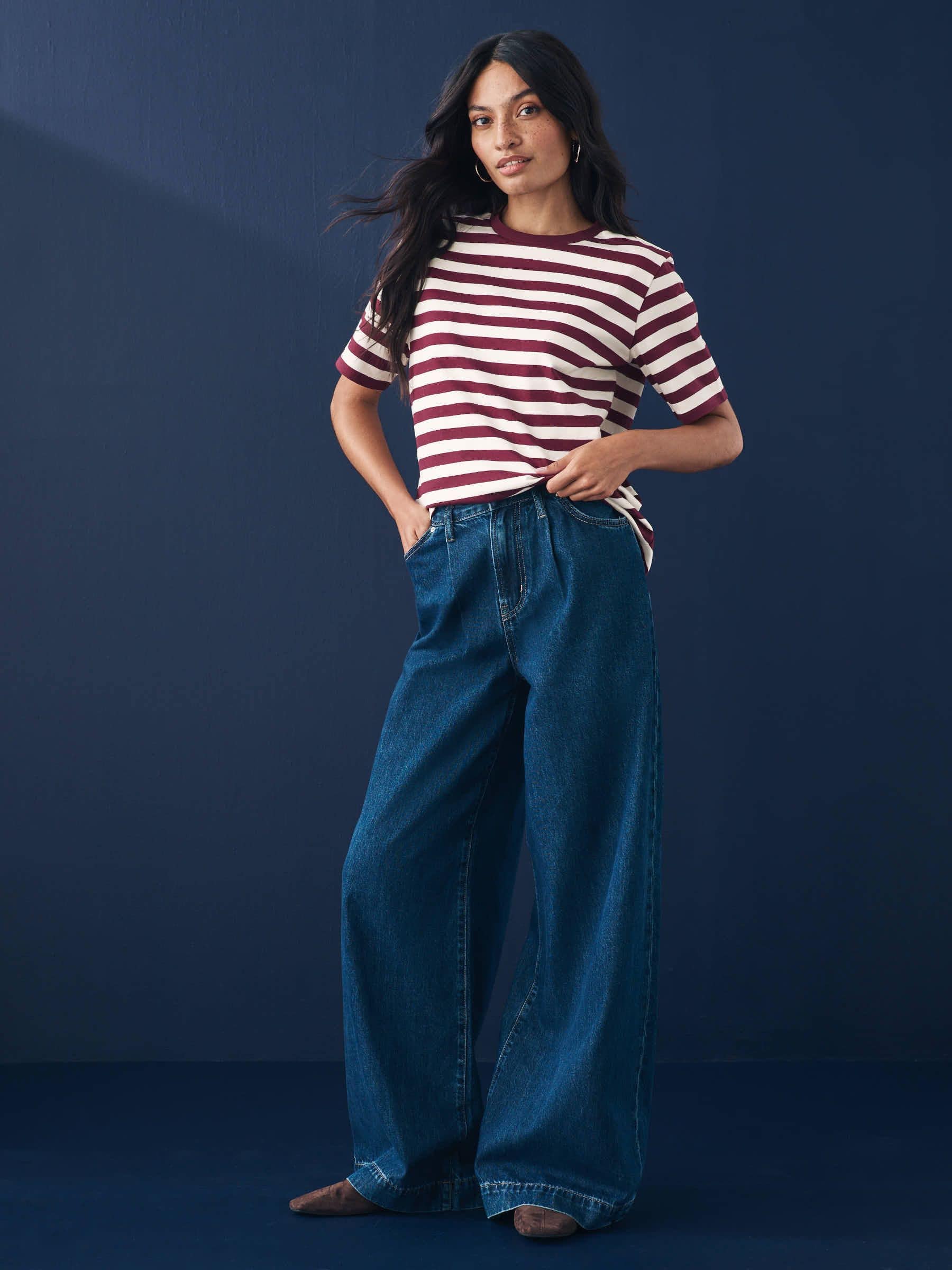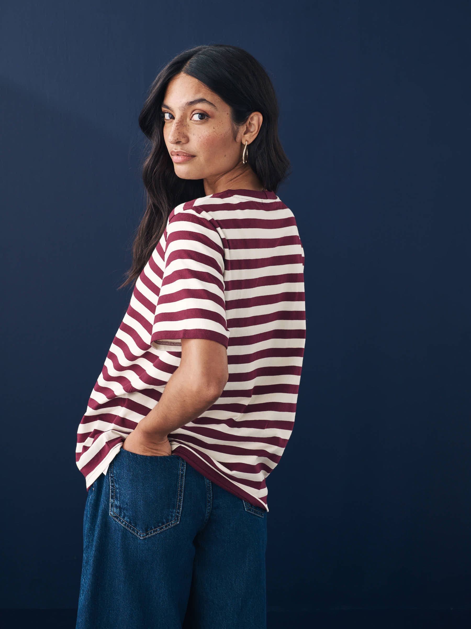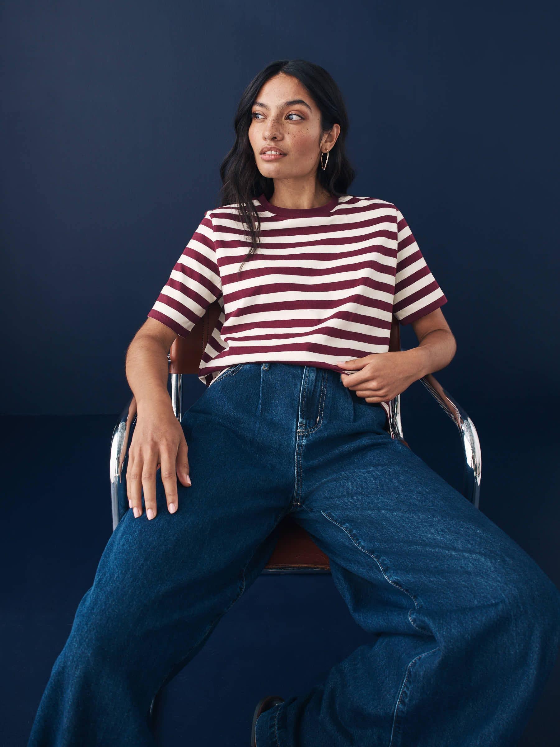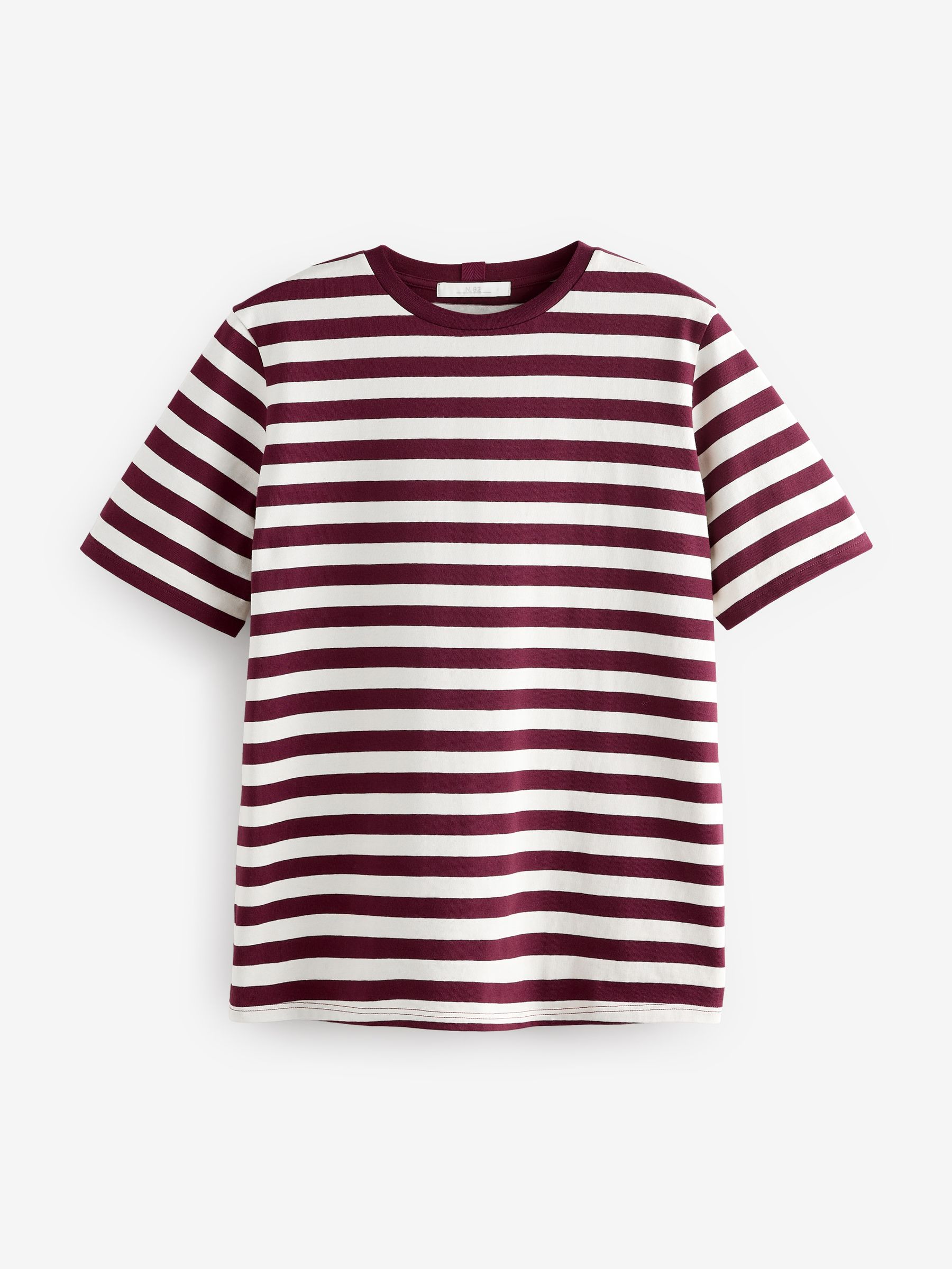 This short sleeve t-shirt is made from pure cotton in a heavy weight, featuring a berry red and ecru striped design and a ribbed crewneck collar. Perfect for layering with a casual or smart casual outfit. Regular fit 100% cotton Heavyweight Ribbed crewneck collar 100% Cotton. Items with the curve logo are available in sizes 18 and above., Better Cotton – By choosing our cotton products, you’re supporting our investment in Better Cotton’s mission to help cotton farming communities survive and thrive while protecting and restoring the environment. This product is sourced via a system of mass balance and therefore may not contain Better Cotton. Learn more at www.next.co.uk/better-cotton