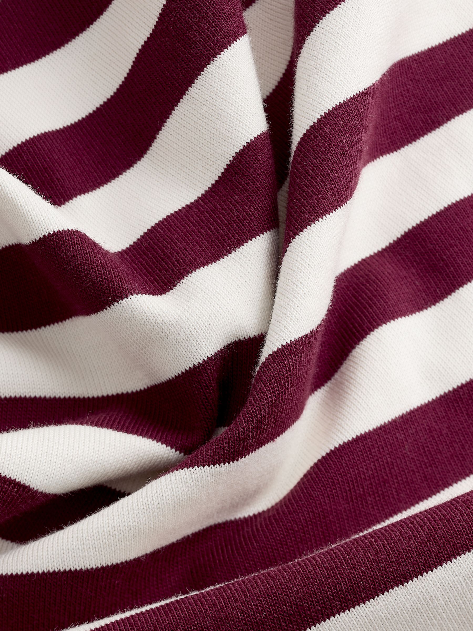 This short sleeve t-shirt is made from pure cotton in a heavy weight, featuring a berry red and ecru striped design and a ribbed crewneck collar. Perfect for layering with a casual or smart casual outfit.