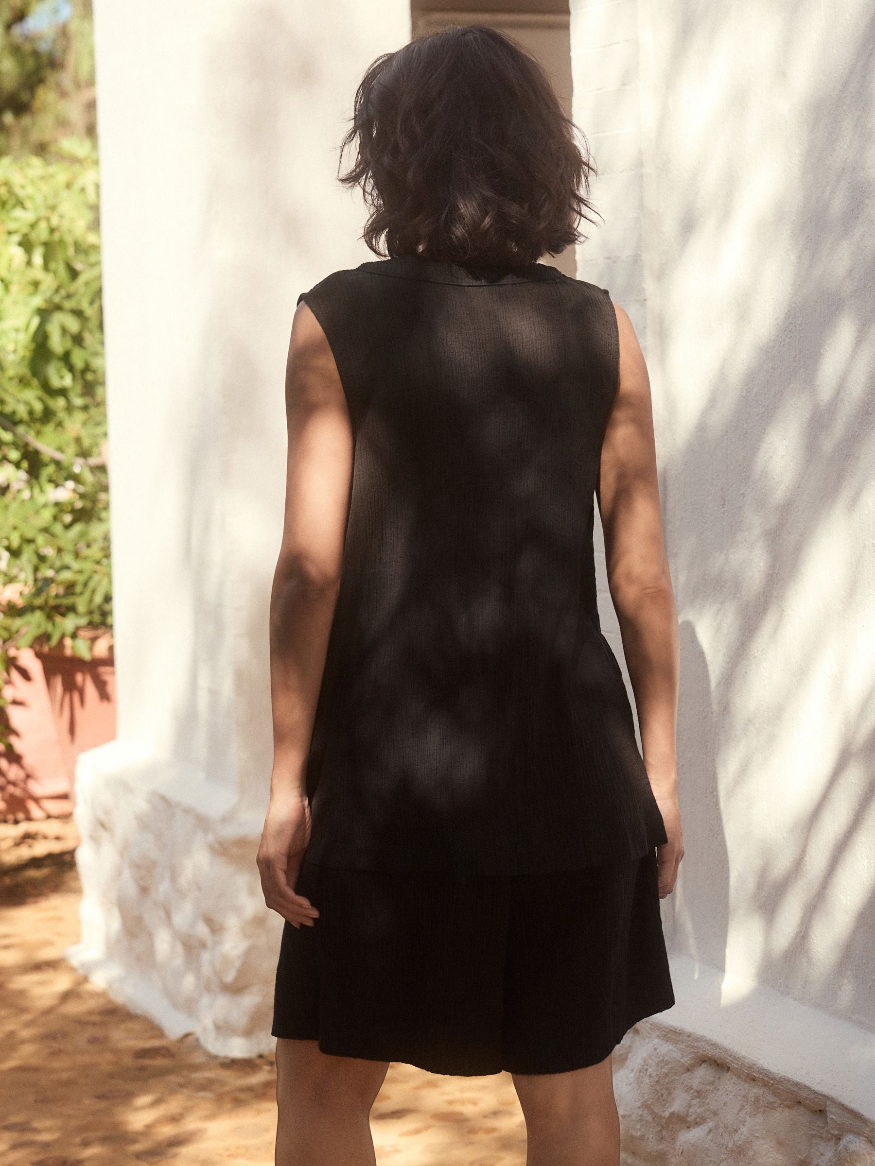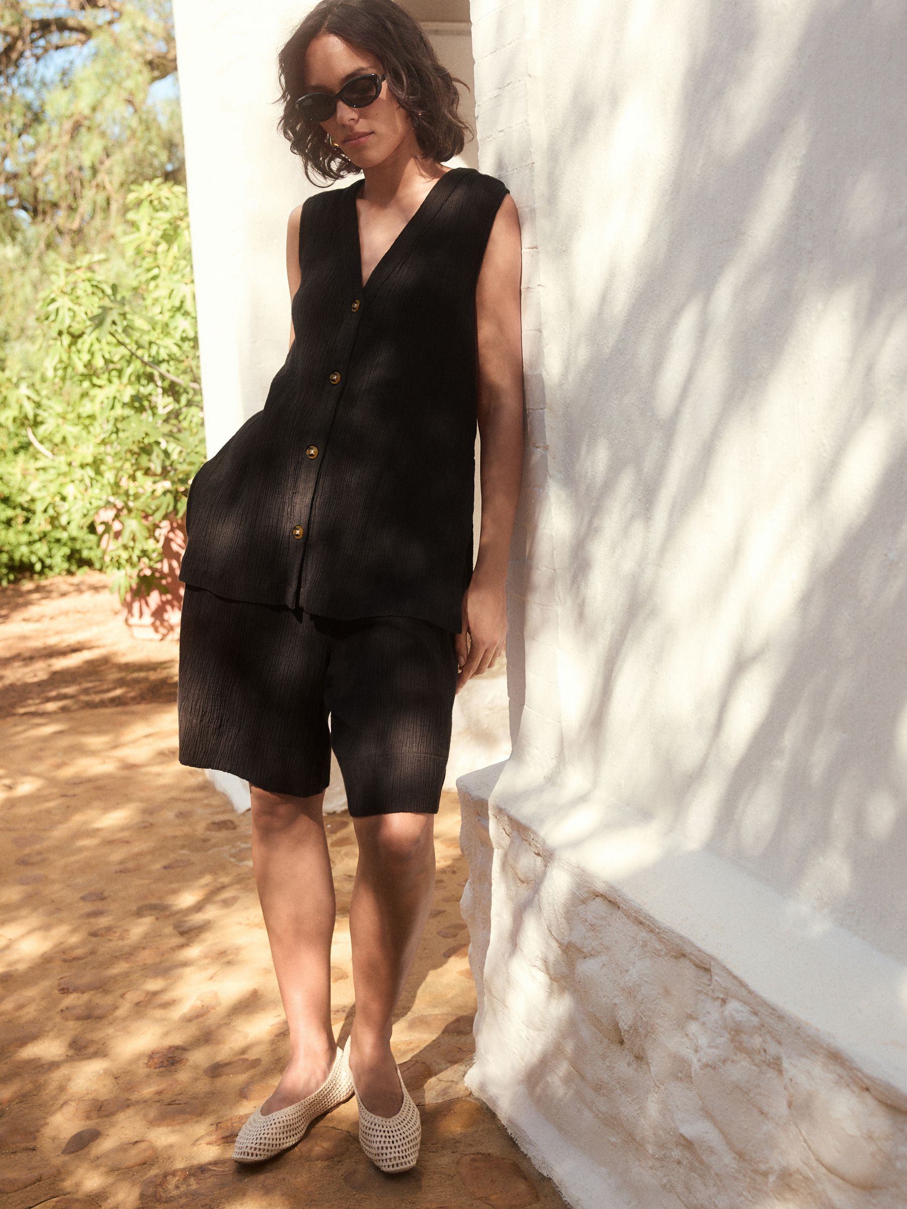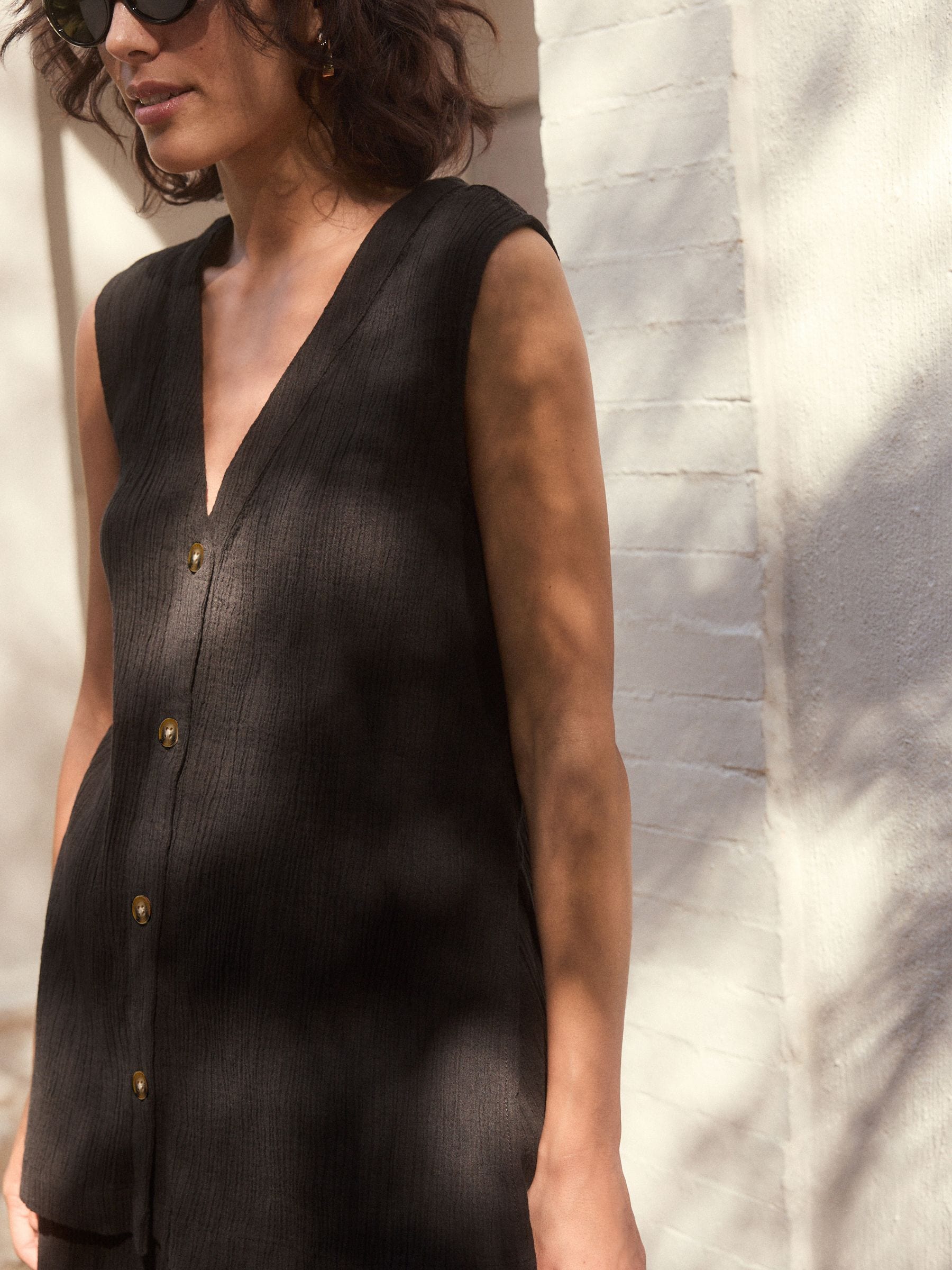 Elevate your warm-weather wardrobe with this textured vest. The linen-blend fabric features a unique crinkle finish, while the boxy fit and V neckline offer a modern silhouette. A split hem adds a touch of detail, making this piece perfect for layering or wearing on its own.