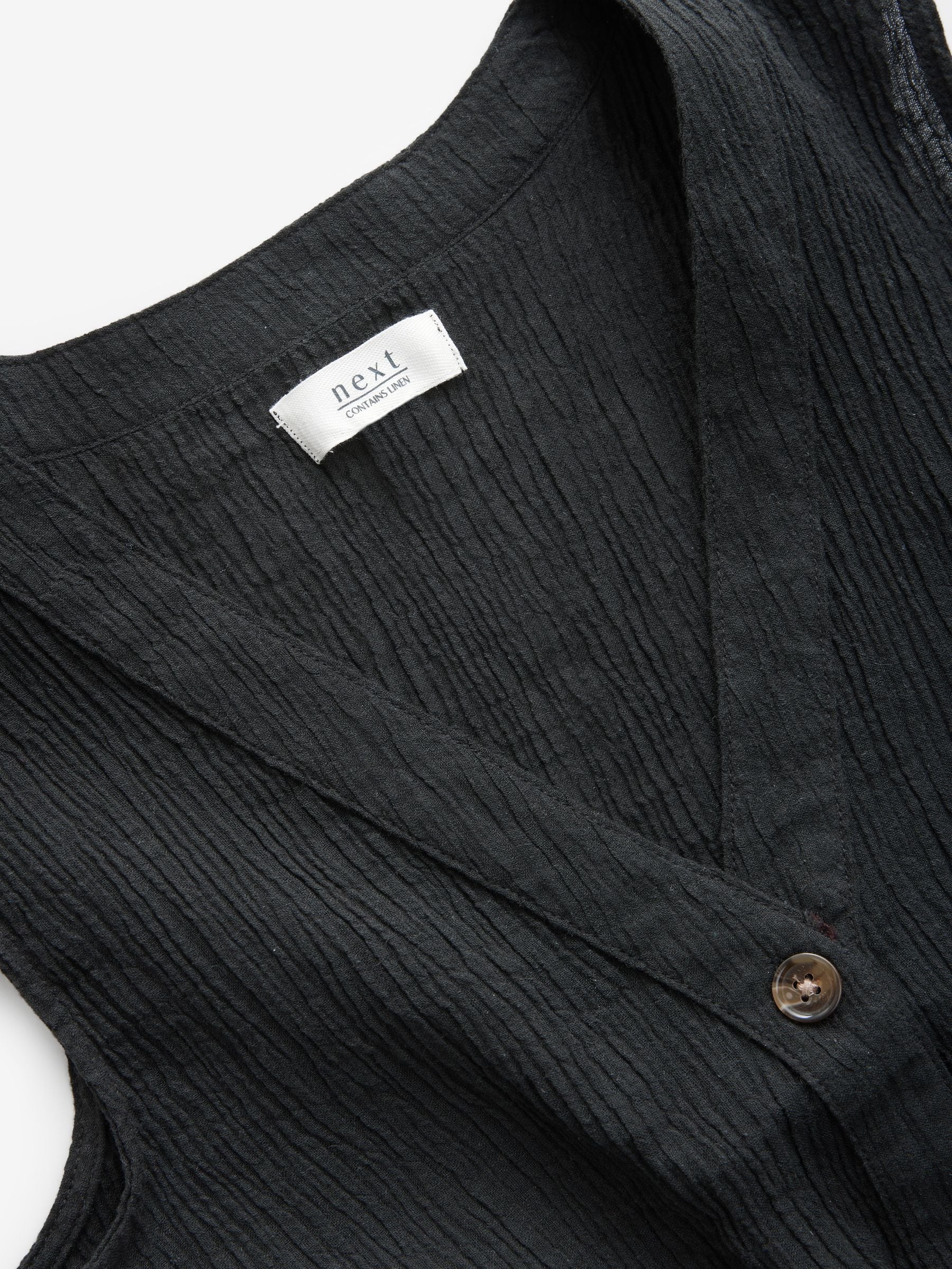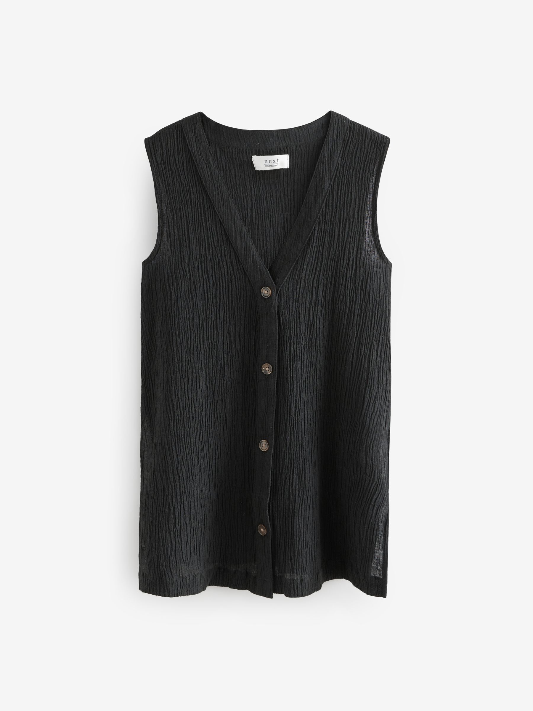 Elevate your warm-weather wardrobe with this textured vest. The linen-blend fabric features a unique crinkle finish, while the boxy fit and V neckline offer a modern silhouette. A split hem adds a touch of detail, making this piece perfect for layering or wearing on its own. Crinkle texture Linen-blend Boxy fit V neckline Split hem Washable. 65% Cotton, 35% Linen. Items with the curve logo are available in sizes 18 and above.
