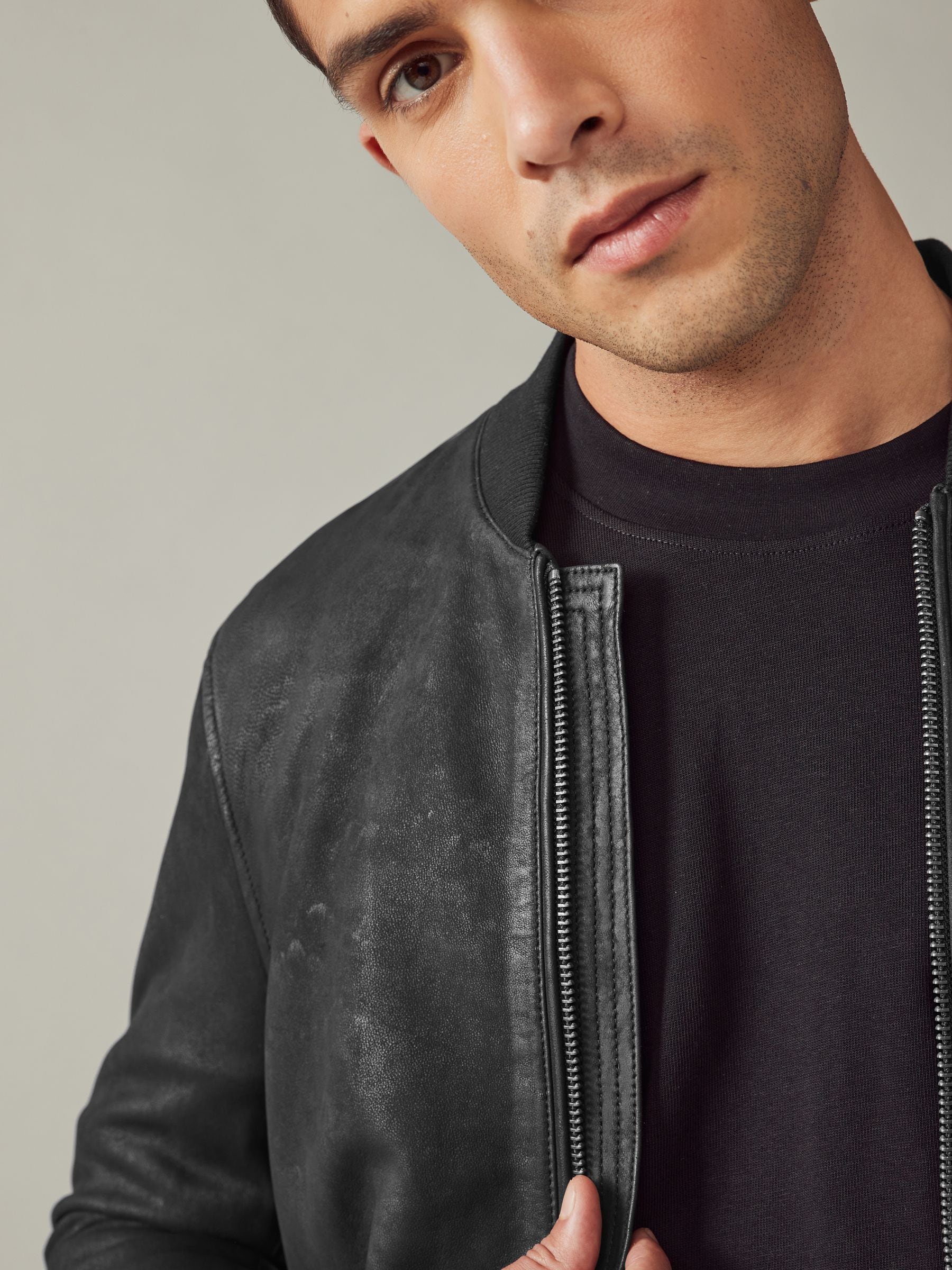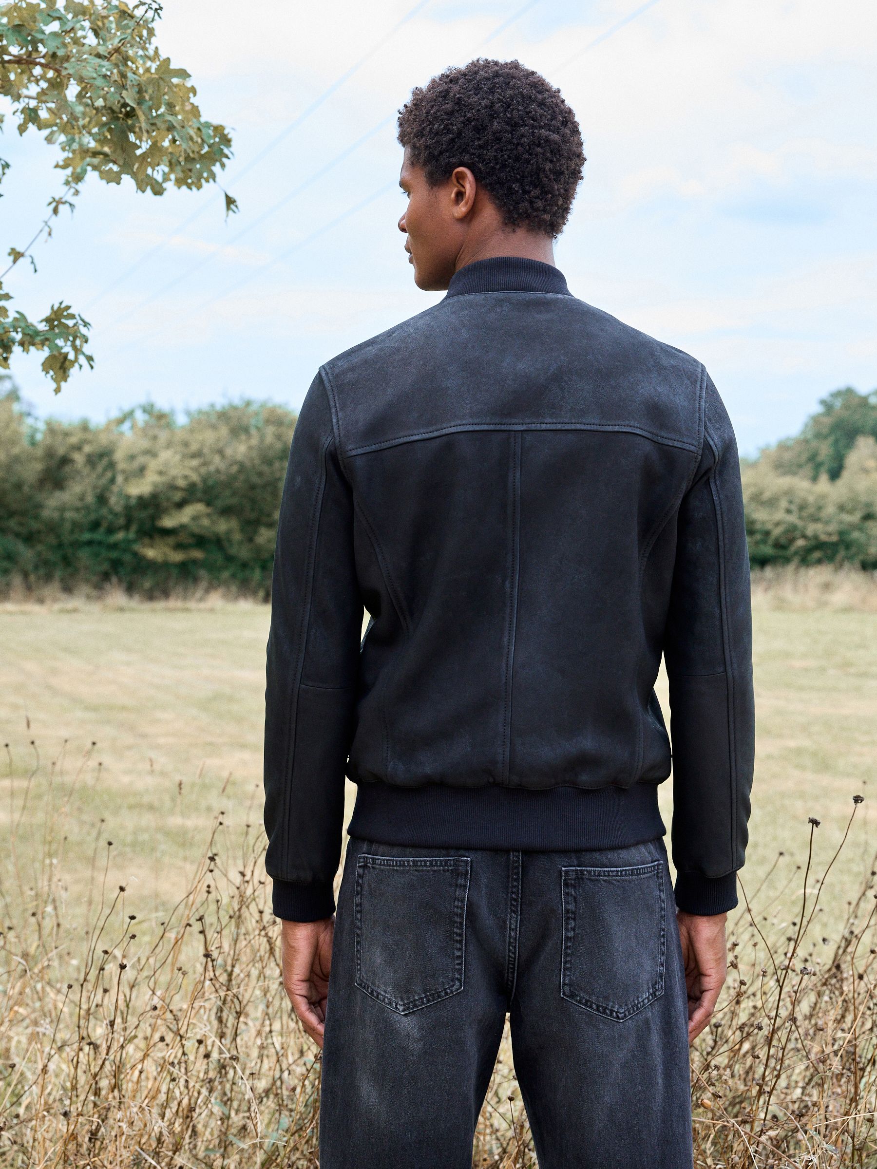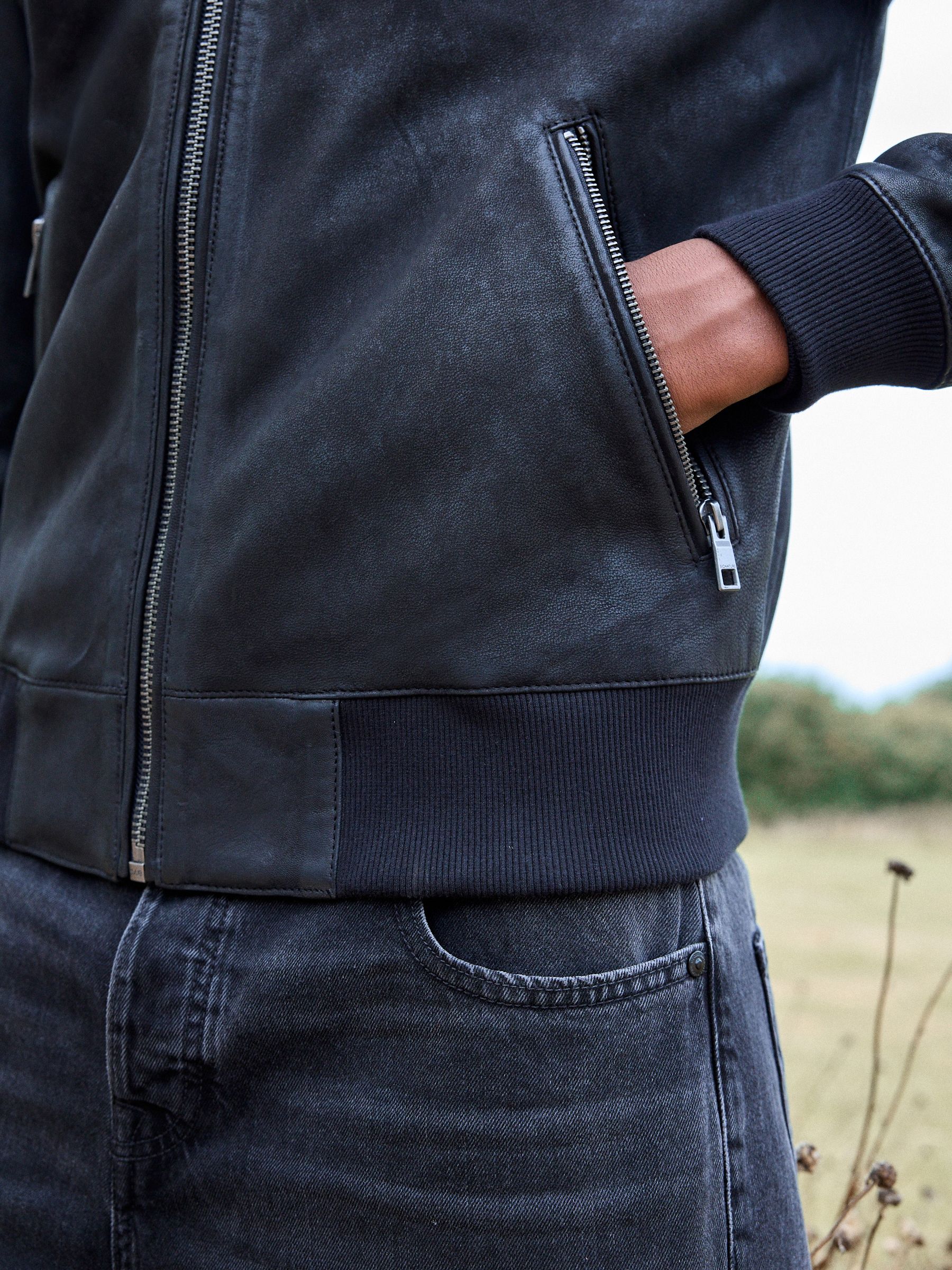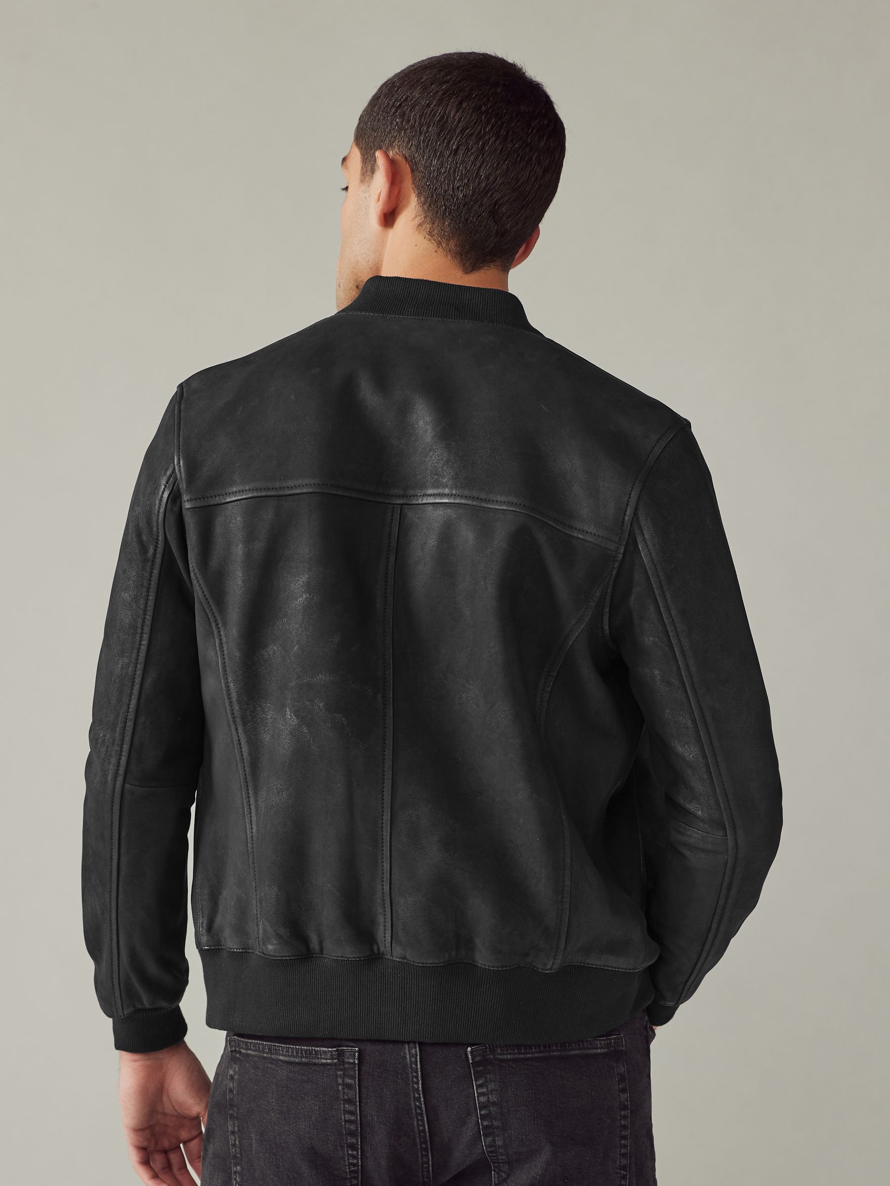 This classic bomber jacket gets a premium upgrade, featuring a Nubuck leather construction, a zip fastening and a ribbed collar, with zip hand pockets, finished with ribbed hems and sleeve cuffs. Nubuck leather Bomber style Zip fastening Zip pockets Ribbed cuffs Outer 100% Nubuck. Lining 53% Viscose, 47% Polyester. Rib 97% Polyester, 3% Elastane.