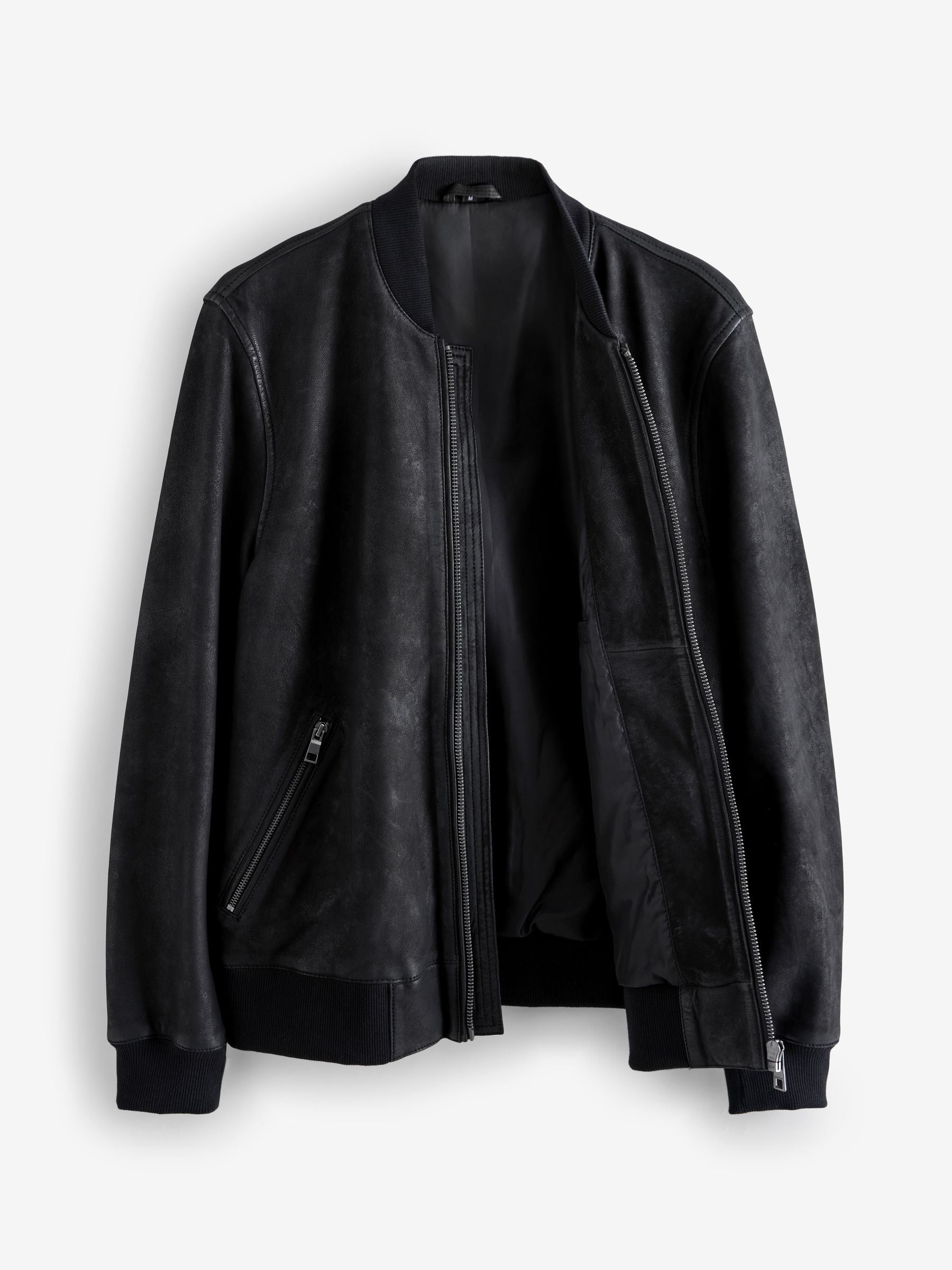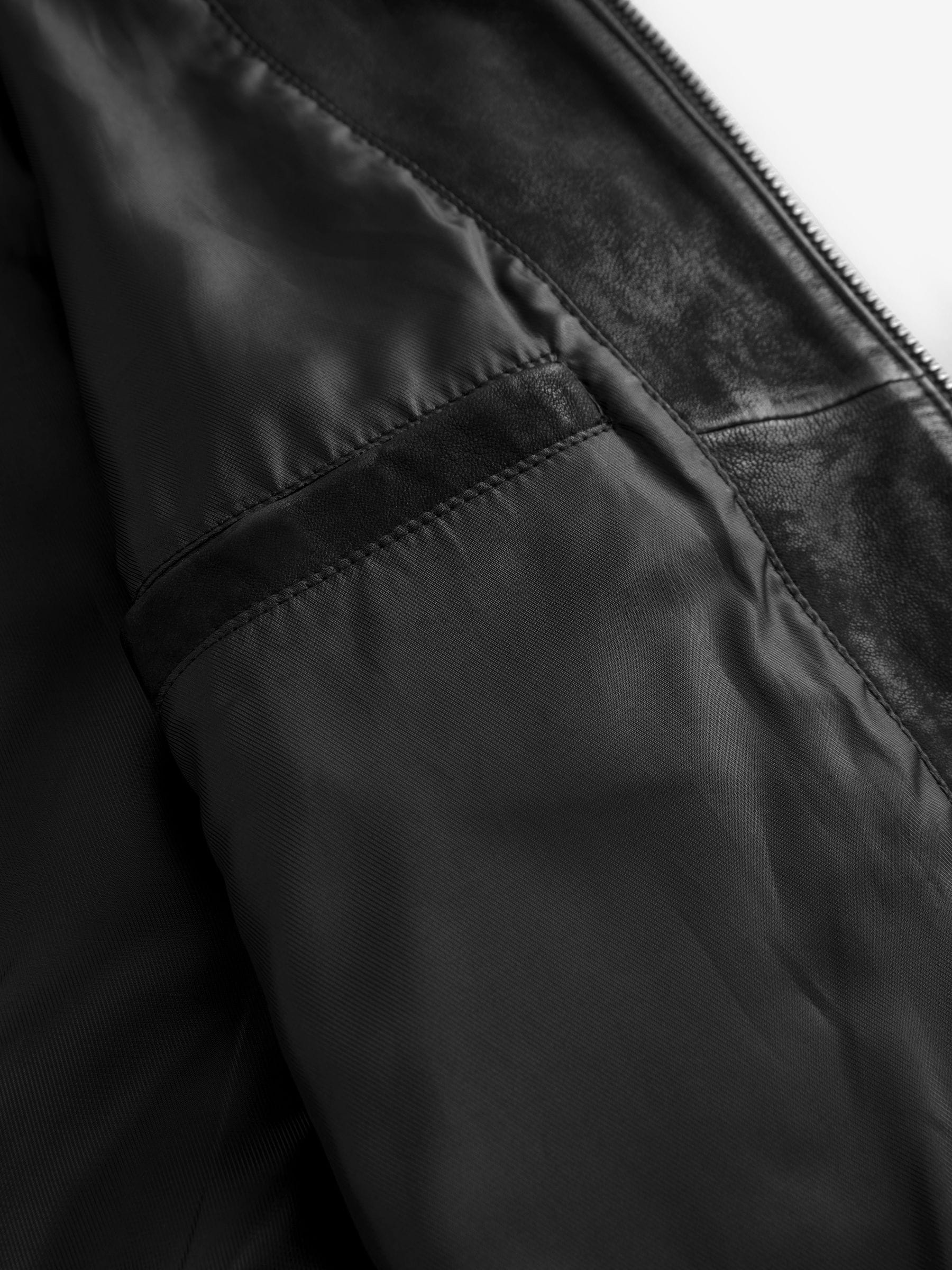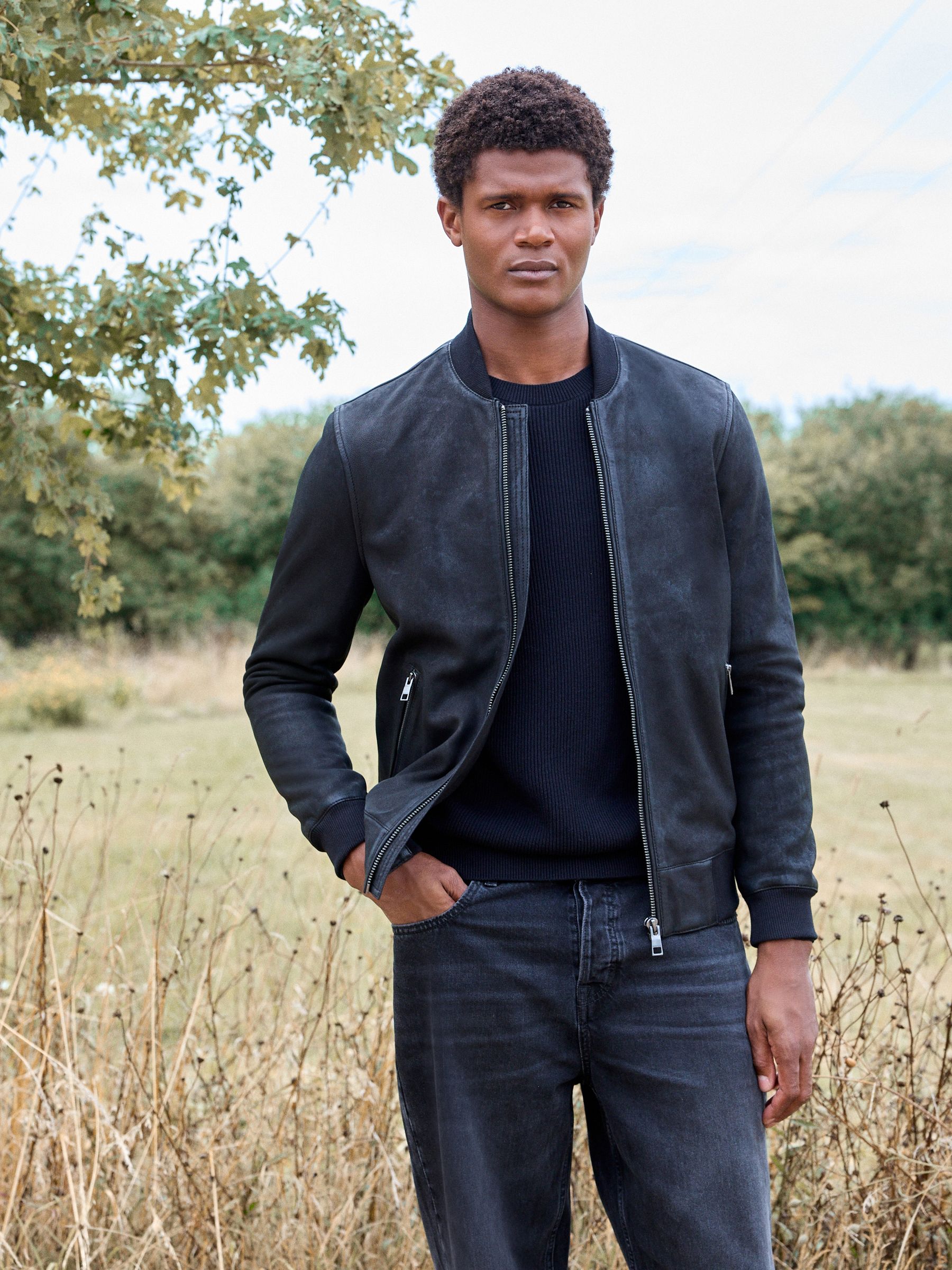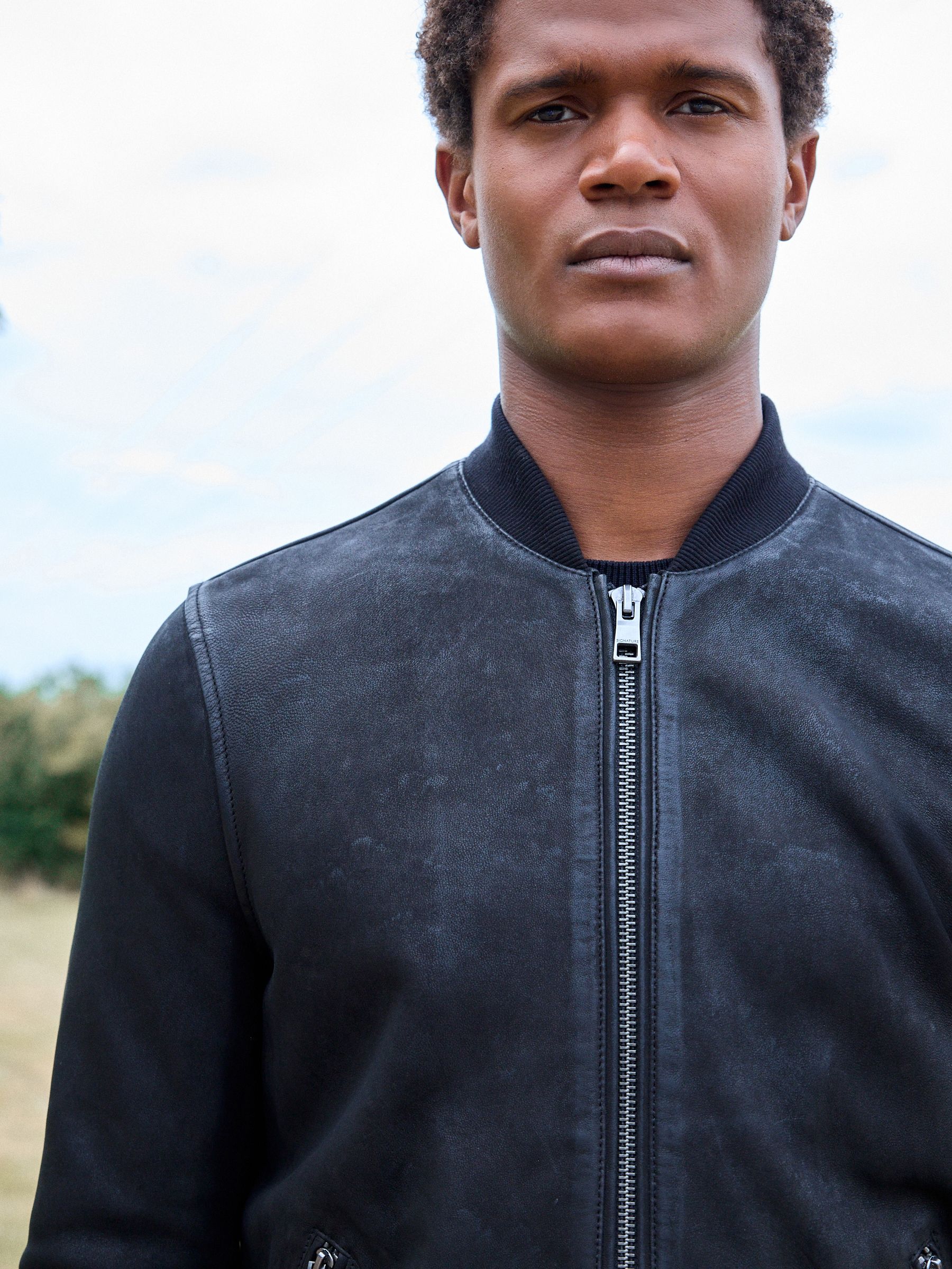 This classic bomber jacket gets a premium upgrade, featuring a Nubuck leather construction, a zip fastening and a ribbed collar, with zip hand pockets, finished with ribbed hems and sleeve cuffs. Nubuck leather Bomber style Zip fastening Zip pockets Ribbed cuffs Outer 100% Nubuck. Lining 53% Viscose, 47% Polyester. Rib 97% Polyester, 3% Elastane.