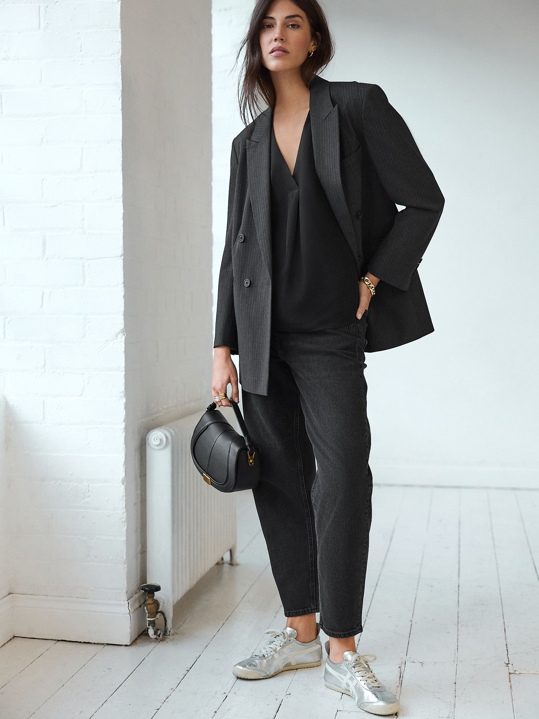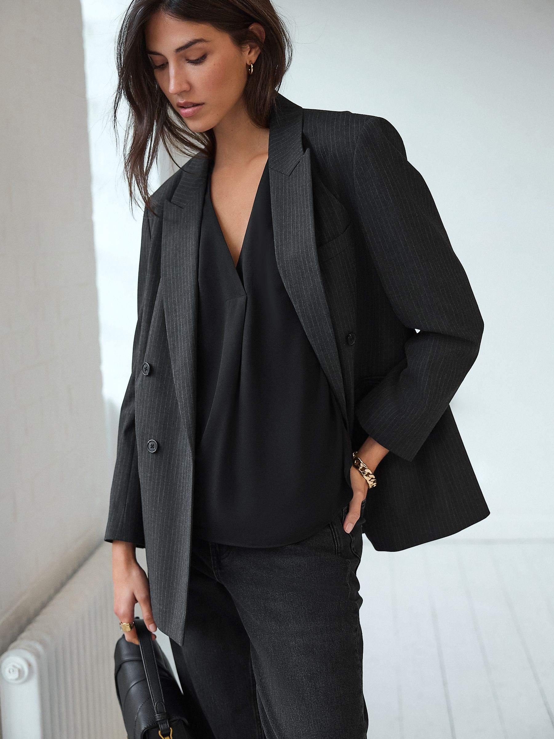 Elevate your office or weekend look with our black short sleeve overhead blouse. Cut with a V-neckline, in a relaxed fit, this versatile blouse is a classic everyday essential. Featuring a curved hem and cuffed sleeve detail, style with dark denim and a heel for effortless appeal.