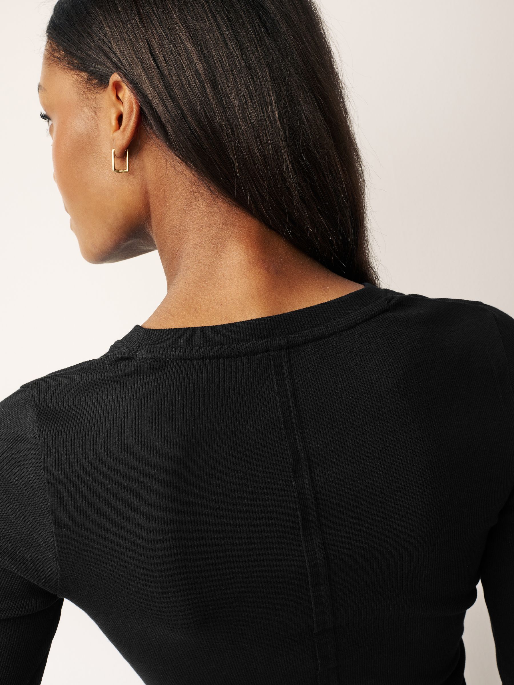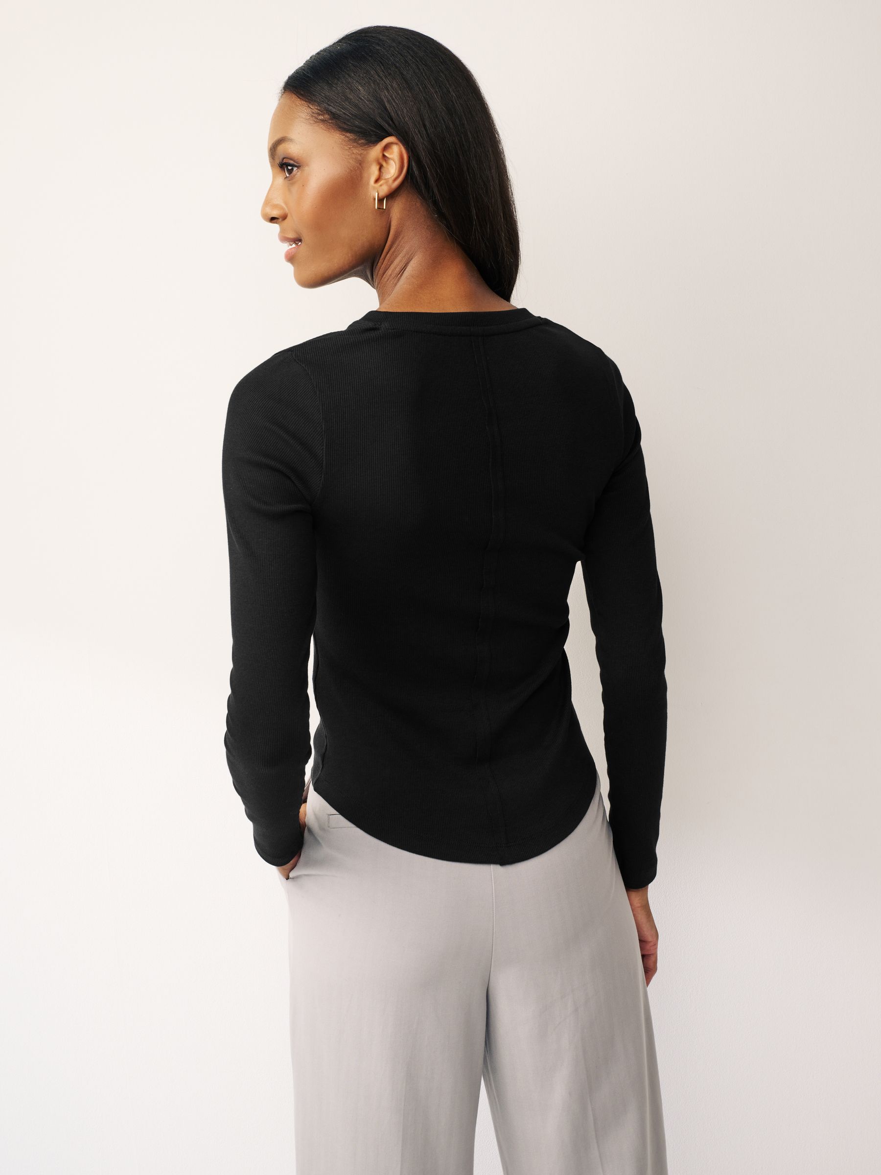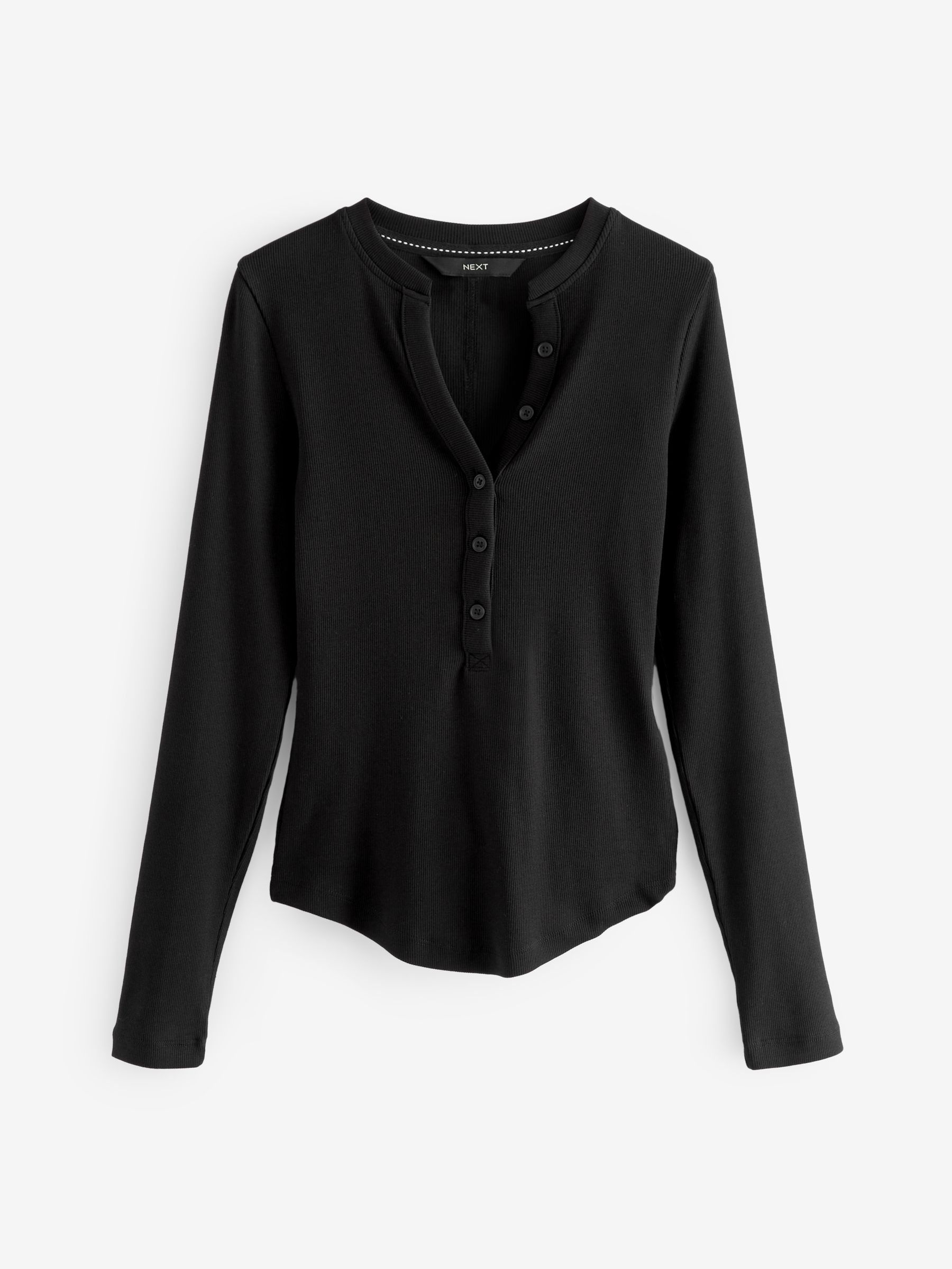 This classic black top is made from a cotton-rich fabric with a slight stretch and a slim fit, boasting a ribbed all-over design with a button detail Henley collar, finished with stitched detailing to the back and long sleeves. Regular, slim fit Cotton-rich fabric Ribbed design Henley collar Button detail Stitched back detailing Long sleeves Machine washable. 95% Cotton, 5% Elastane. Items with the curve logo are available in sizes 18 and above.