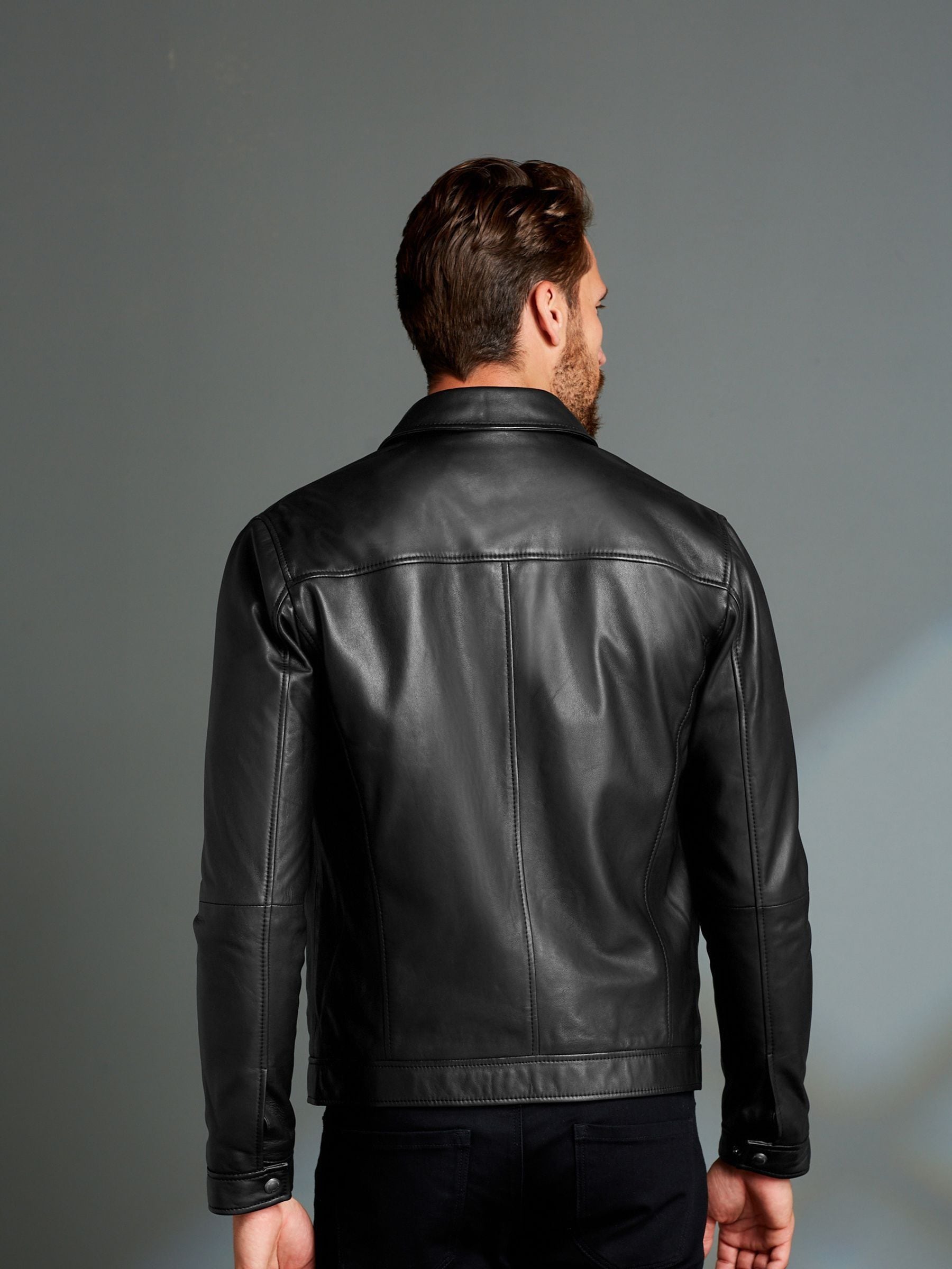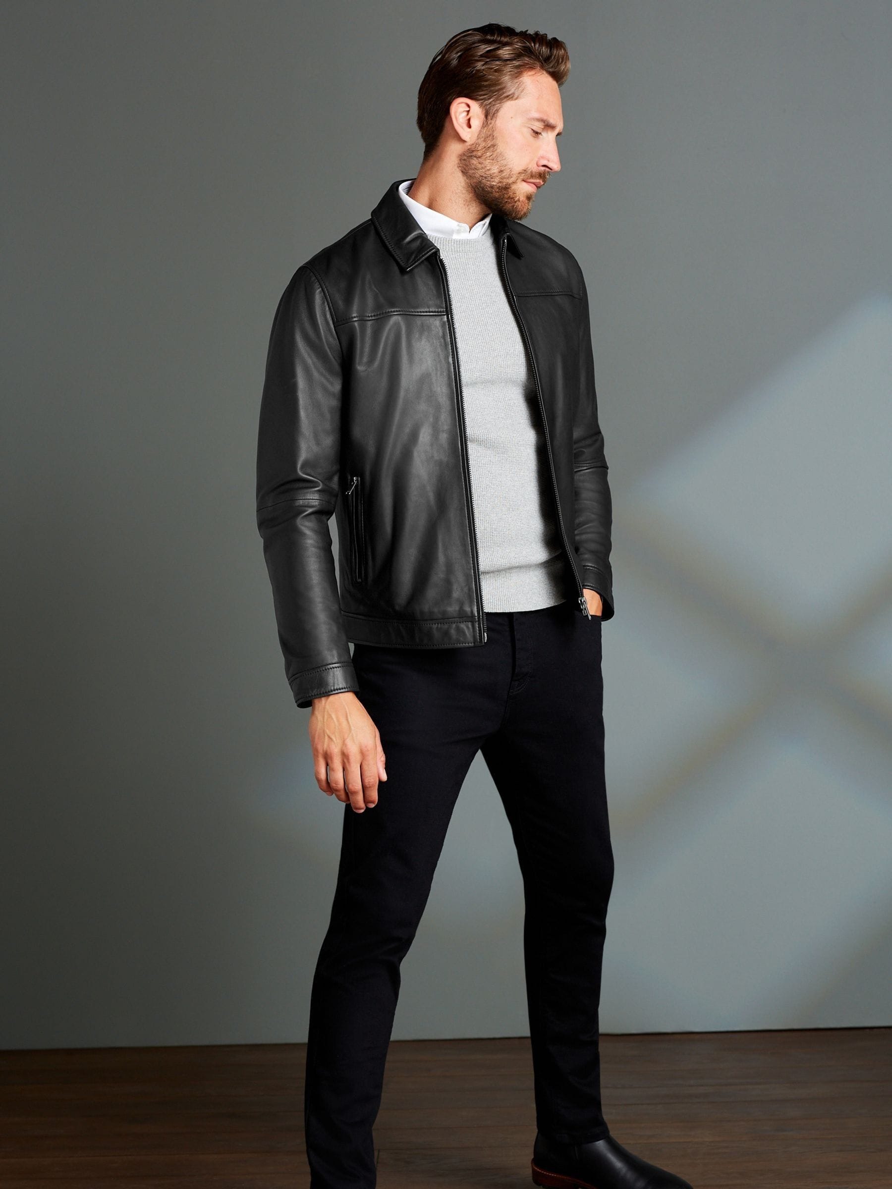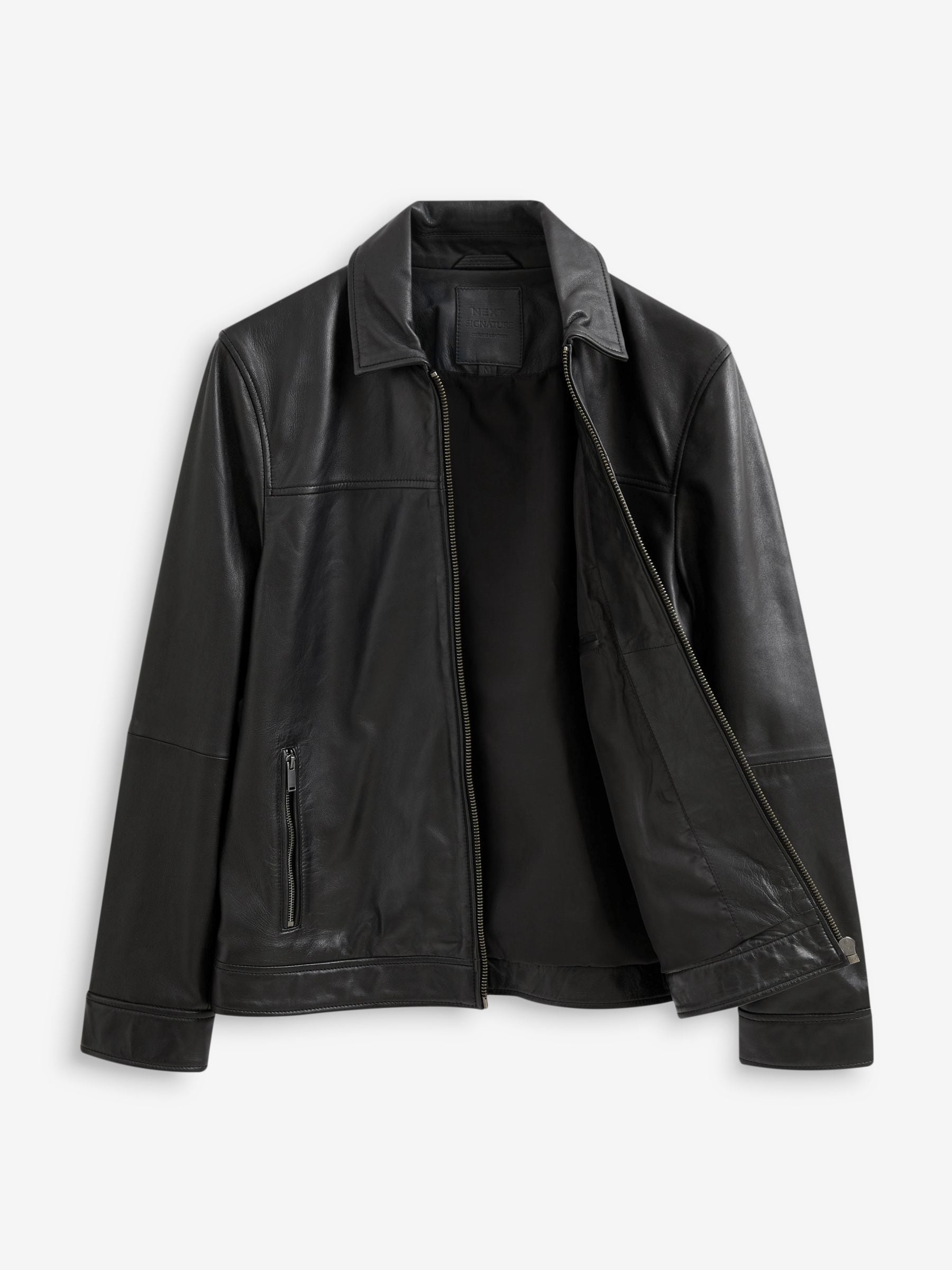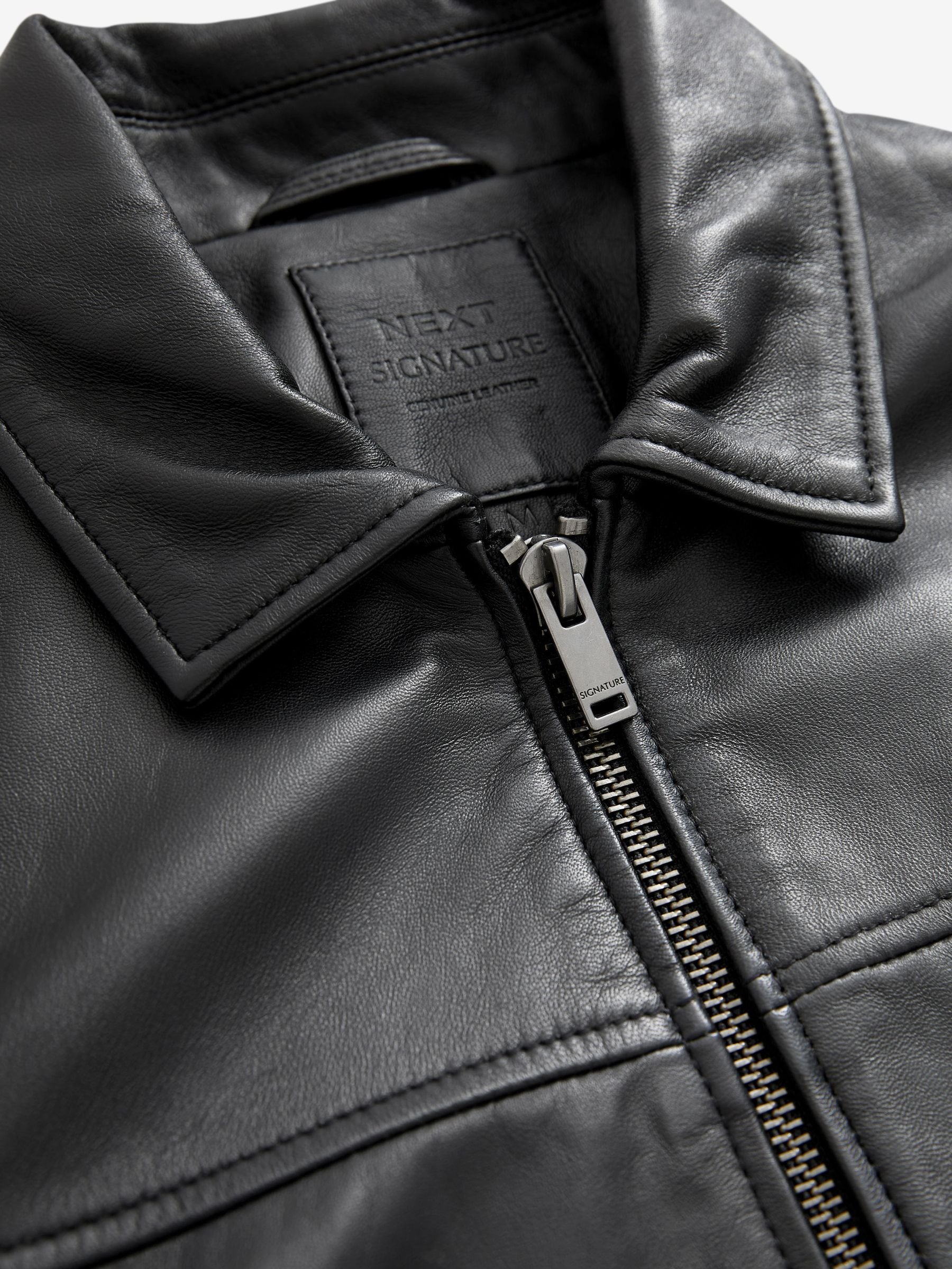 Chanel your inner style icon with our Signature black leather collared jacket. Part of our Signature range, this piece is crafted from soft leather with two zipped pockets, a zip through front and finished with a smart collar. Modern, with a heavy dose of style. Signature soft leather Two functional zipped pockets Collar Zip through front fastening Snap buttoned cuffs Specialist dry clean. Main 100% Leather. Lining 53% Viscose, 47% Polyester.