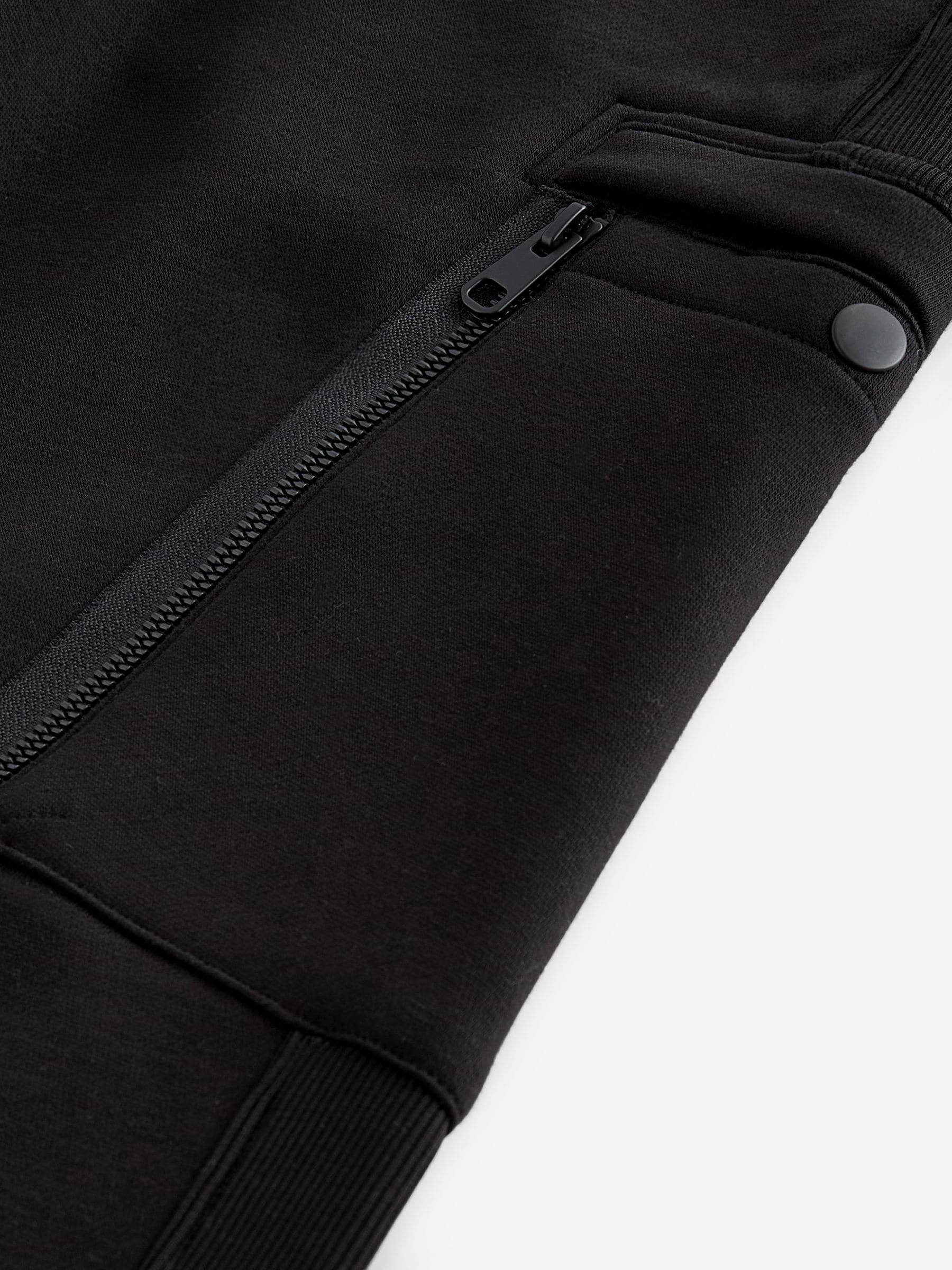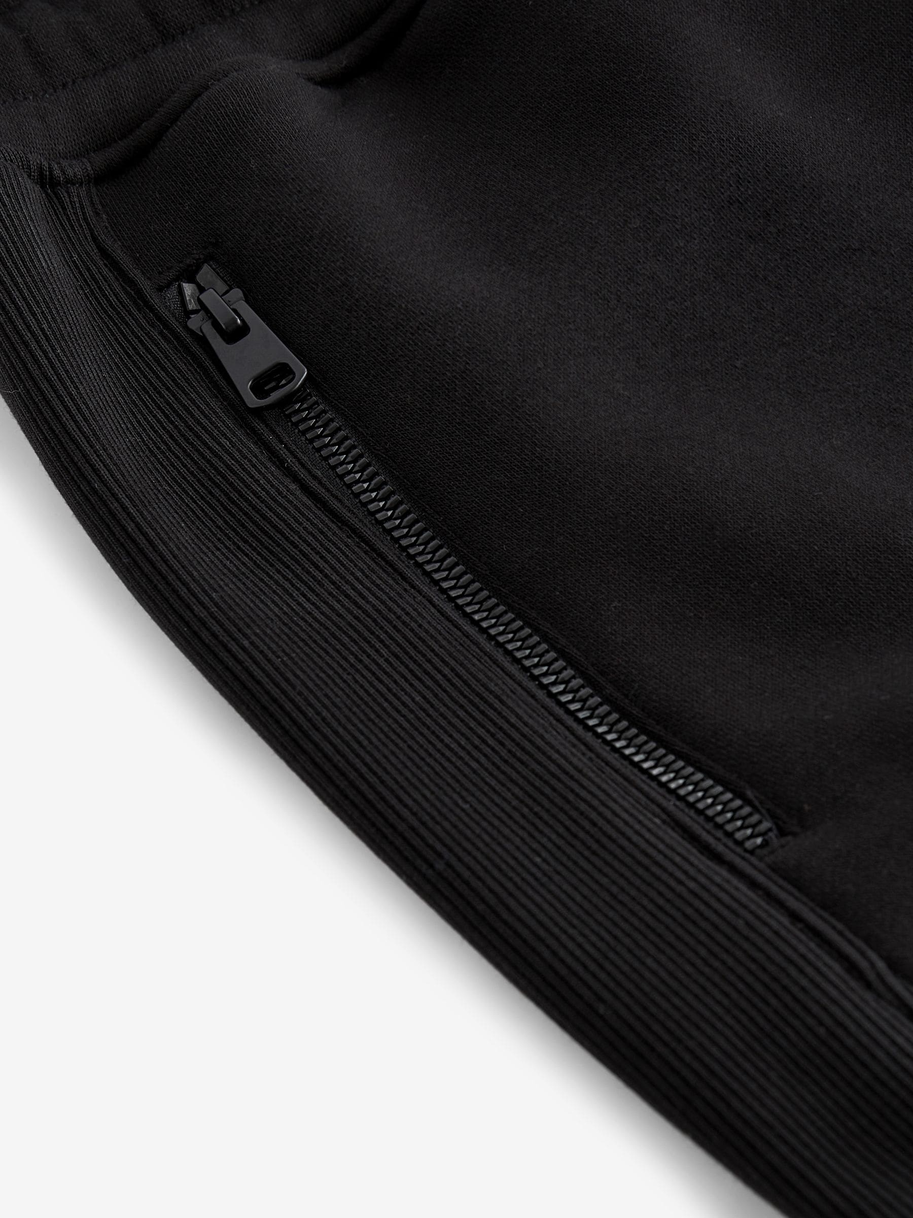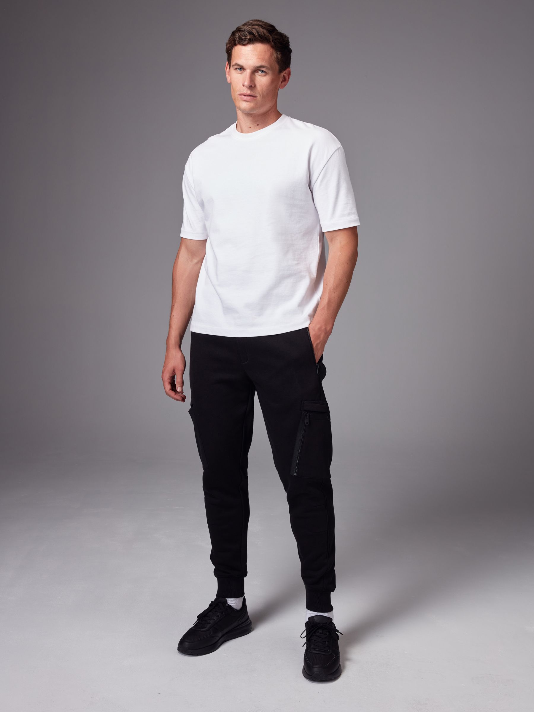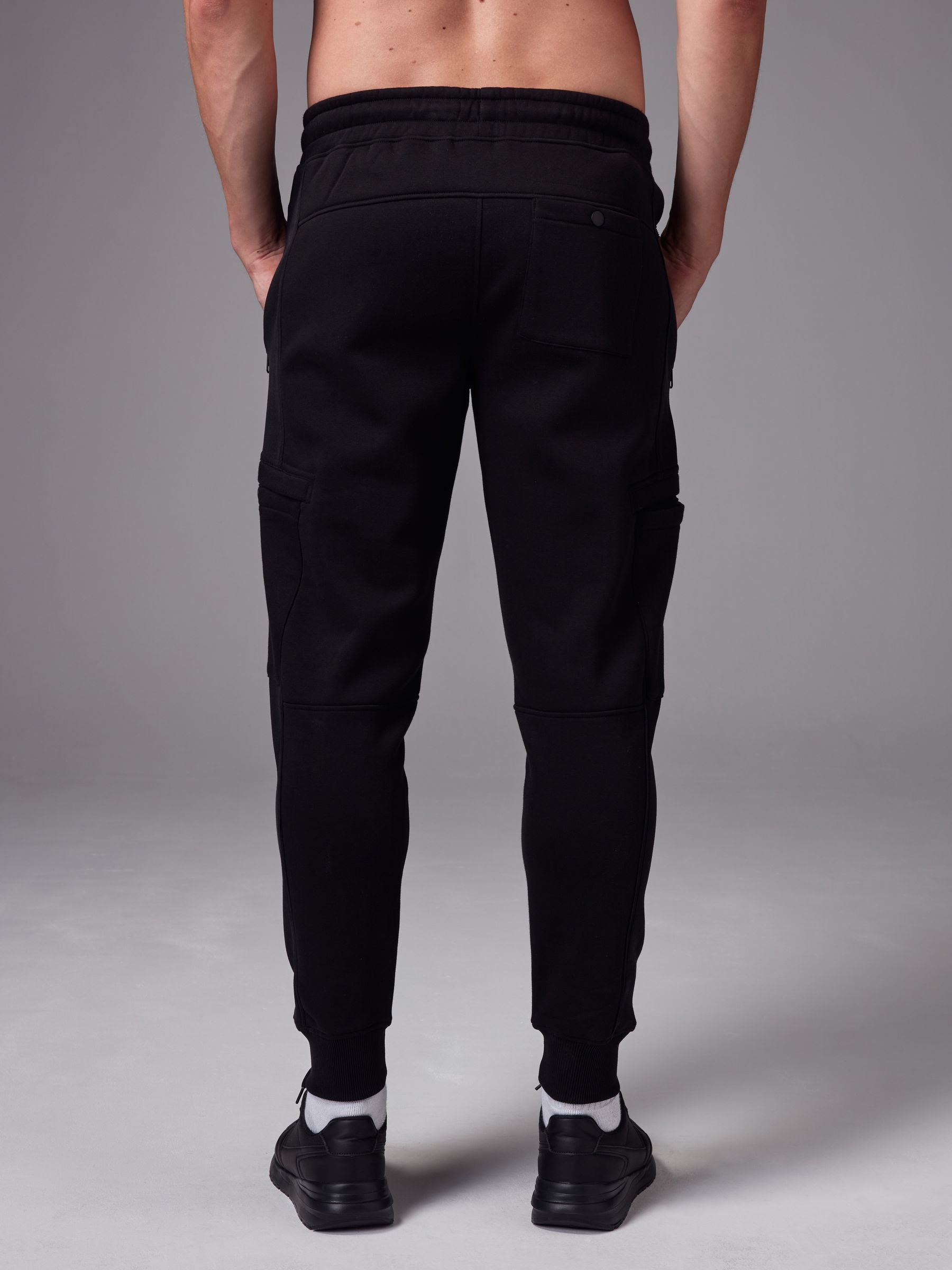 In a comfortable cotton-blend black fabric, these modern jogging bottoms feature ribbed panelling, zippered side pockets, cargo thigh pockets with a zippered side compartment, an elasticated waistband and a ribbed ankle cuff. Regular fit Slim leg Cotton-blend Zippered side and cargo pockets Elasticated waistband Ribbed ankle cuffs Machine washable. Main 80% Cotton, 20% Recycled polyester. Rib 98% Cotton, 2% Elastane.