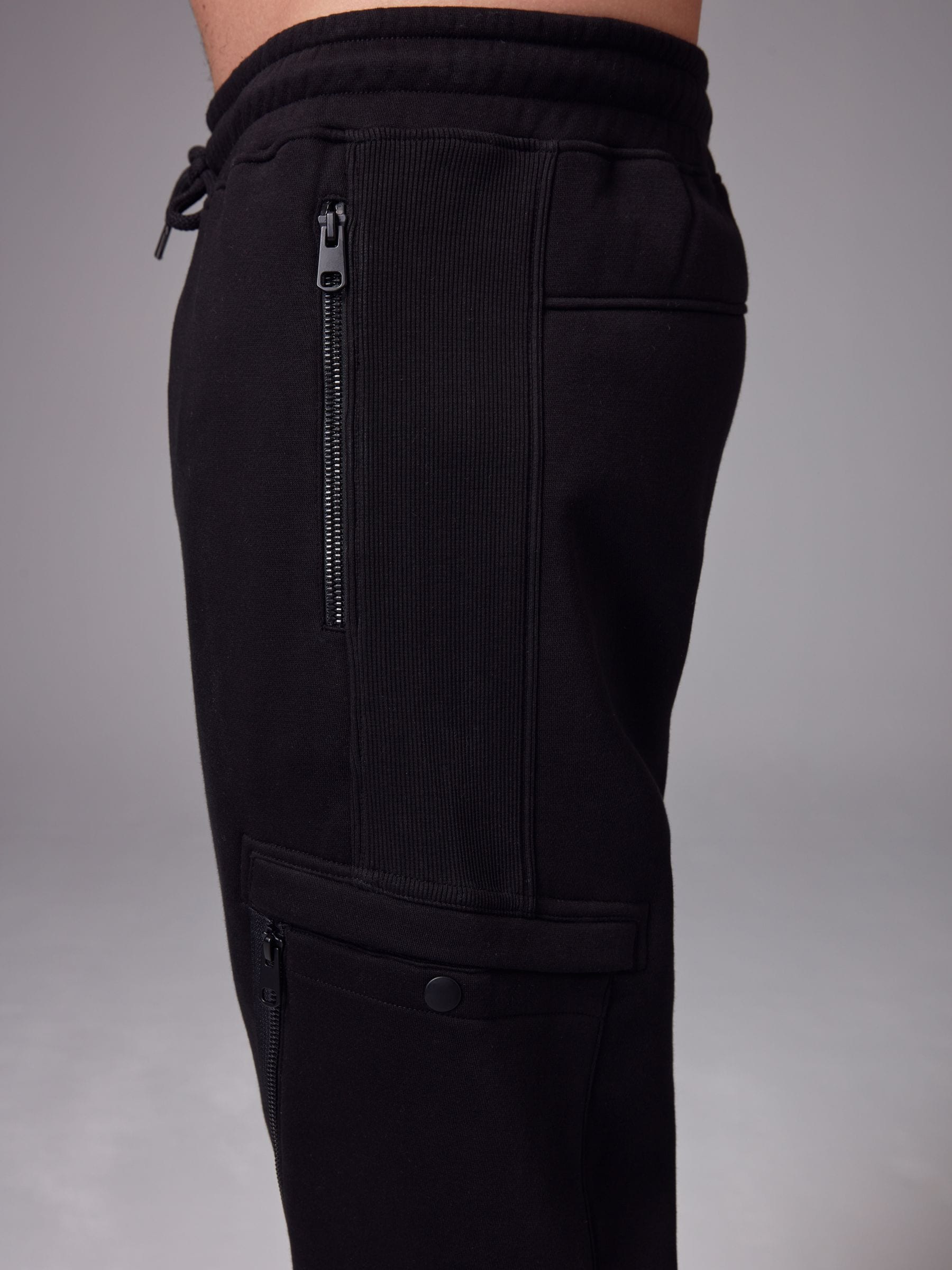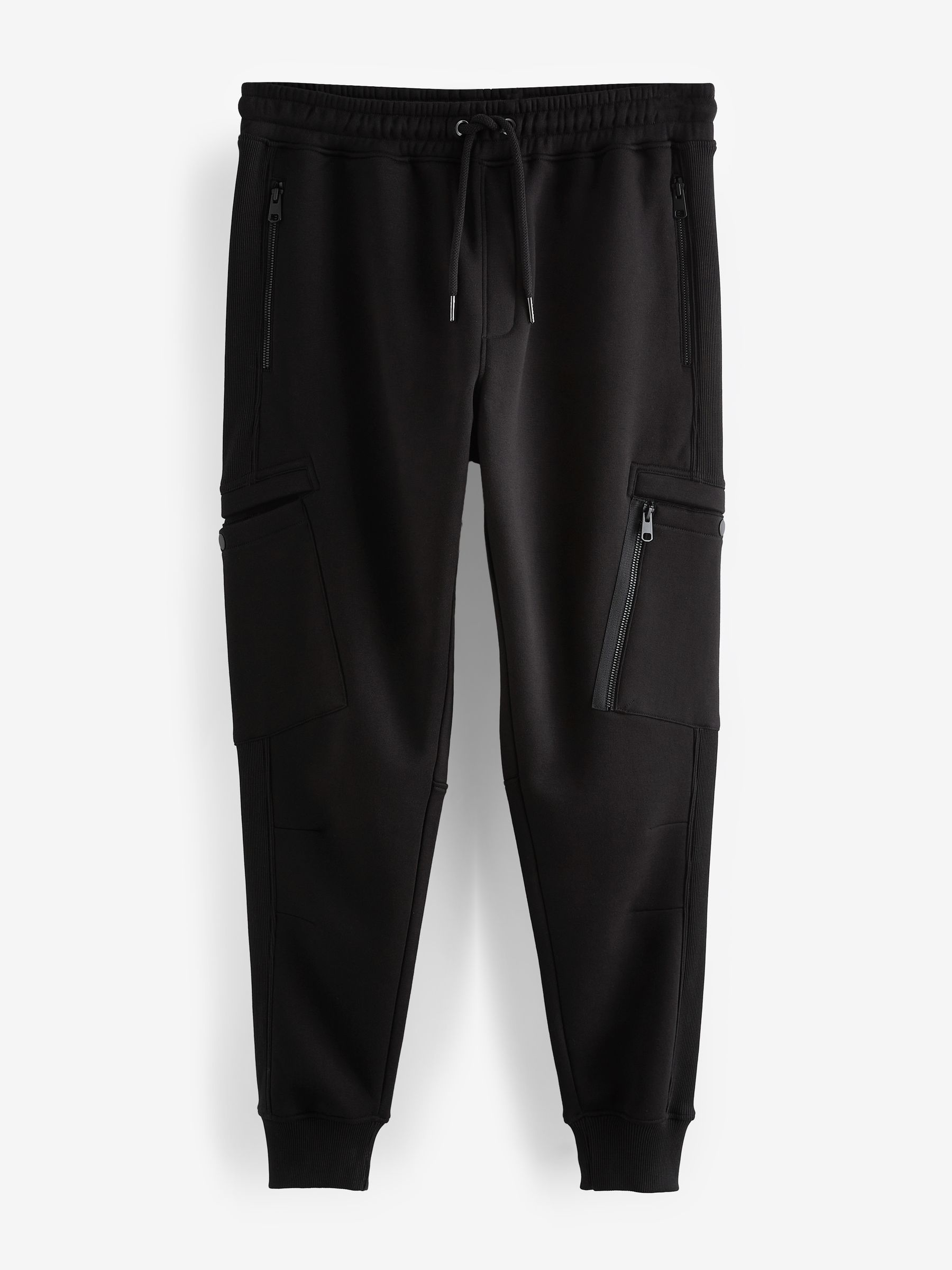 In a comfortable cotton-blend black fabric, these modern jogging bottoms feature ribbed panelling, zippered side pockets, cargo thigh pockets with a zippered side compartment, an elasticated waistband and a ribbed ankle cuff.