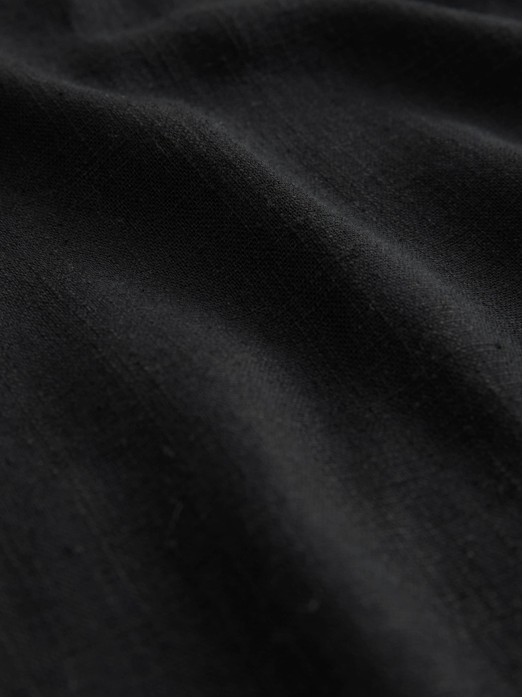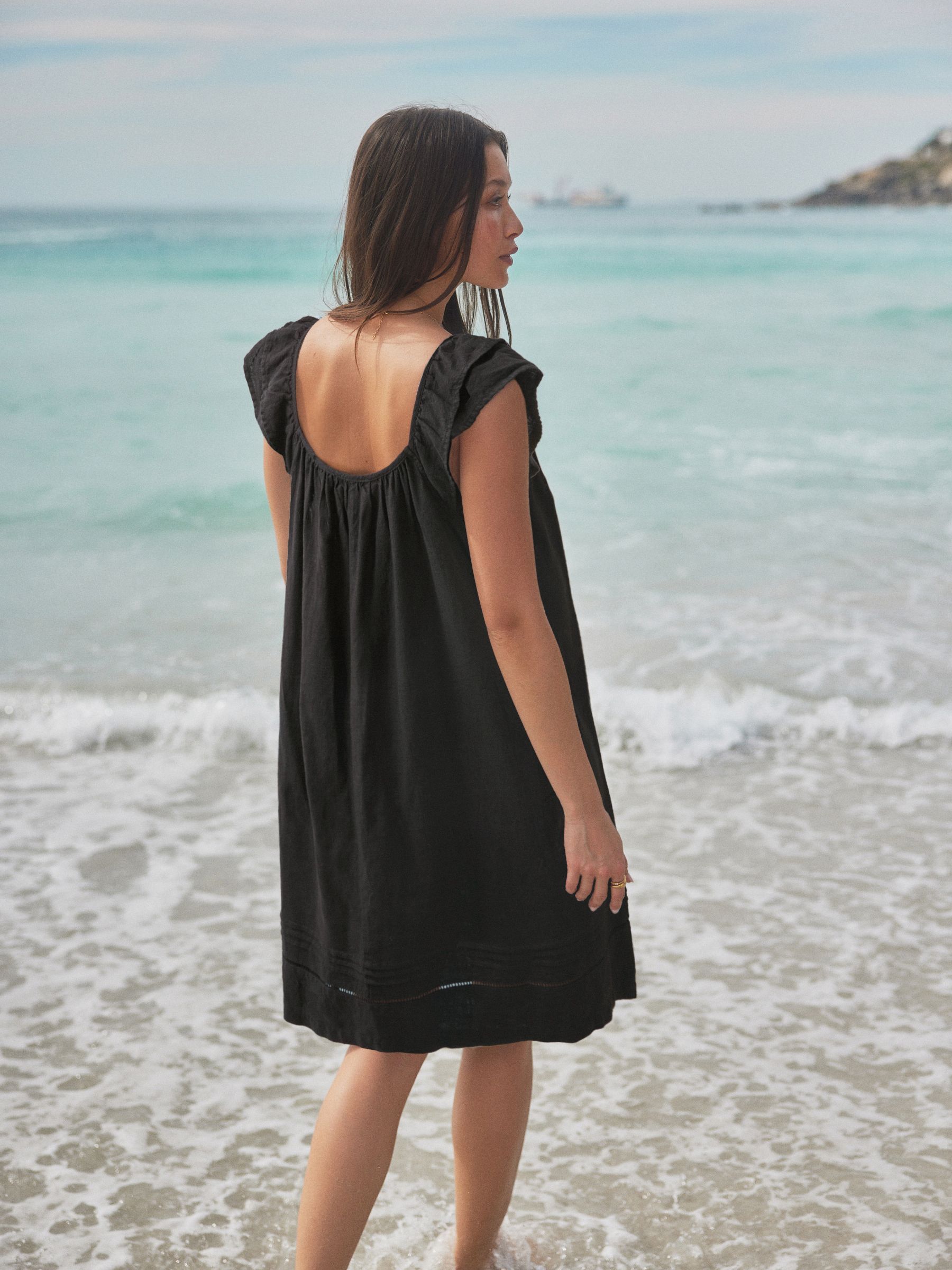 This black mini-length dress features a V-neck collar and short ruffle sleeves in a floaty linen-blend fabric. The versatile design makes this dress easy to elevate with a formal look, or your casual off-duty outfits for an everyday vibe.