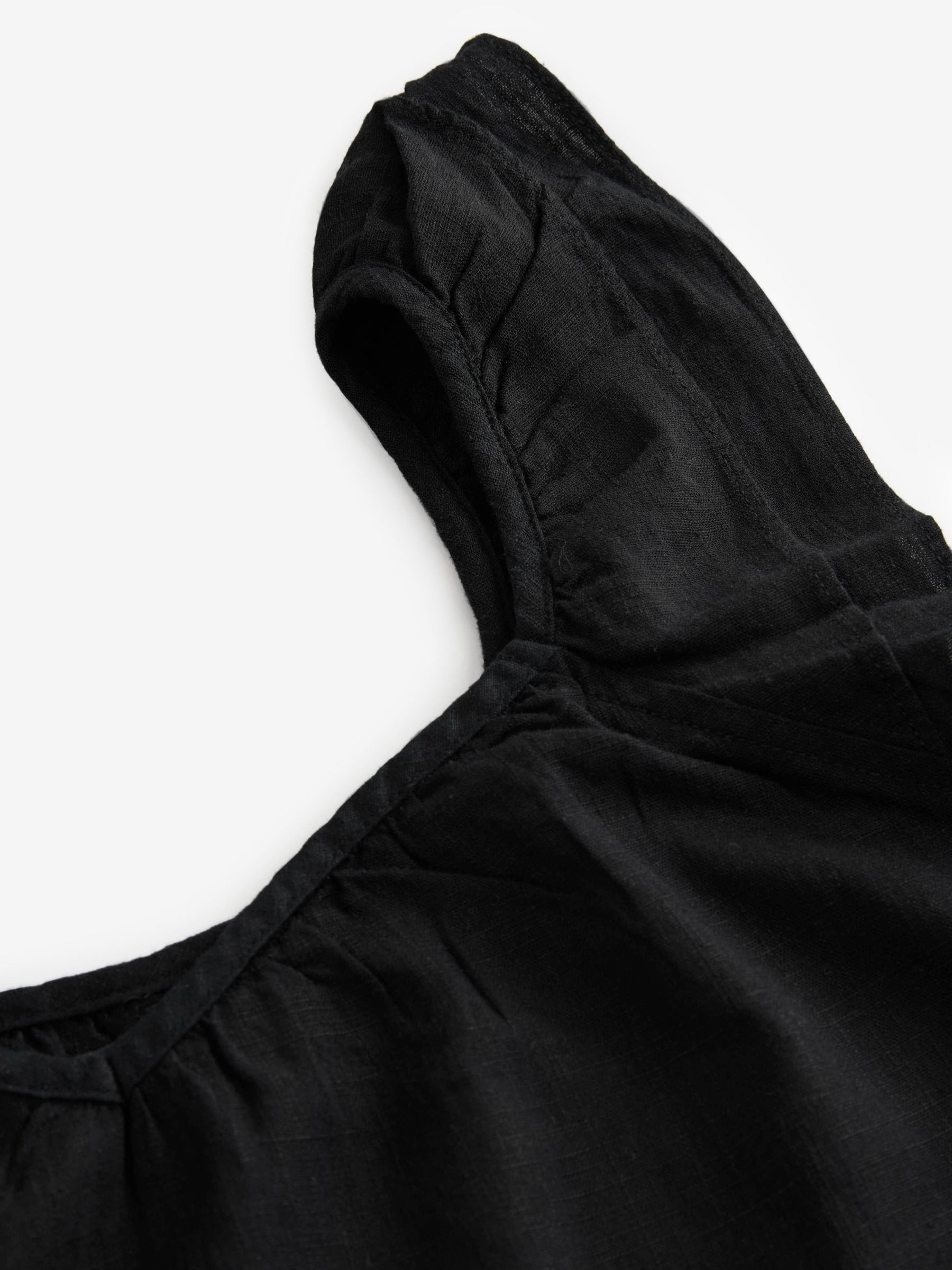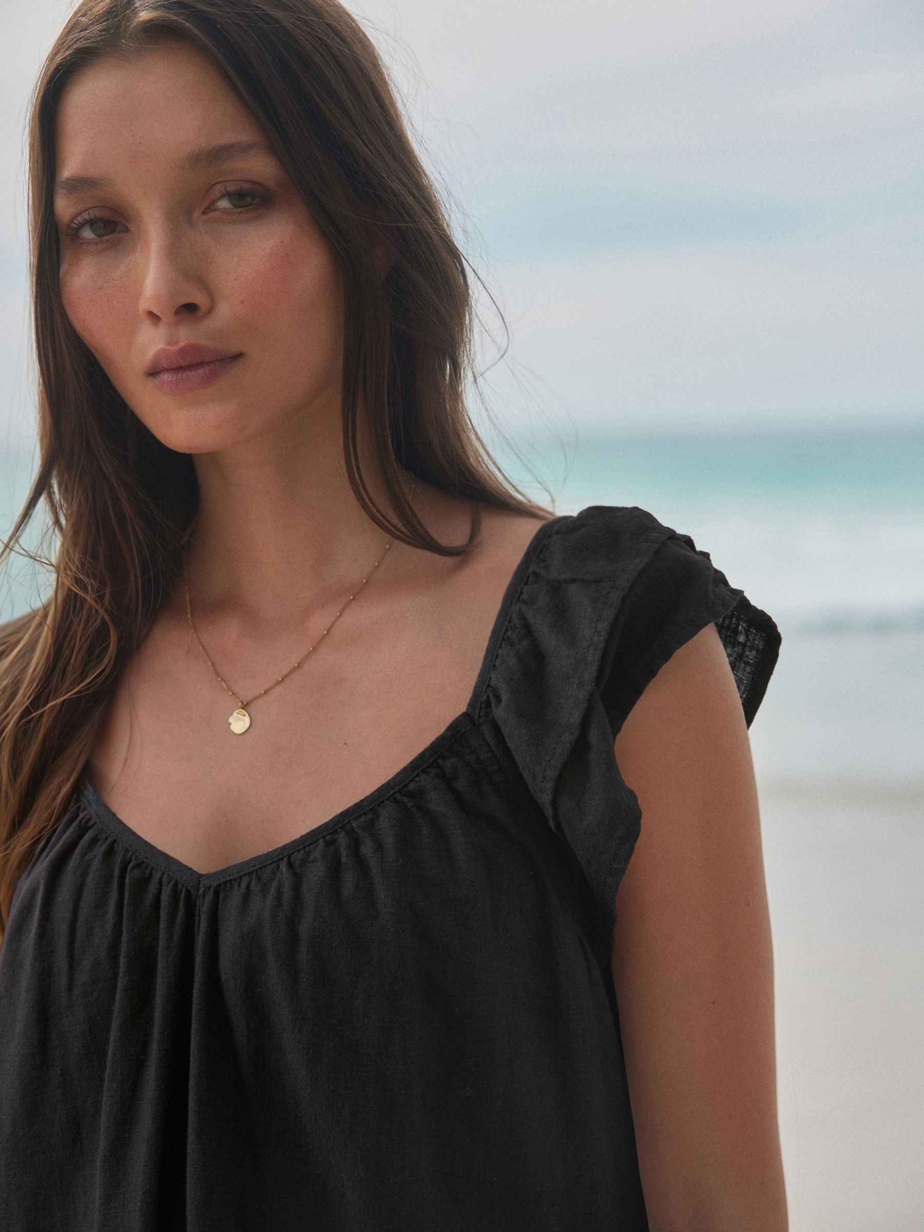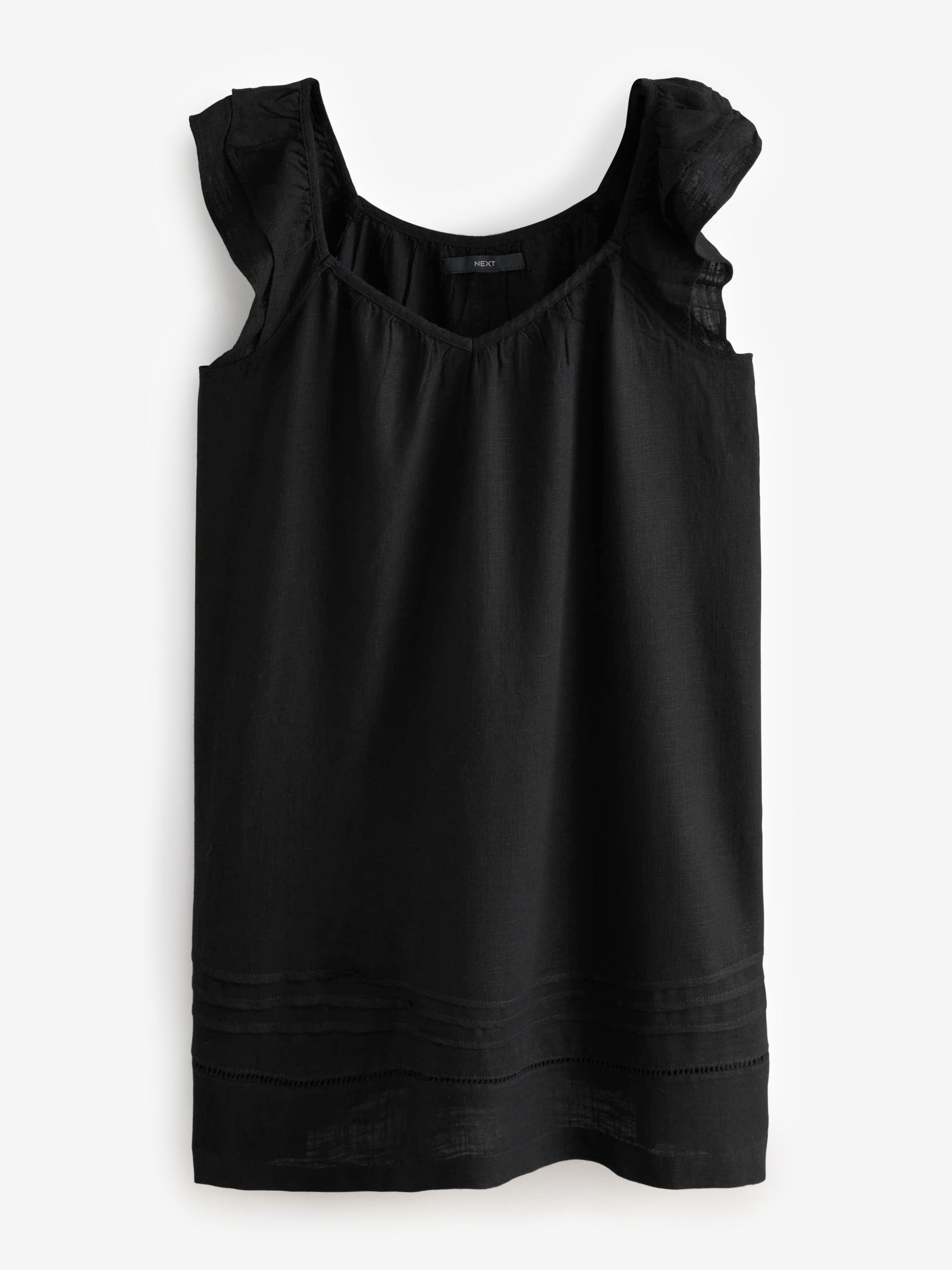 This black mini-length dress features a V-neck collar and short ruffle sleeves in a floaty linen-blend fabric. The versatile design makes this dress easy to elevate with a formal look, or your casual off-duty outfits for an everyday vibe. Regular sizing Mini-length Linen-blend fabric V-shaped neck Short ruffle sleeves Regular side neck to hem 36″ x 92cm. Machine washable. 70% Livaeco™ Viscose, 30% Linen. Our tall collection is designed to fit women 5’10” and above. This has been proportionally increased through the body, leg and sleeve to achieve the perfect fit. Available in sizes 8-20., Items with the curve logo are available in sizes 18 and above.