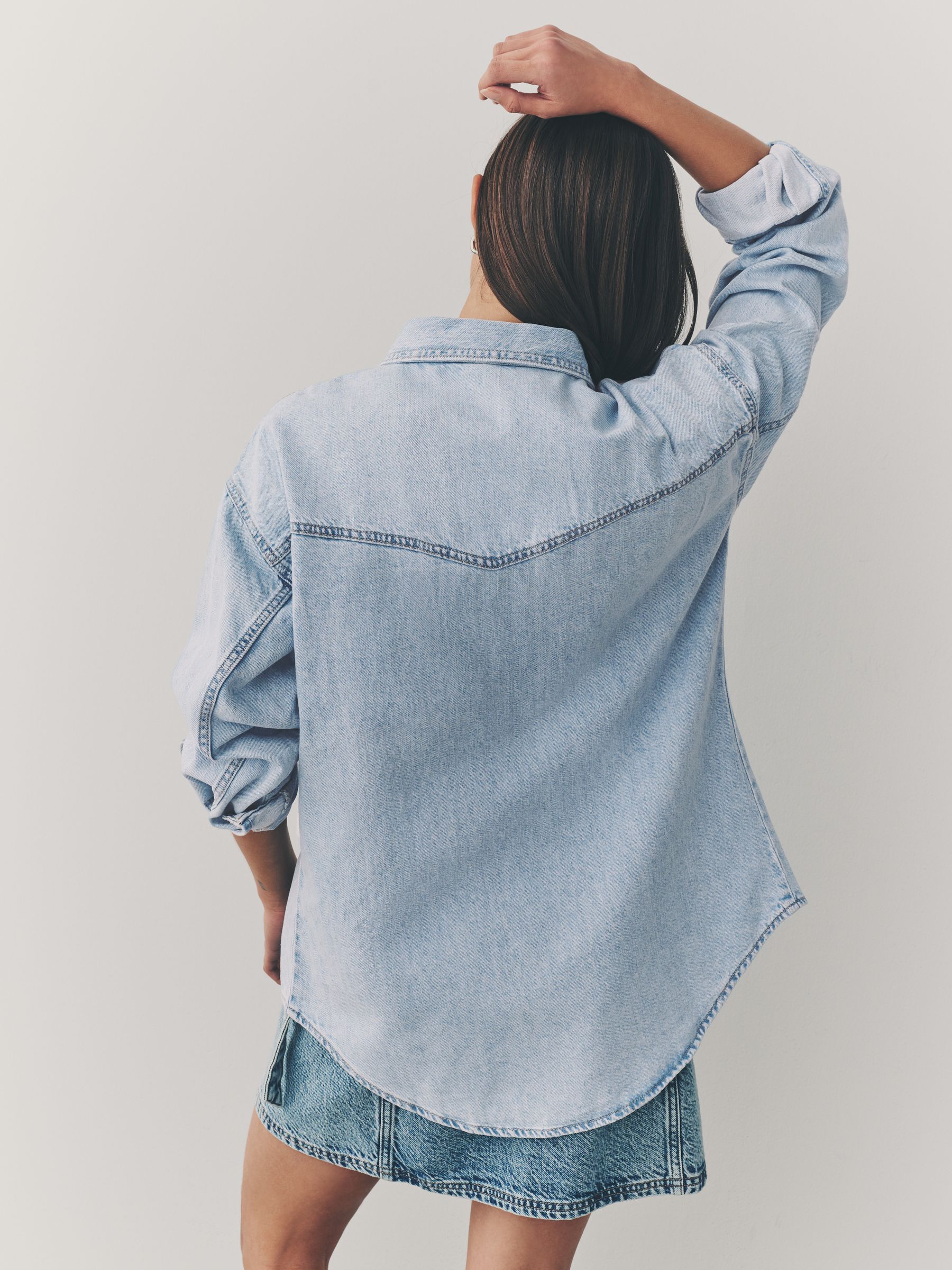 A new update on our bestselling denim shirt. Crafted in 100% cotton for breathable comfort, this shirt offers an oversized comfy fit to throw on with any outfit, finished with a collar and flap chest pockets. Available in multiple washes, colours and prints. Oversized shape 100% cotton denim Button-up fastening Flap chest pockets Classic collar Machine washable. 100% Cotton. Our tall collection is designed to fit women 5’10” and above. This has been proportionally increased through the body, leg and sleeve to achieve the perfect fit. Available in sizes 8-20.