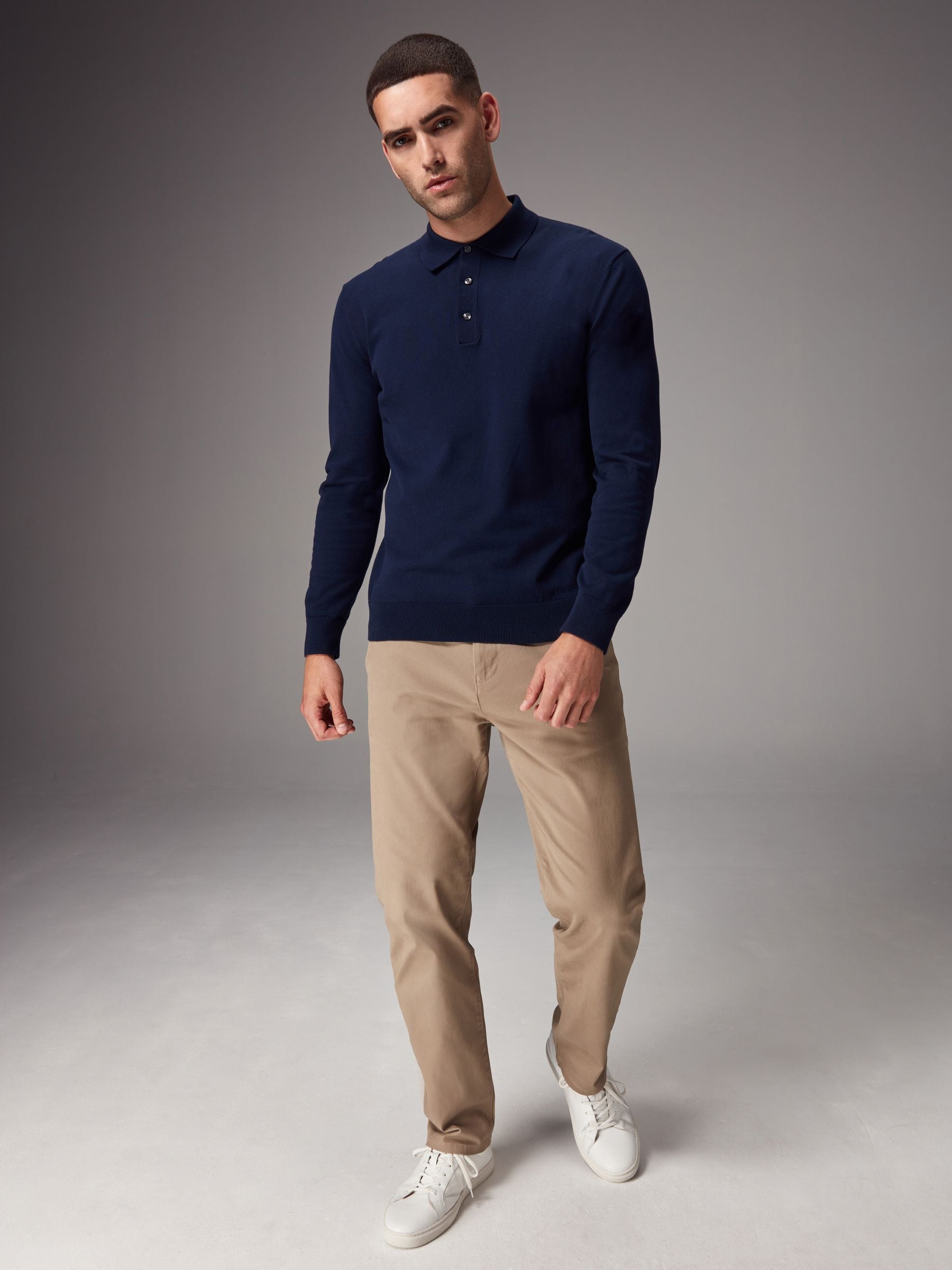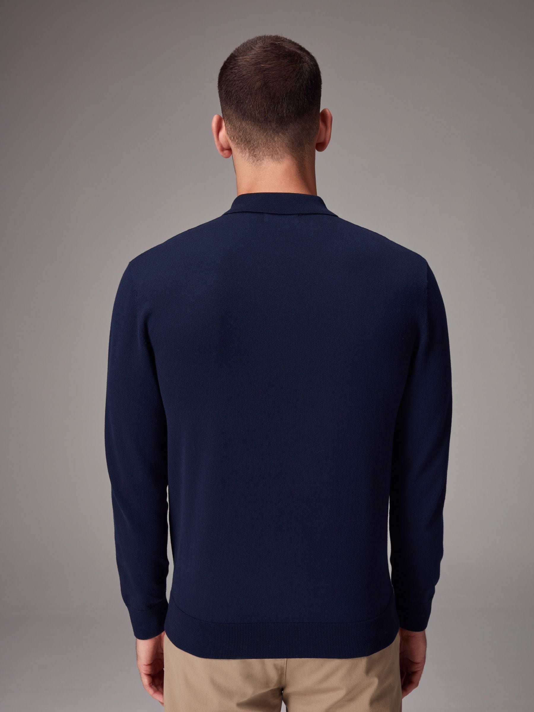 Elevate your smart-casual selection with this cotton-blend navy blue regular-fit knitted polo shirt, featuring a button-up neckline, a classic collar, ribbed sleeve cuffs and a ribbed hem. Perfect for wearing as a stand alone top or on top of a t-shirt as a mid-layer.
