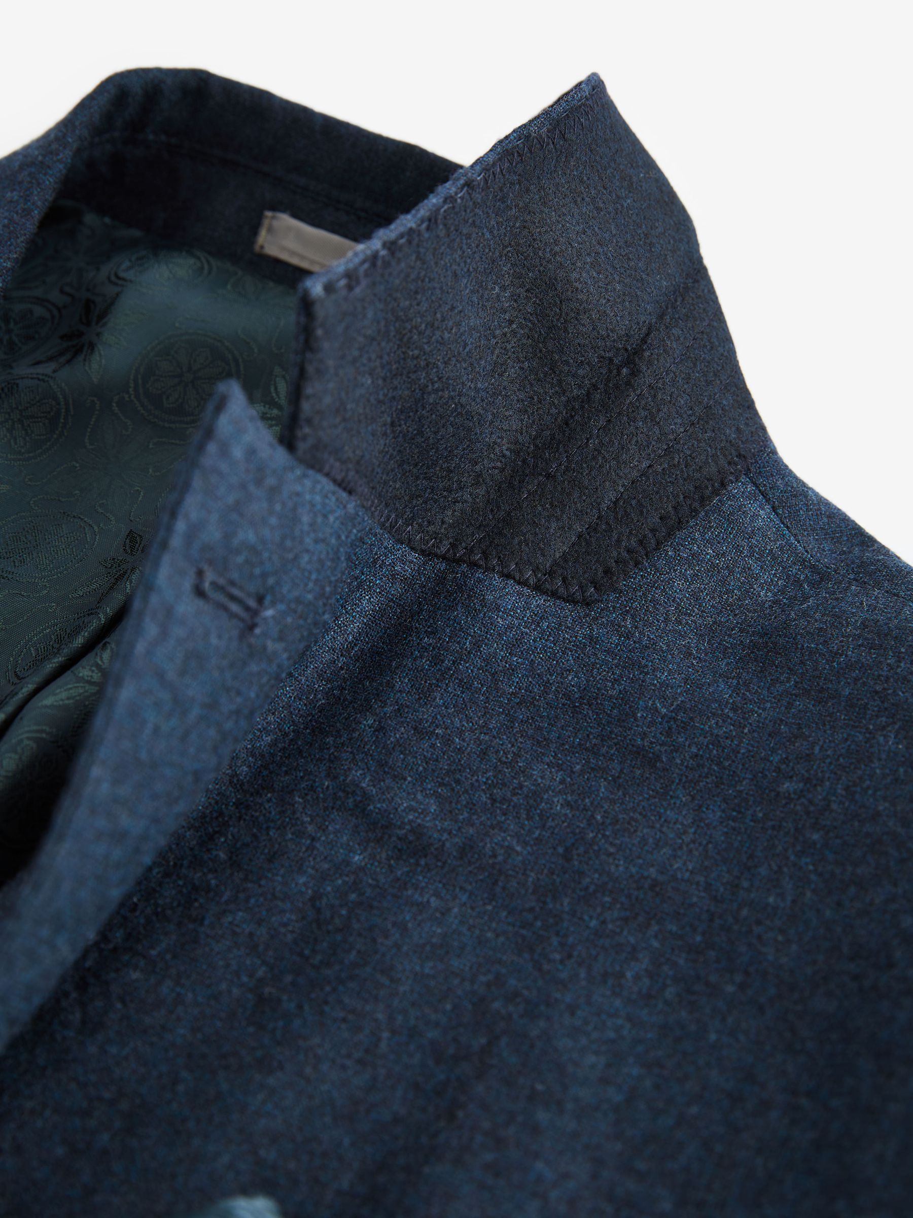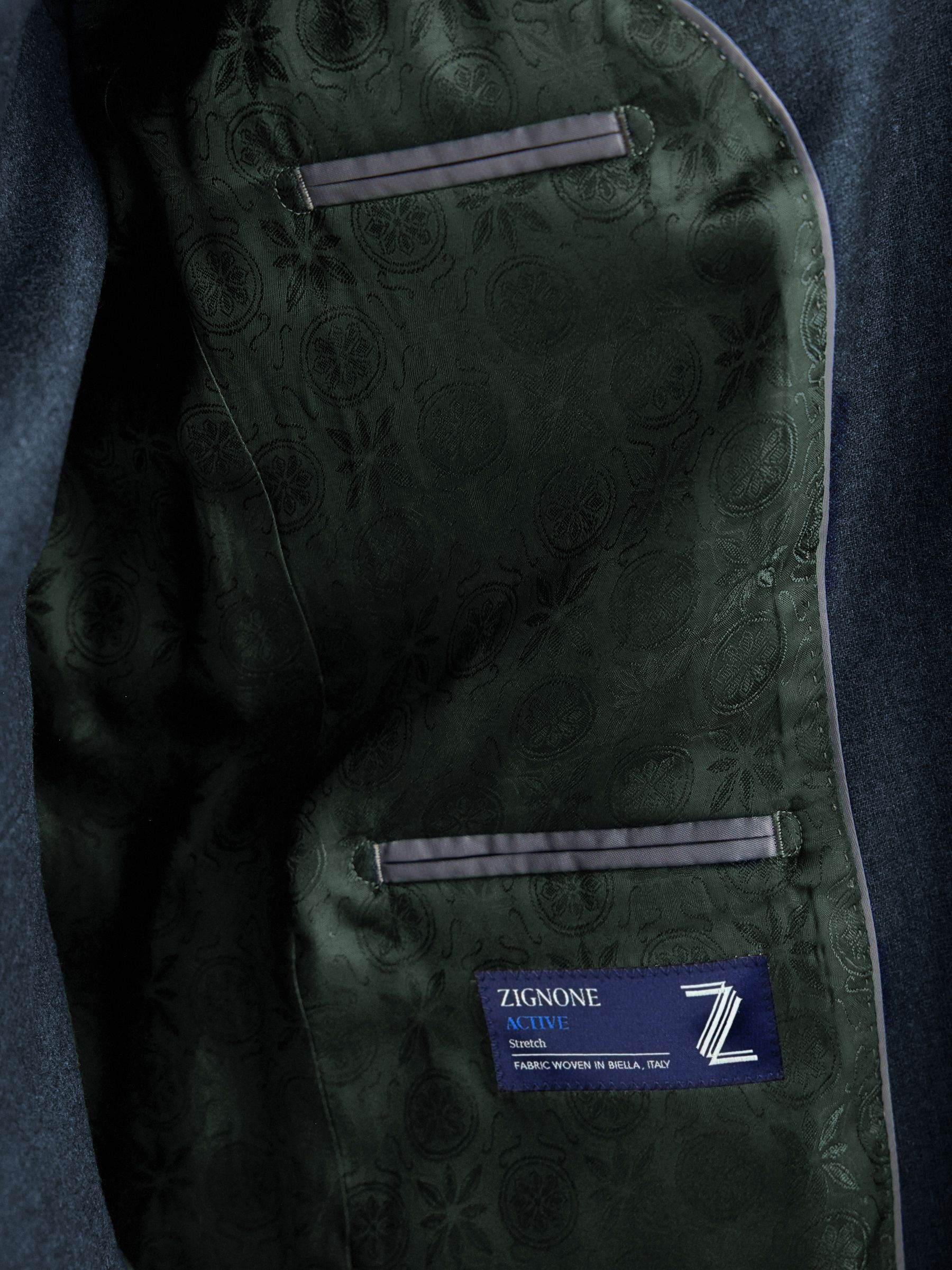 Crafted from luxurious Zignone Italian fabric with a touch of cashmere, the Signature Zignone flannel suit jacket in blue is the pinnacle of elegance and comfort. The premium wool ensures a soft, smooth texture that makes every wearing a pleasure. This impeccably tailored piece features a half-canvas chest construction that moulds perfectly to your body, offering both durability and a flattering fit. Inside, the jacquard lining and multiple internal pockets adds more flair. Additionally, the functional cuffs not only add sophistication but also allow for easy adjustments.