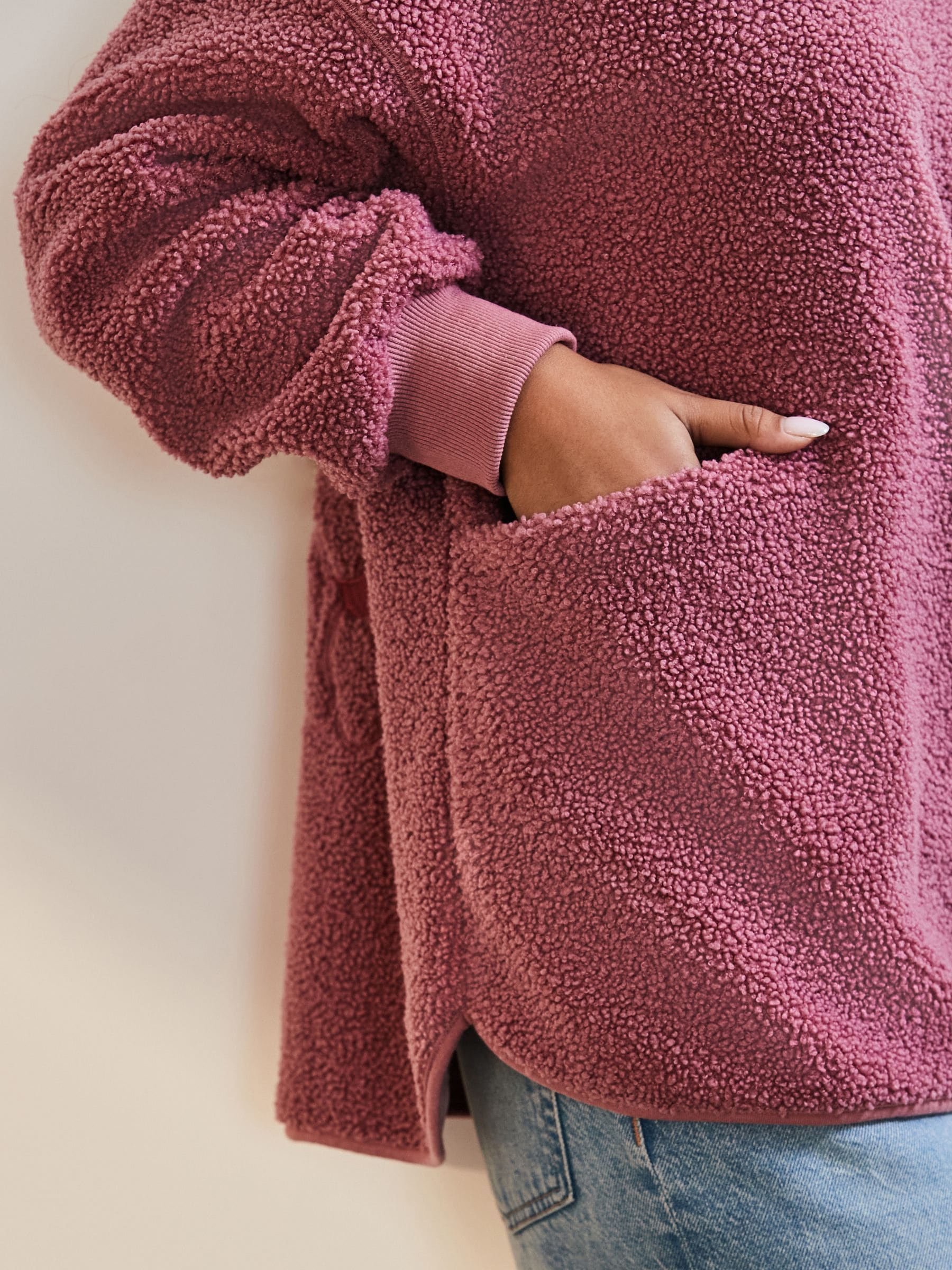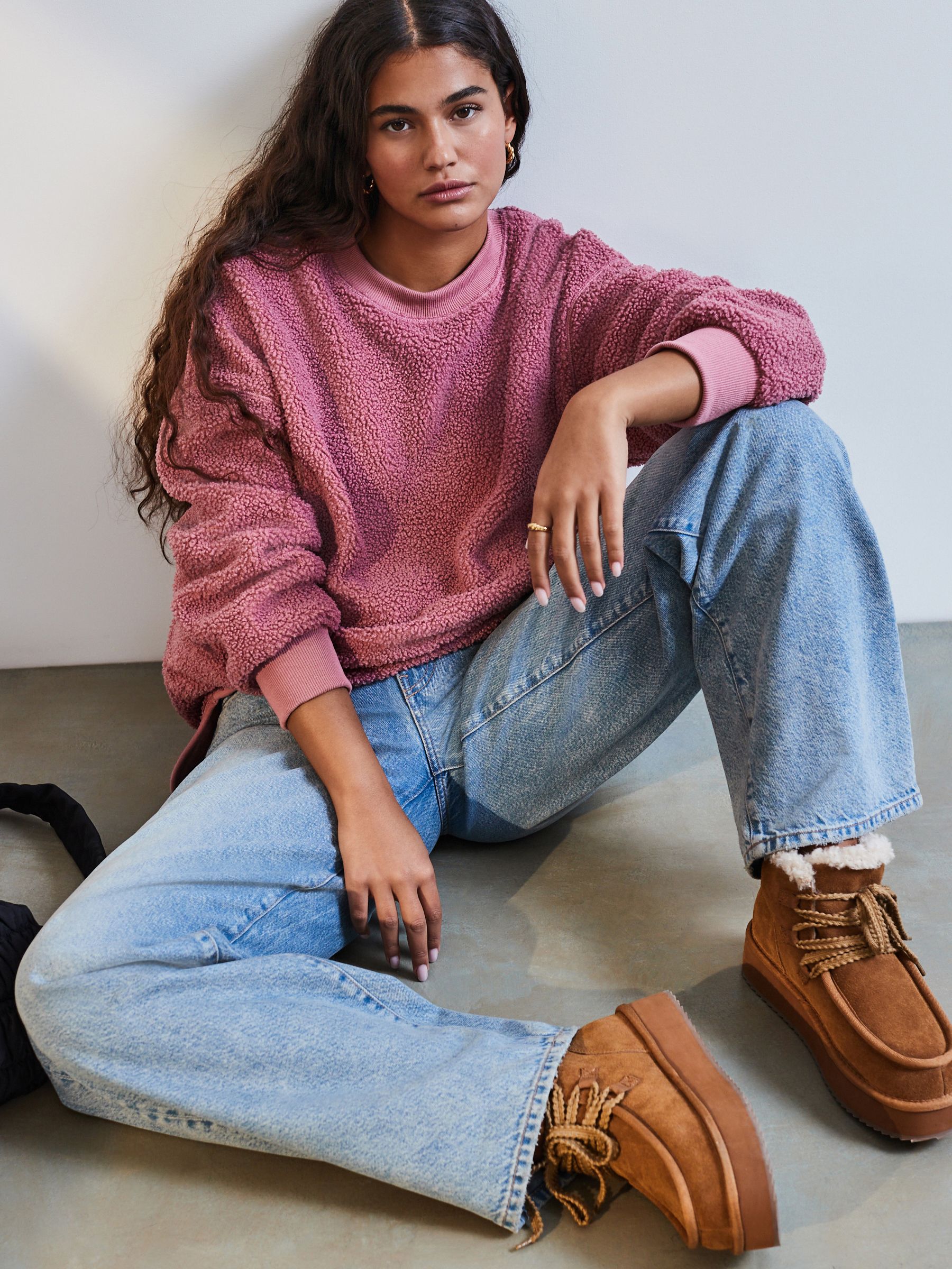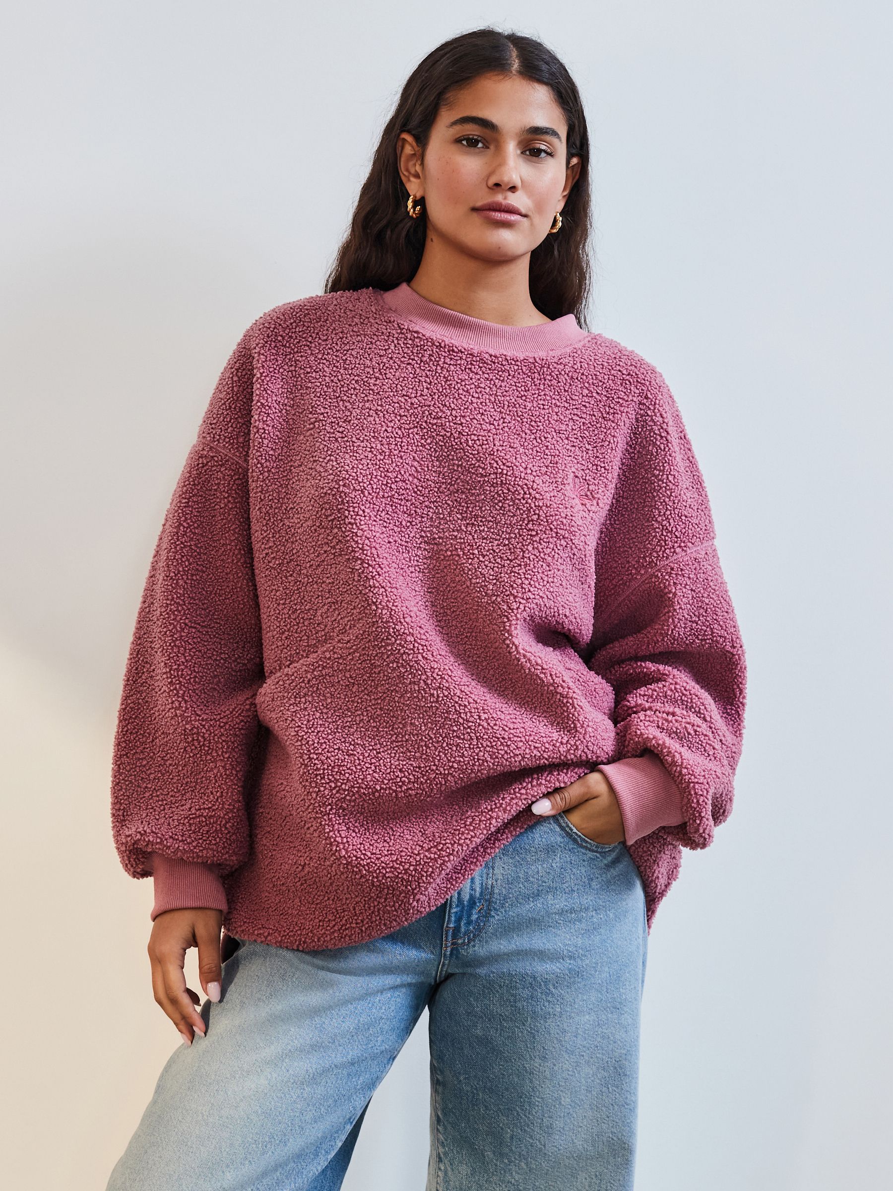 In a relaxed fit, this crewneck sweatshirt has a warm borg fleece fabric for a cosy casual look, finished with ribbed sleeve cuffs and piped hems. Pair with leggings for a sporty look. Relaxed fit Crewneck collar Longline Borg fleece fabric Ribbed sleeve cuffs Piped hems Machine washable. Face 100% Polyester. Reverse 92% Polyester, 8% Elastane.