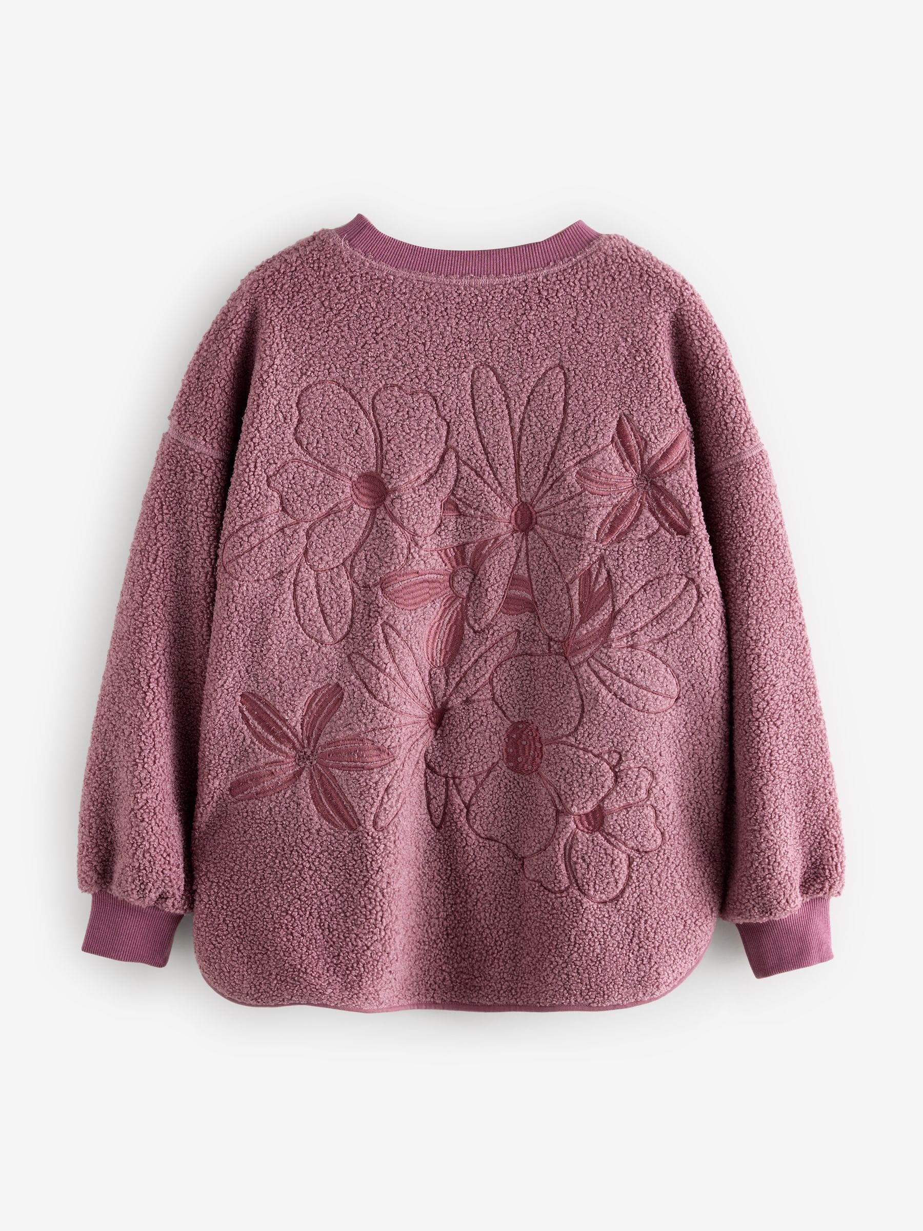 Blush Pink Floral Graphic Print Relaxed Fit Teddy Borg Fleece Cord Back Longline Crew Neck Sweatshirt