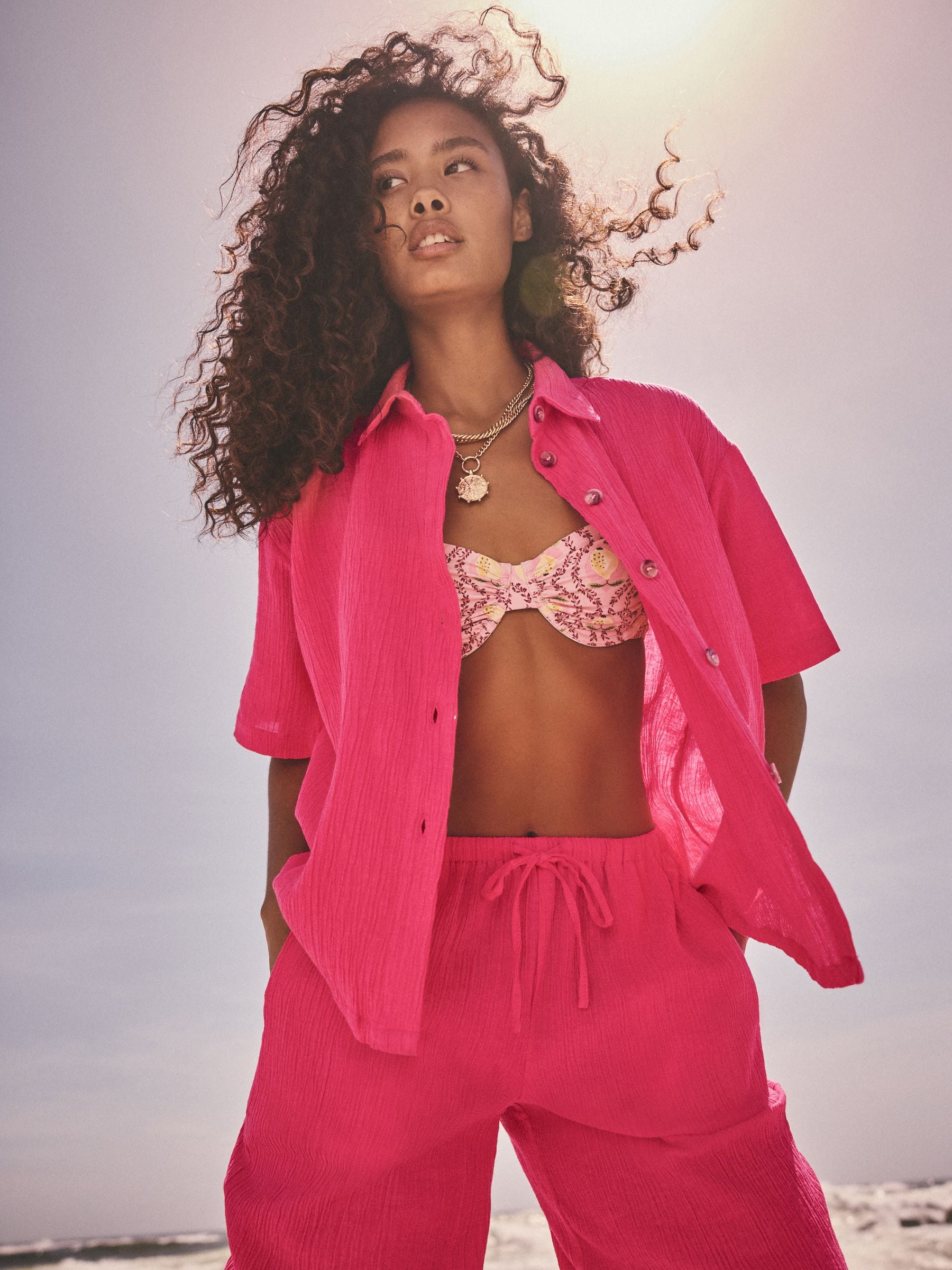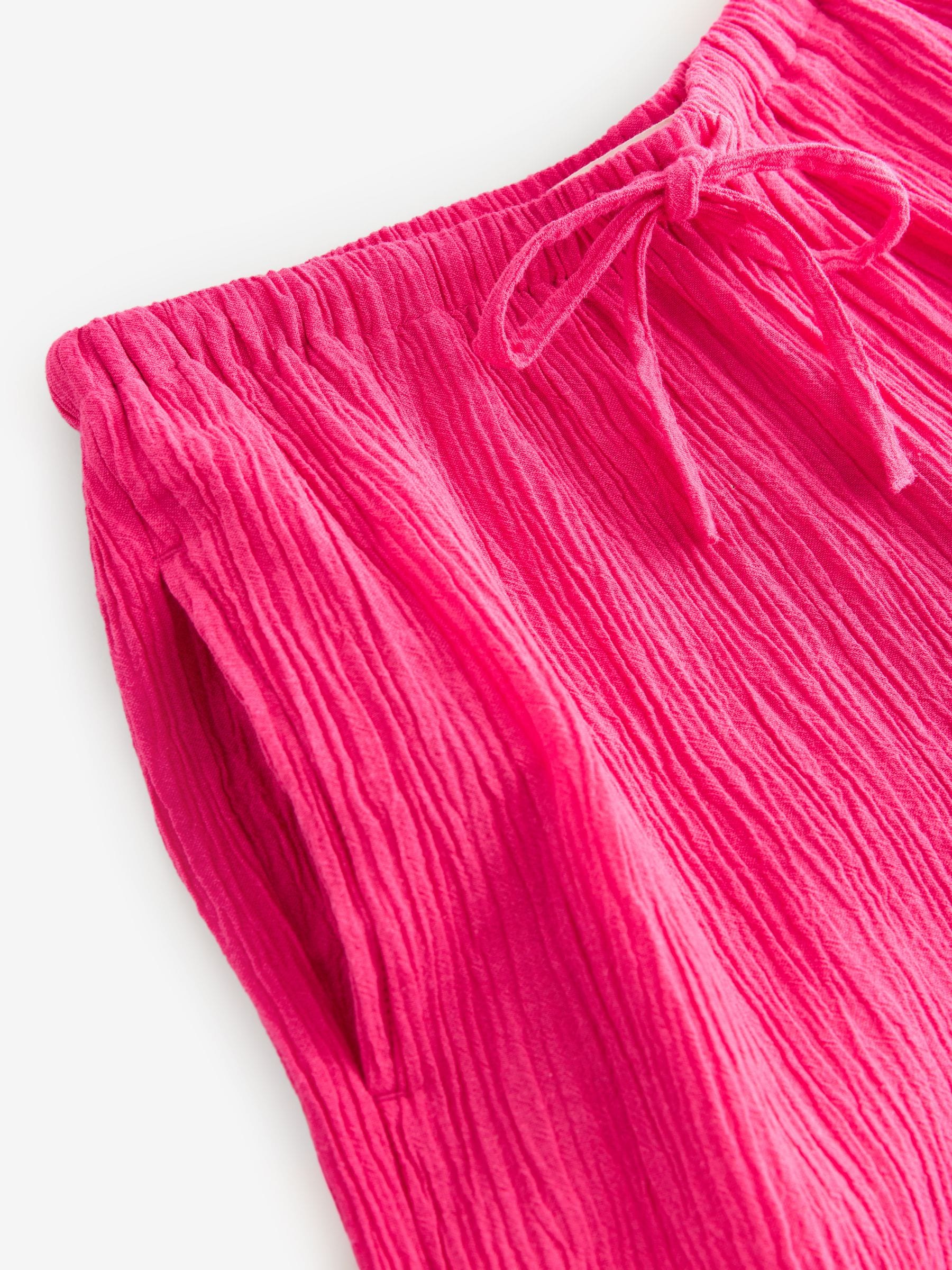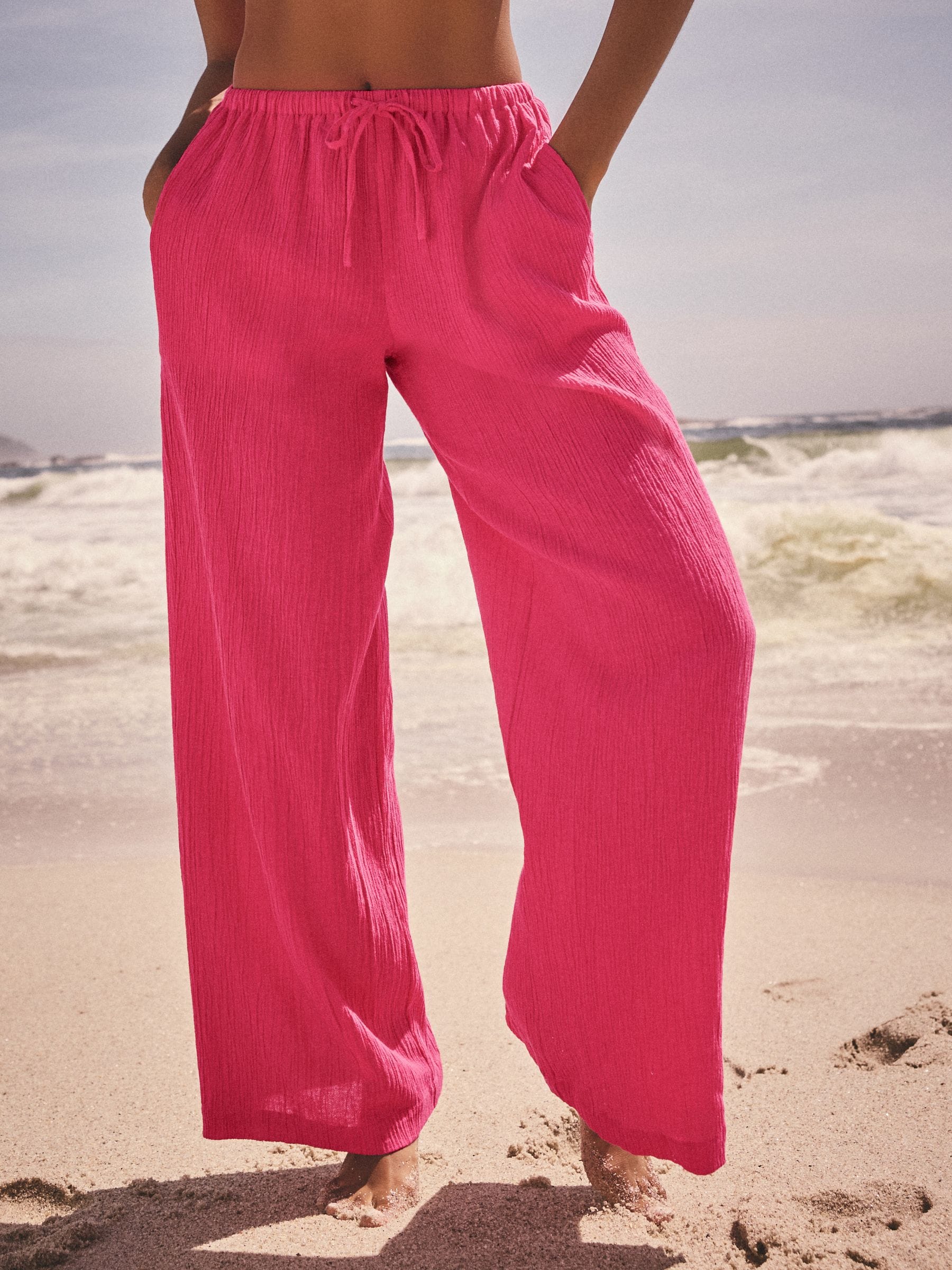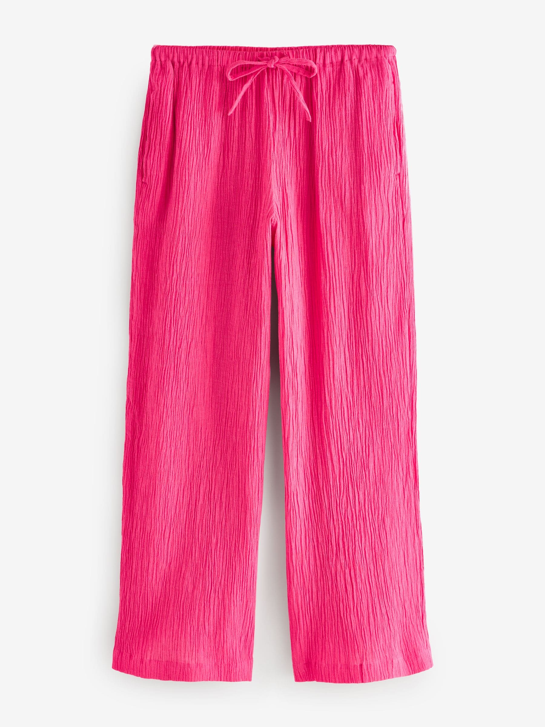 These stylish bright pink wide leg trousers are the perfect finishing touch to your casual or smart outfits. Made from a breathable textured cotton linen-blend fabric and finished with side pockets and an elasticated waist.