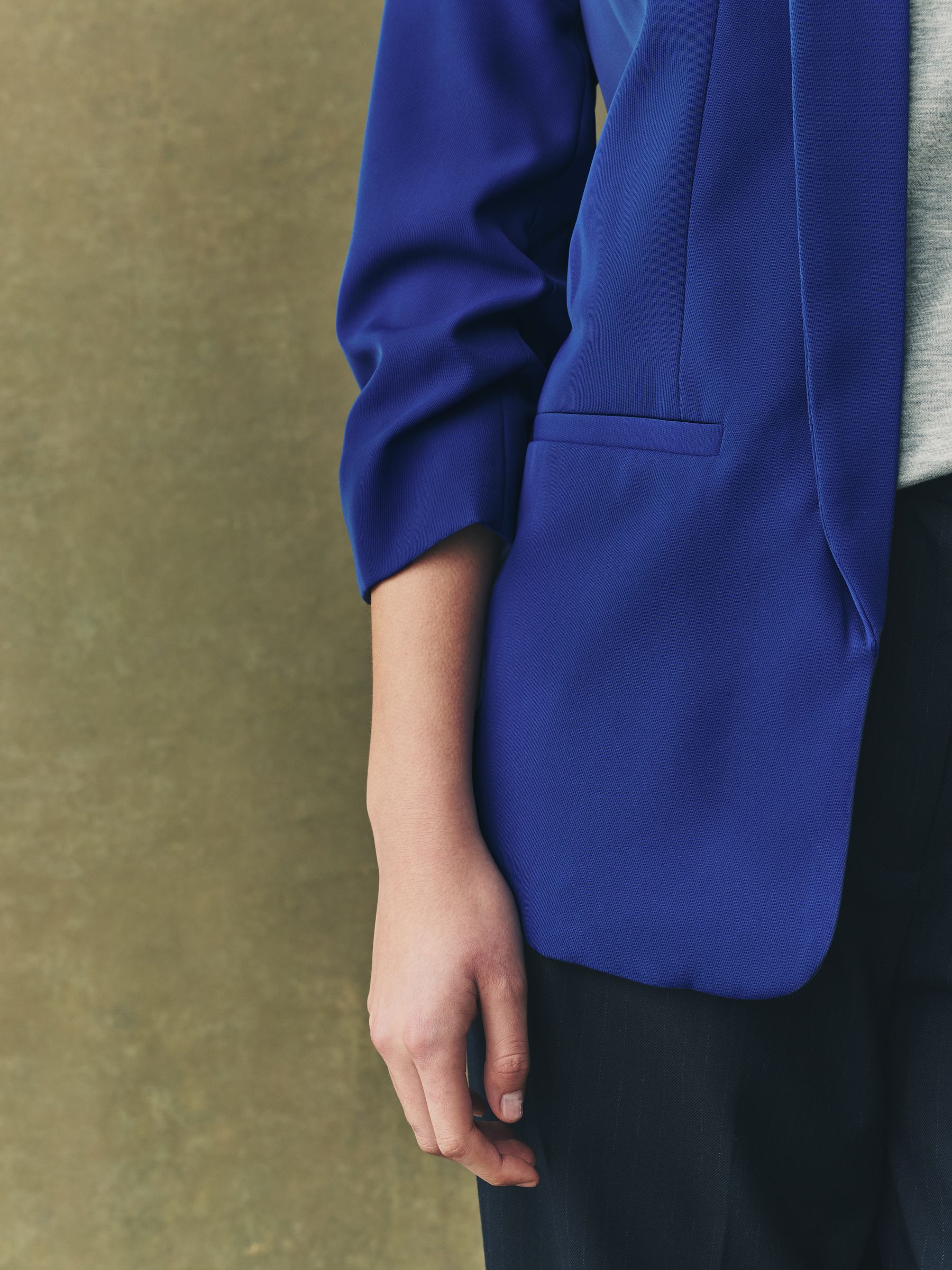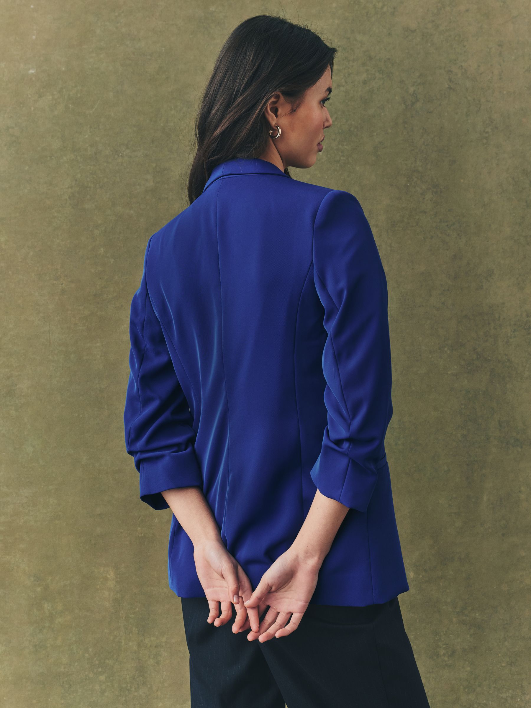 Made from a soft handle fabric, this relaxed blazer features ruched sleeves, mock welt pockets on the front and seam detail for shaping. This blazer offers a relaxed fit while still looking smart. Simply throw on over jeans and a T-Shirt, or dress up with trousers and a heel. Relaxed fit Soft handle fabric Mock welt pockets Regular centre back neck to hem 27.5″ x 70cm. Machine washable. Main 100% Recycled polyester. Lining 100% Recycled polyester. Our tall collection is designed to fit women 5’10” and above. This has been proportionally increased through the body, leg and sleeve to achieve the perfect fit. Available in sizes 8-20., Items with the curve logo are available in sizes 18 and above.
