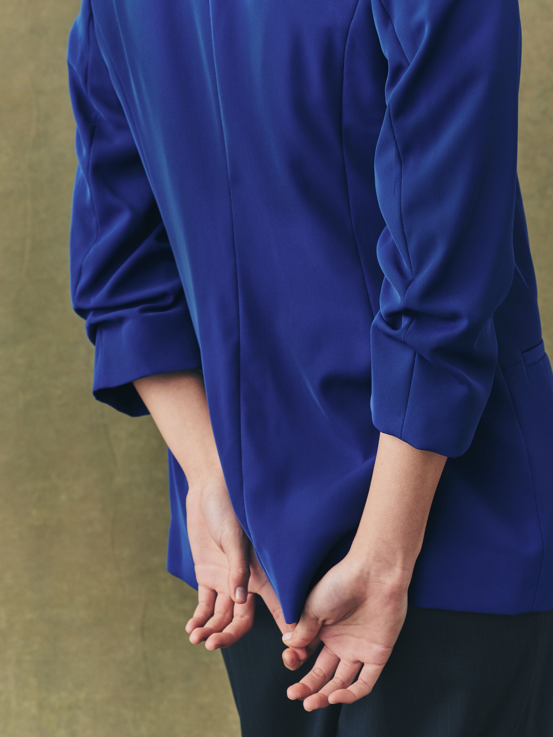 Made from a soft handle fabric, this relaxed blazer features ruched sleeves, mock welt pockets on the front and seam detail for shaping. This blazer offers a relaxed fit while still looking smart. Simply throw on over jeans and a T-Shirt, or dress up with trousers and a heel.