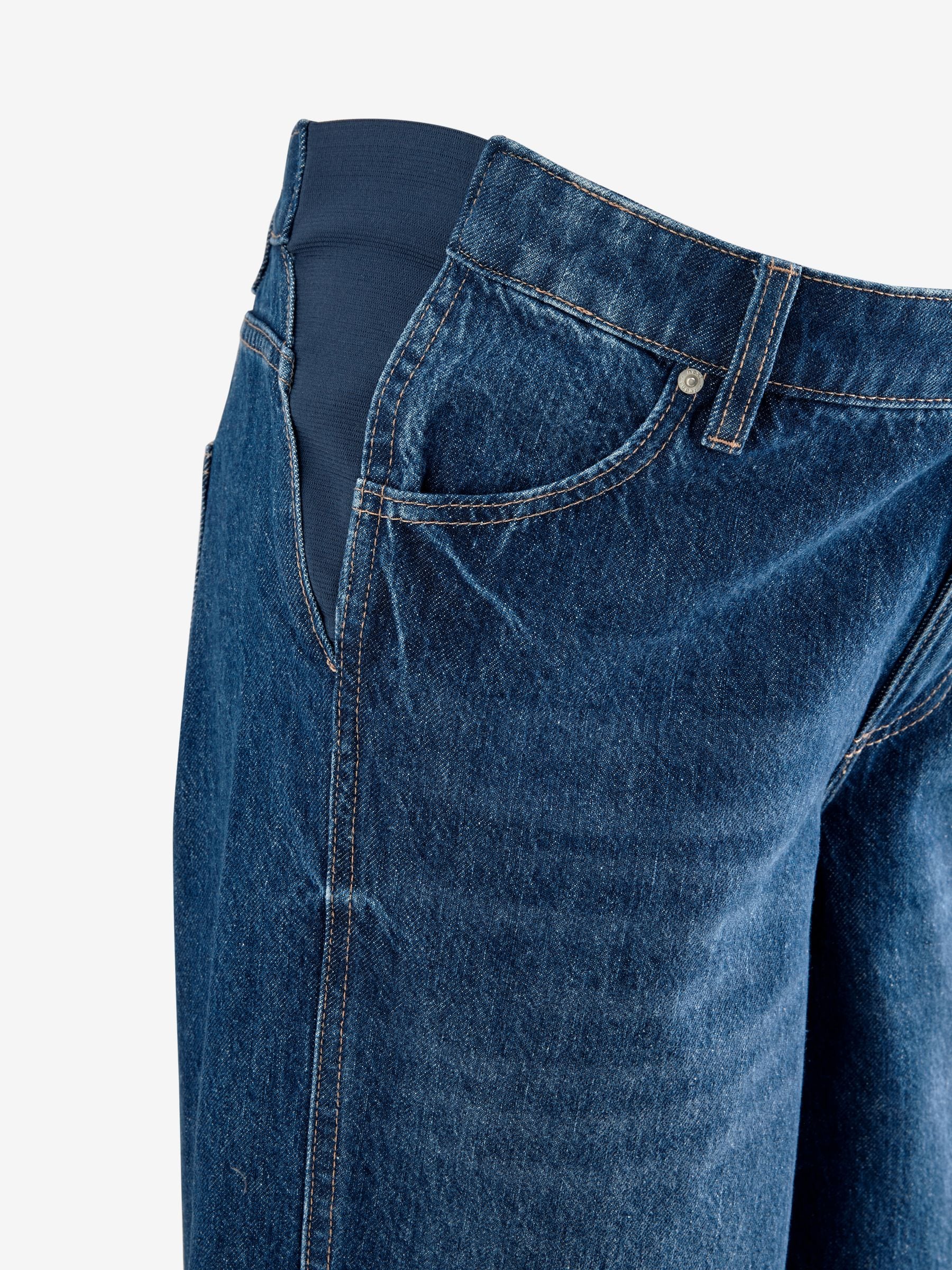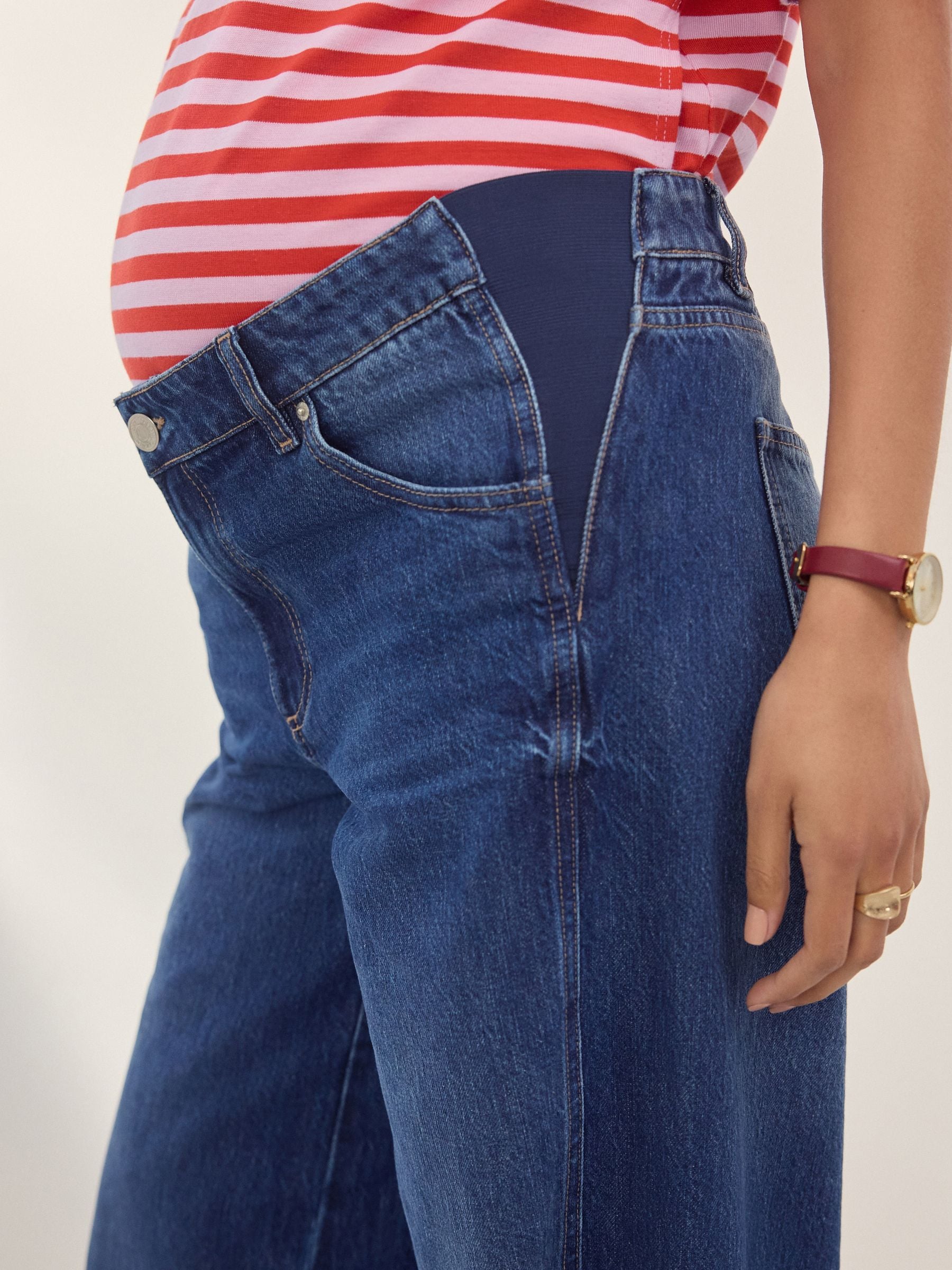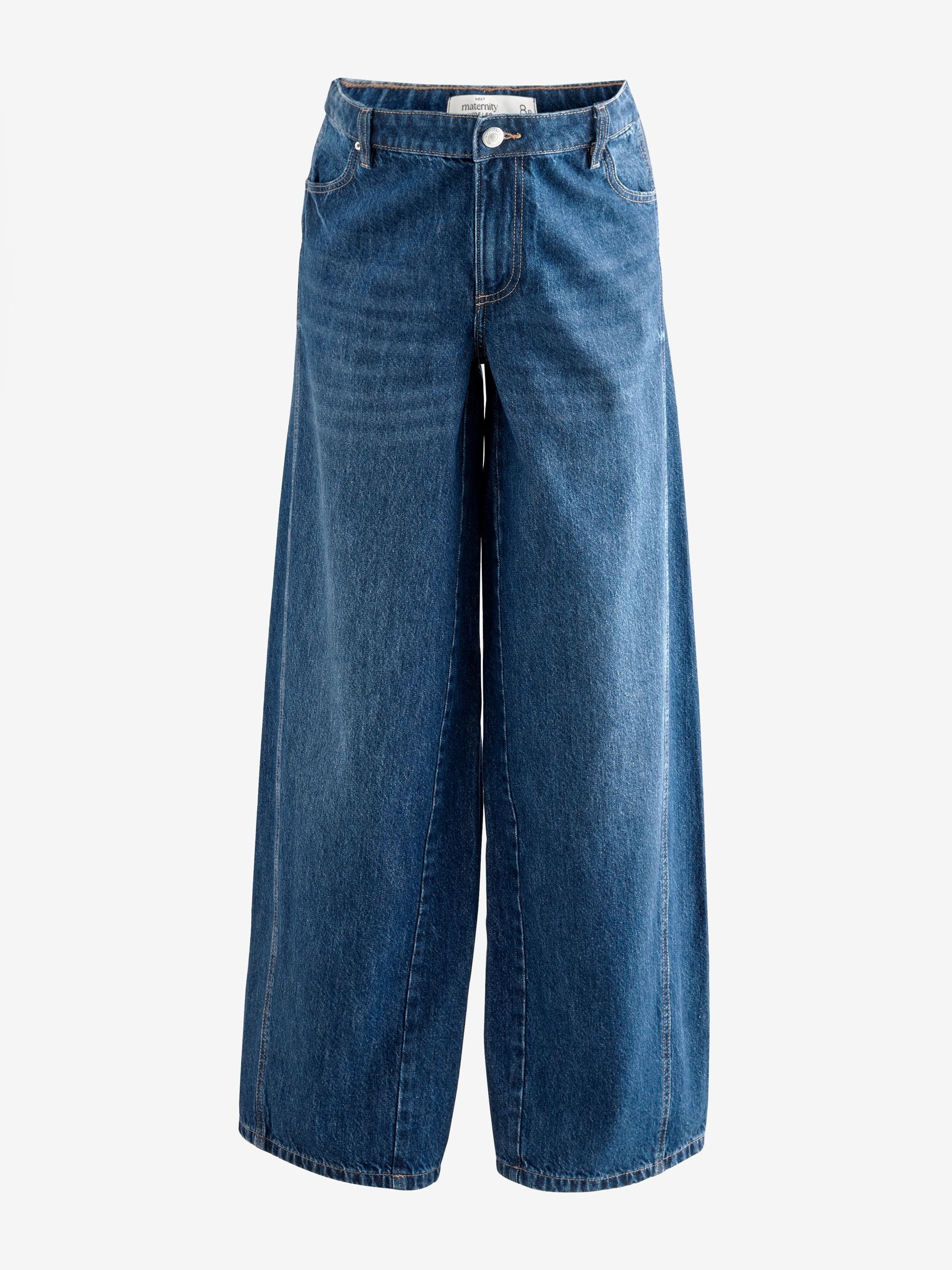 Ideal for your casual outfits during and after pregnancy, these stylish dark blue wide-leg jeans have elasticated inserts to the side for an added stretch that moves with your bump, crafted from pure cotton denim with pockets and a button and zip fastening.
