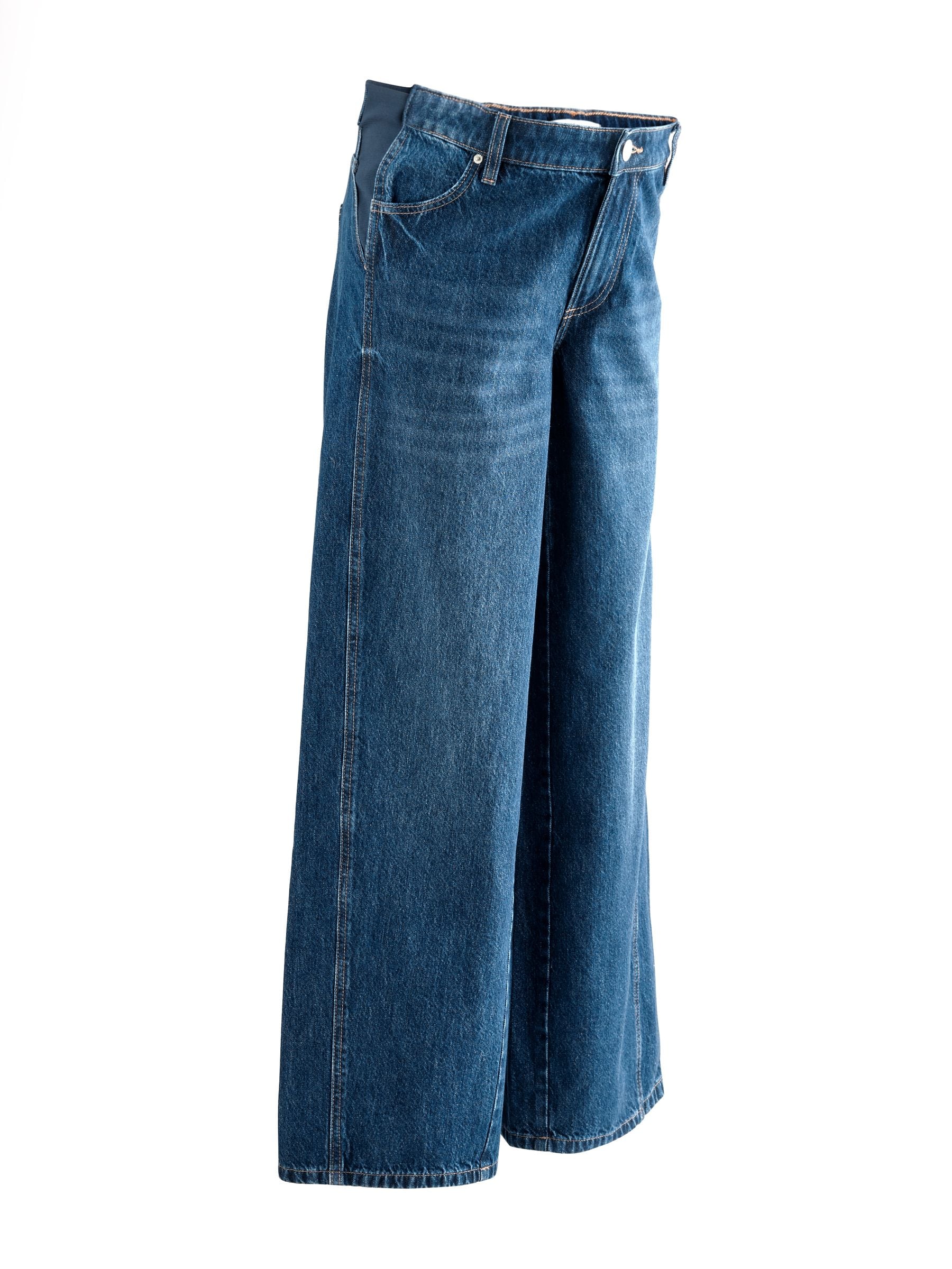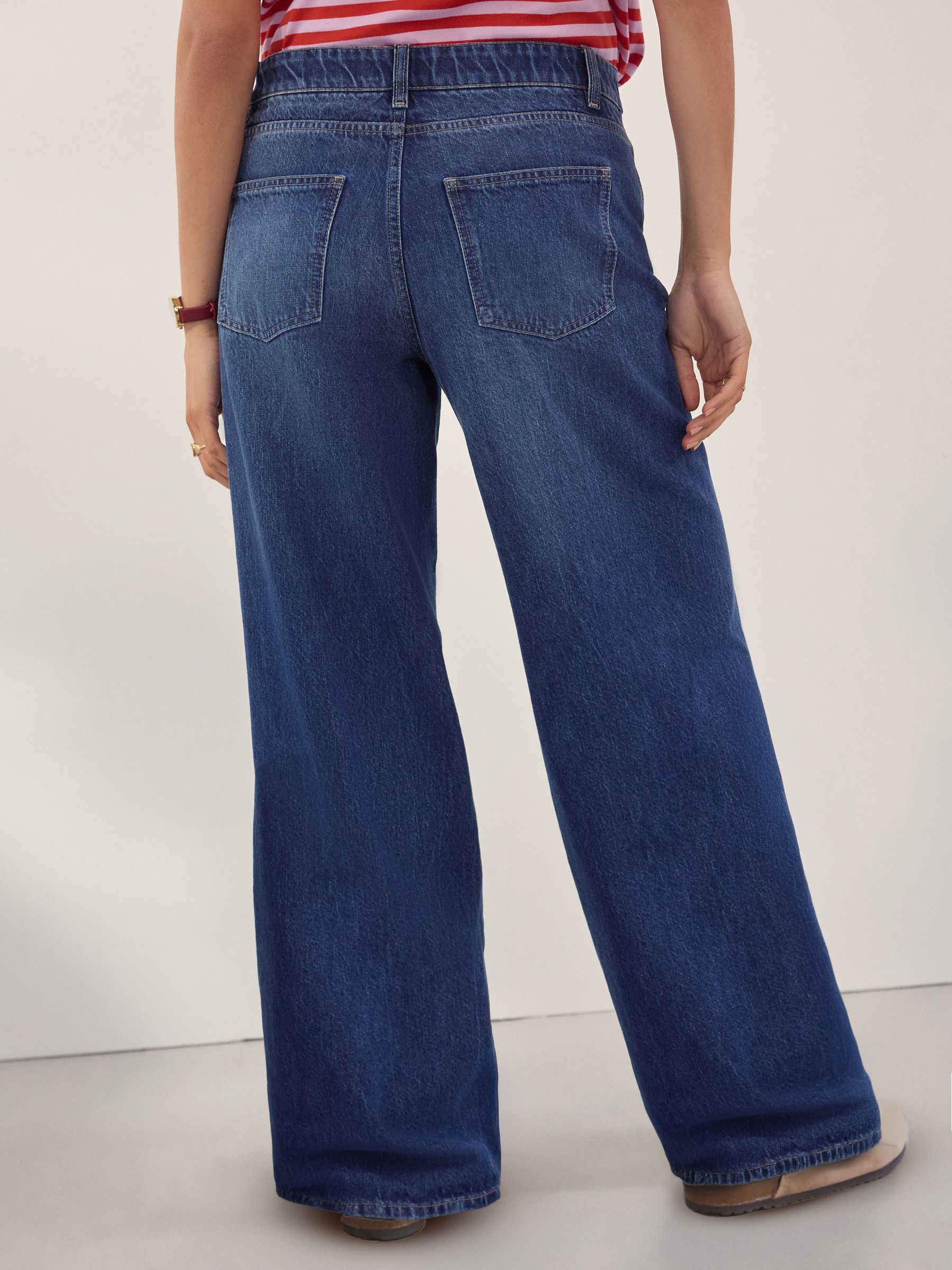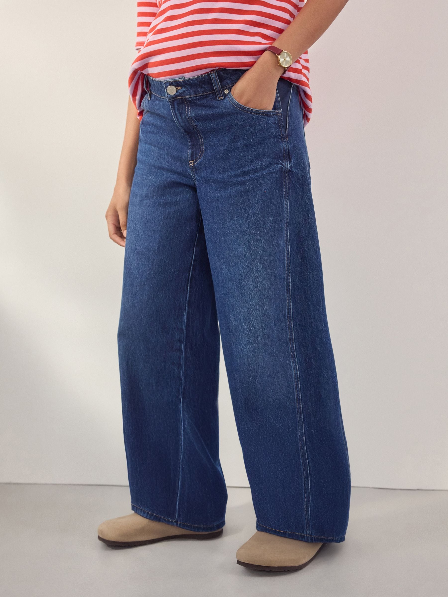 Ideal for your casual outfits during and after pregnancy, these stylish dark blue wide-leg jeans have elasticated inserts to the side for an added stretch that moves with your bump, crafted from pure cotton denim with pockets and a button and zip fastening.