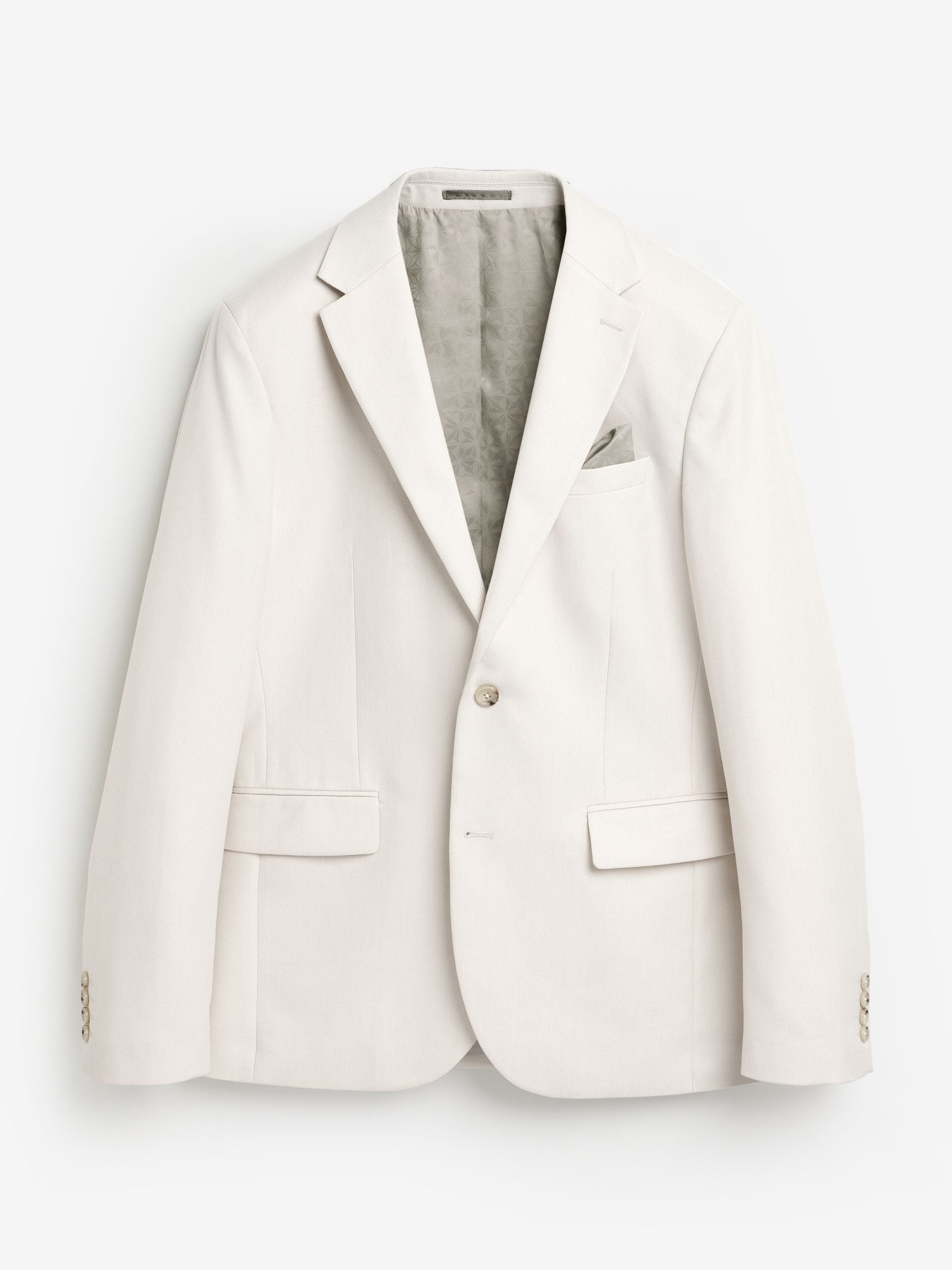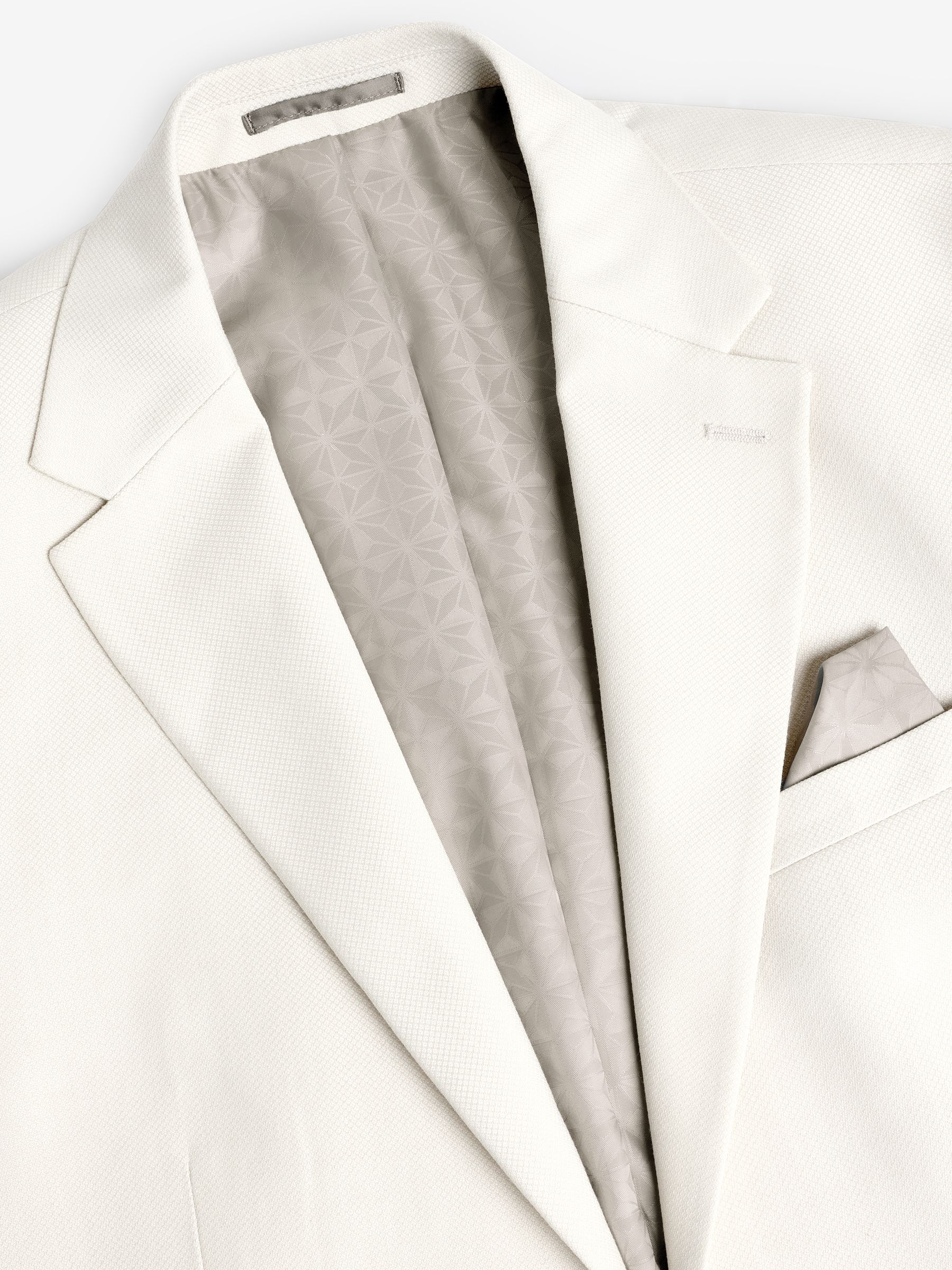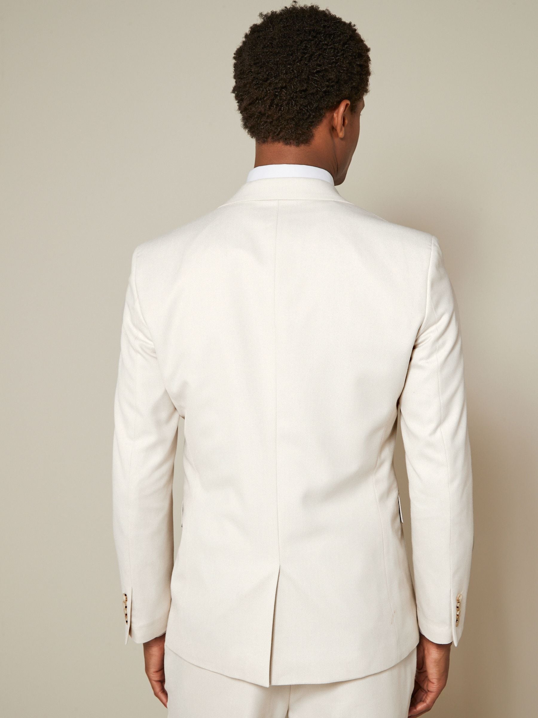 Inspired by silhouettes from London’s famous home of tailoring, our textured suit jacket in ecru offers a sleek, slim fit in an elegant single-breasted design. Notched lapels, printed lining, flap pockets, a 4 button cuff and contrast pocket square ensure a perfectly tailored look. Switch up your brogues and shirt for a fine knit and trainers for a modern take on refined style. Textured suit jacket Slim fit Single breasted Notched lapels Button-up fastening Front pockets Pull-out pocket square Printed lining Main 62% Recycled polyester, 35% Viscose, 3% Polyester. Lining 100% Recycled polyester.