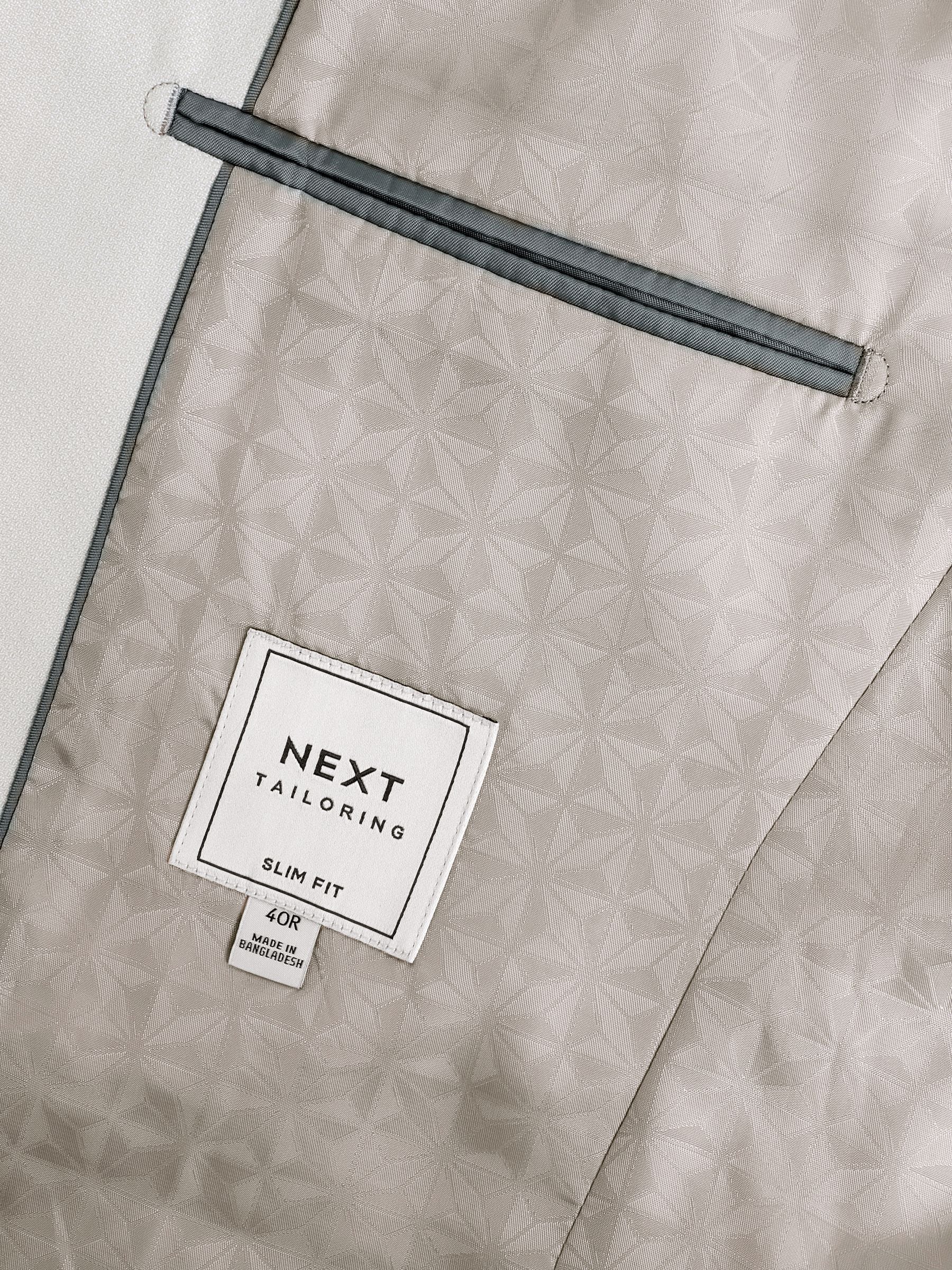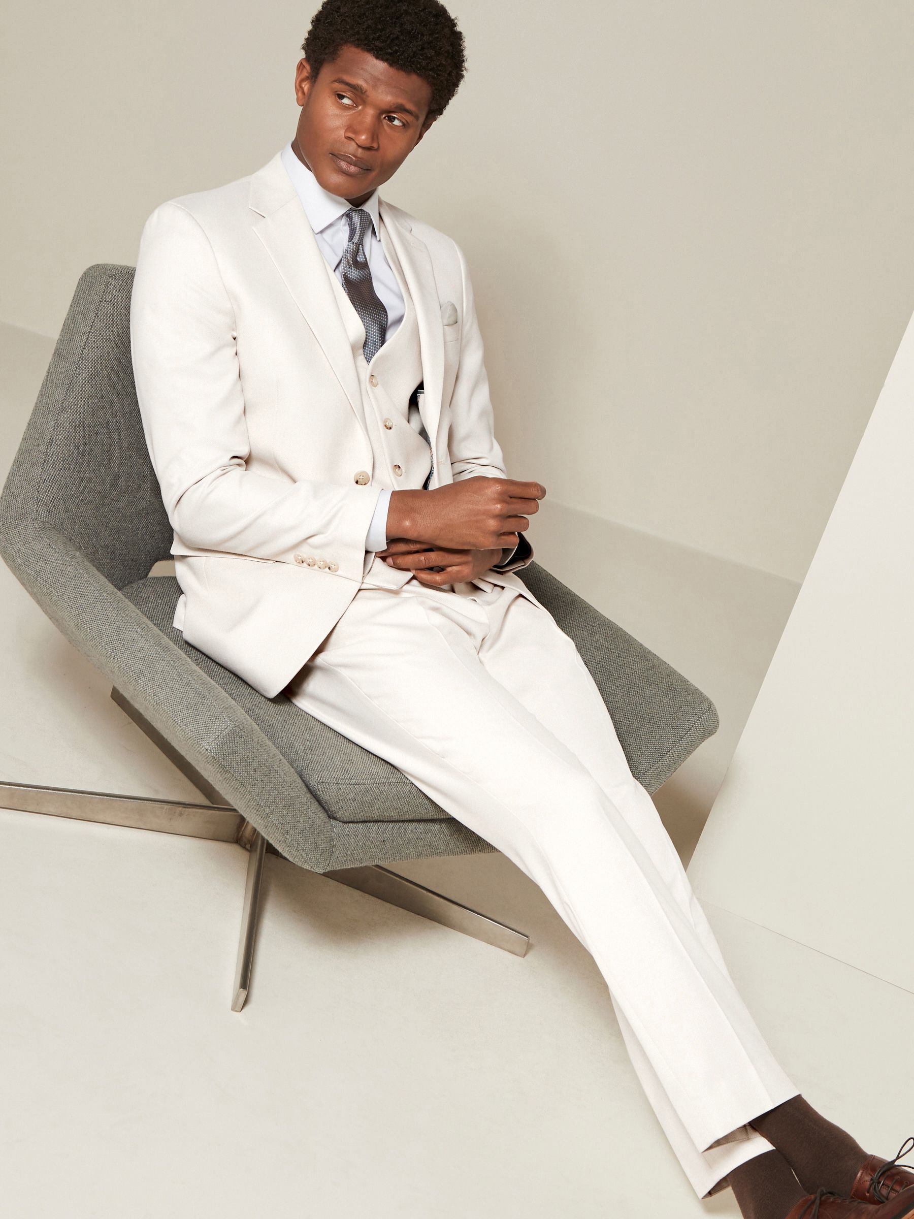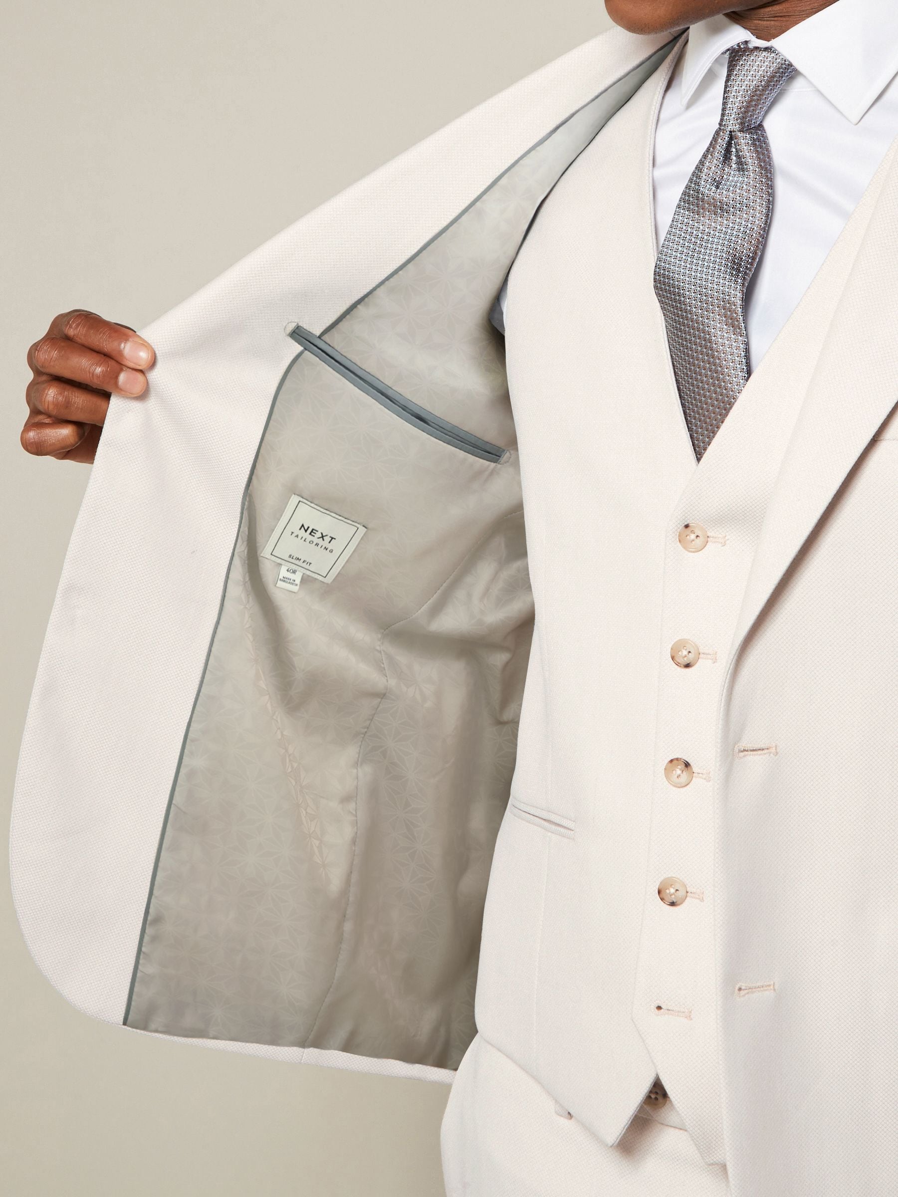 Inspired by silhouettes from London’s famous home of tailoring, our textured suit jacket in ecru offers a sleek, slim fit in an elegant single-breasted design. Notched lapels, printed lining, flap pockets, a 4 button cuff and contrast pocket square ensure a perfectly tailored look. Switch up your brogues and shirt for a fine knit and trainers for a modern take on refined style. Textured suit jacket Slim fit Single breasted Notched lapels Button-up fastening Front pockets Pull-out pocket square Printed lining Main 62% Recycled polyester, 35% Viscose, 3% Polyester. Lining 100% Recycled polyester.