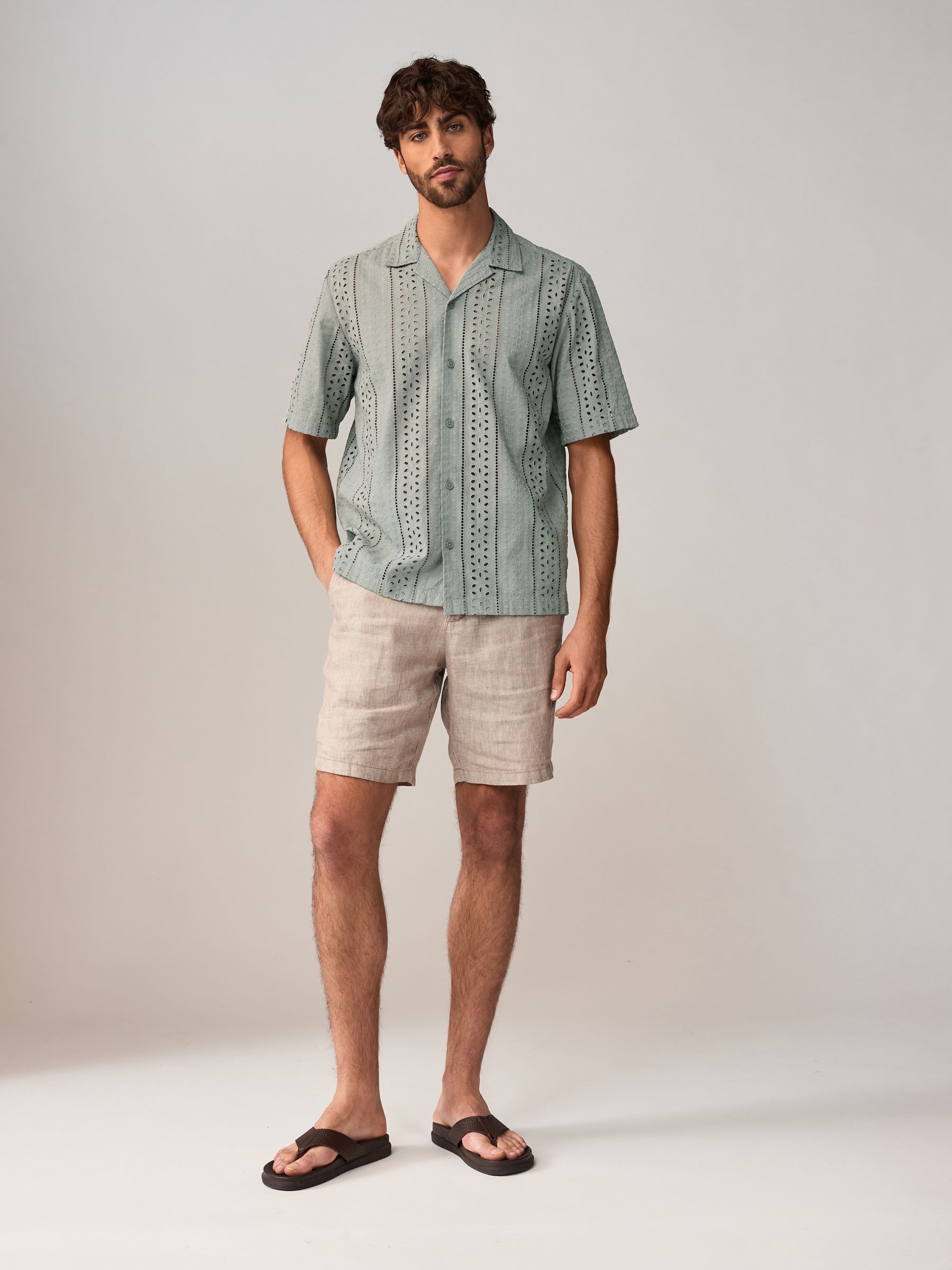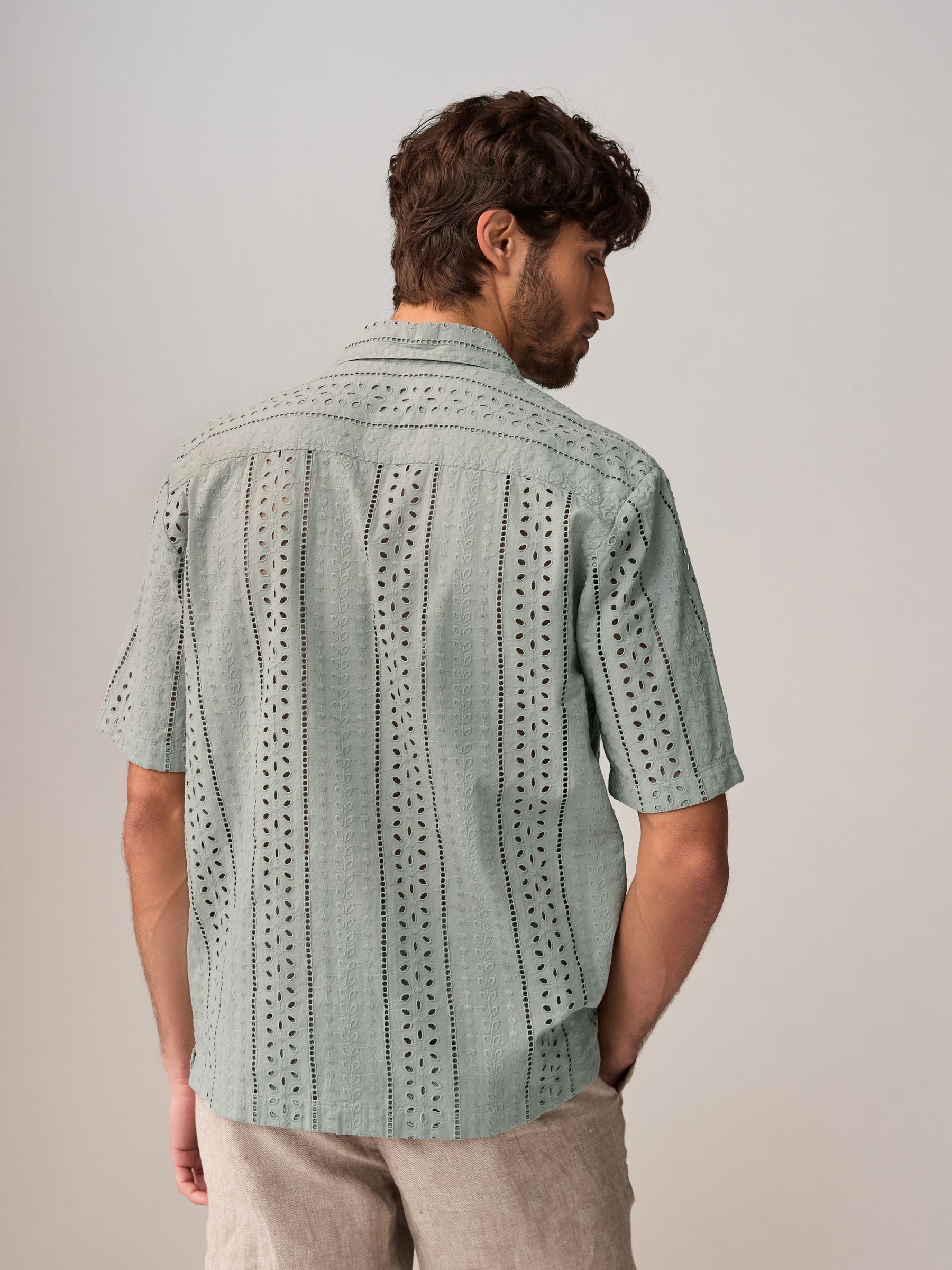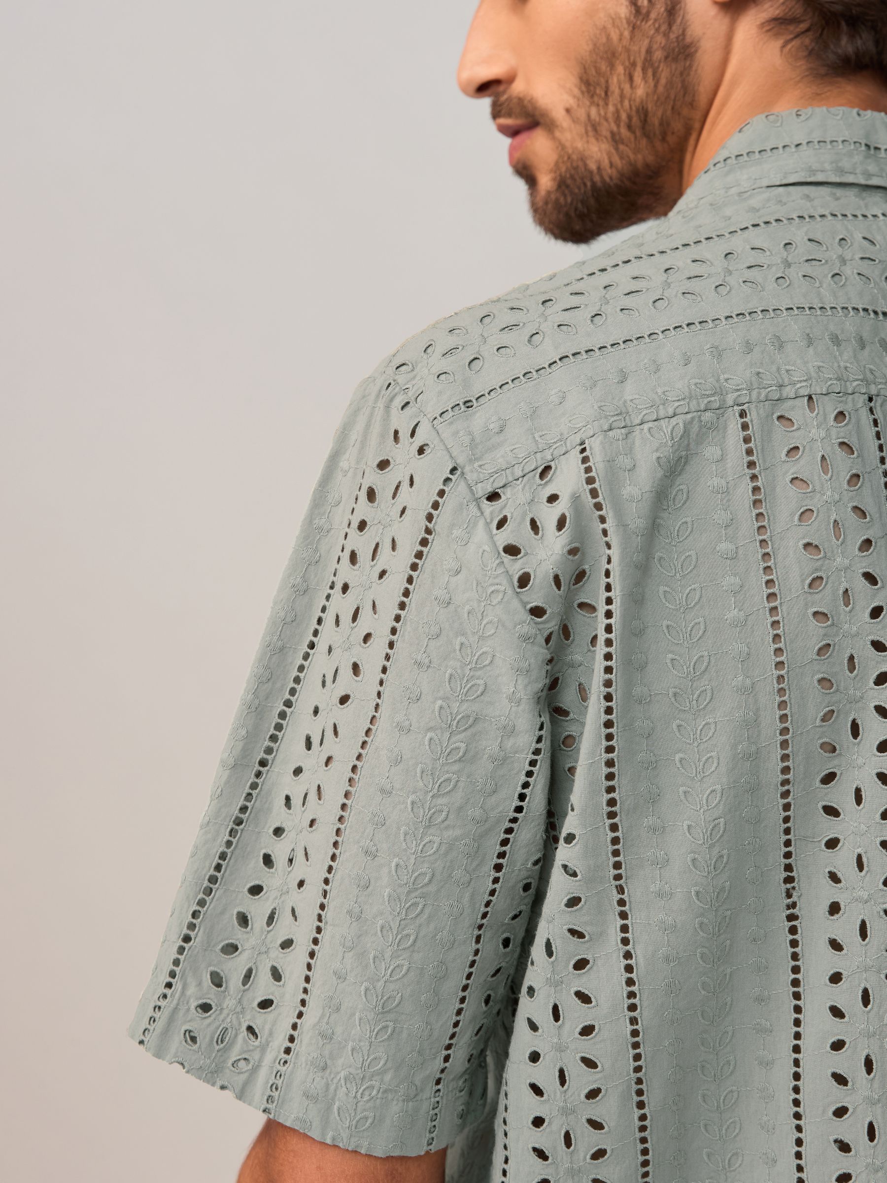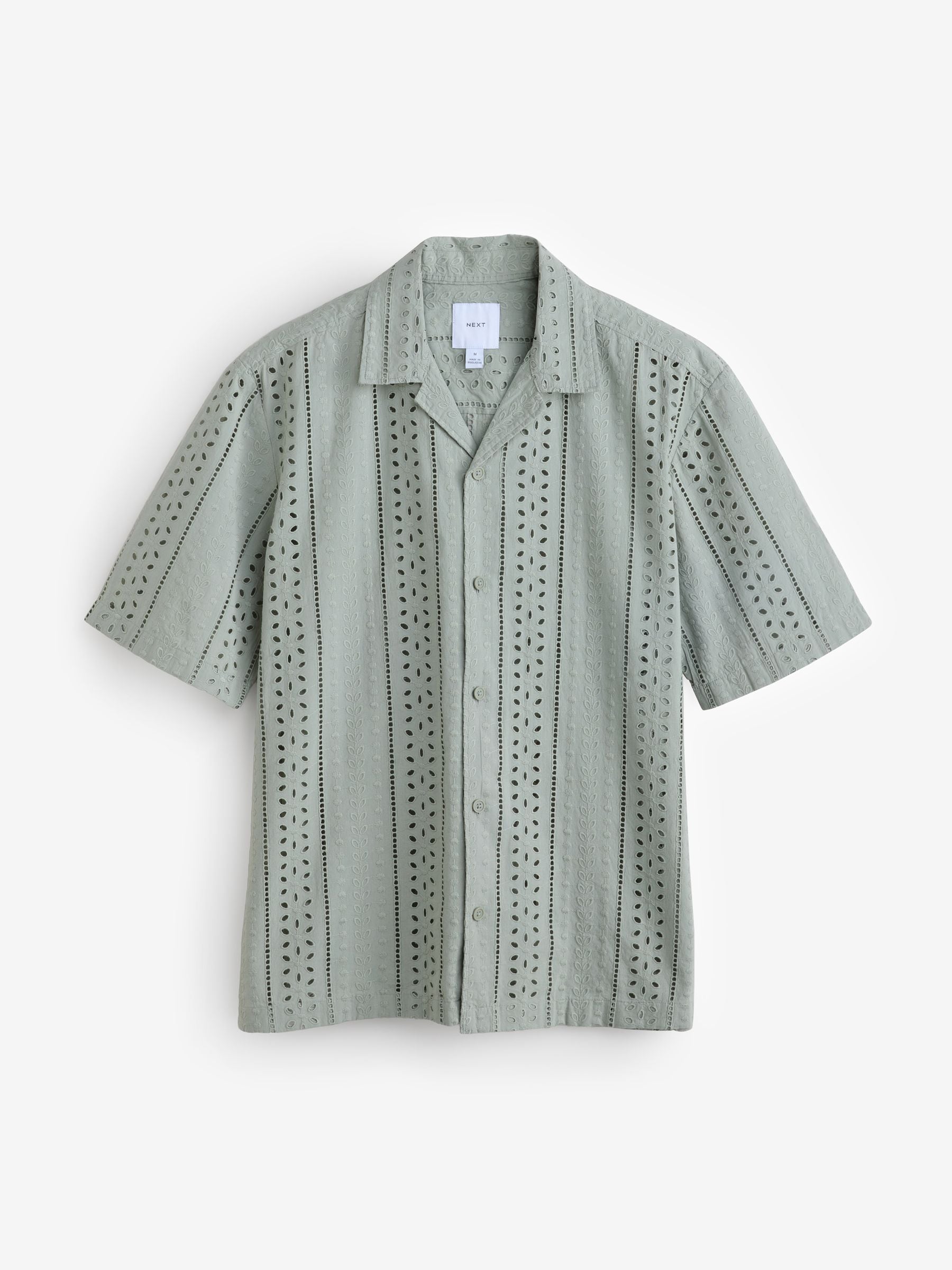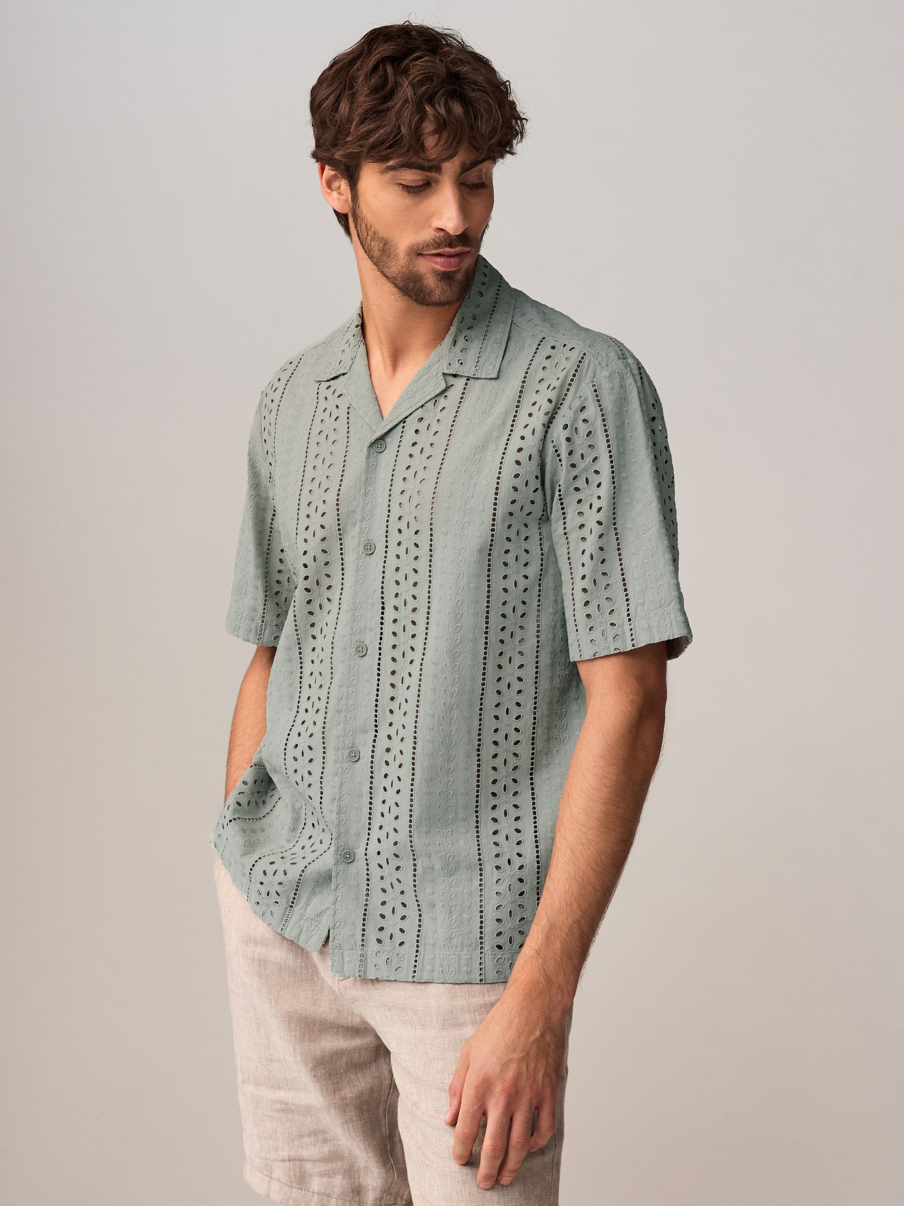Sharpen your summer style with this green textured broderie short-sleeved shirt. Made in pure cotton with a regular fit, this button-down shirt is designed with textured broderie detailing for added flair and is complete with a Cuban collar. 100% cotton Broderie design Short sleeves Button-down fastening Cuban collar Machine washable. 100% Cotton.