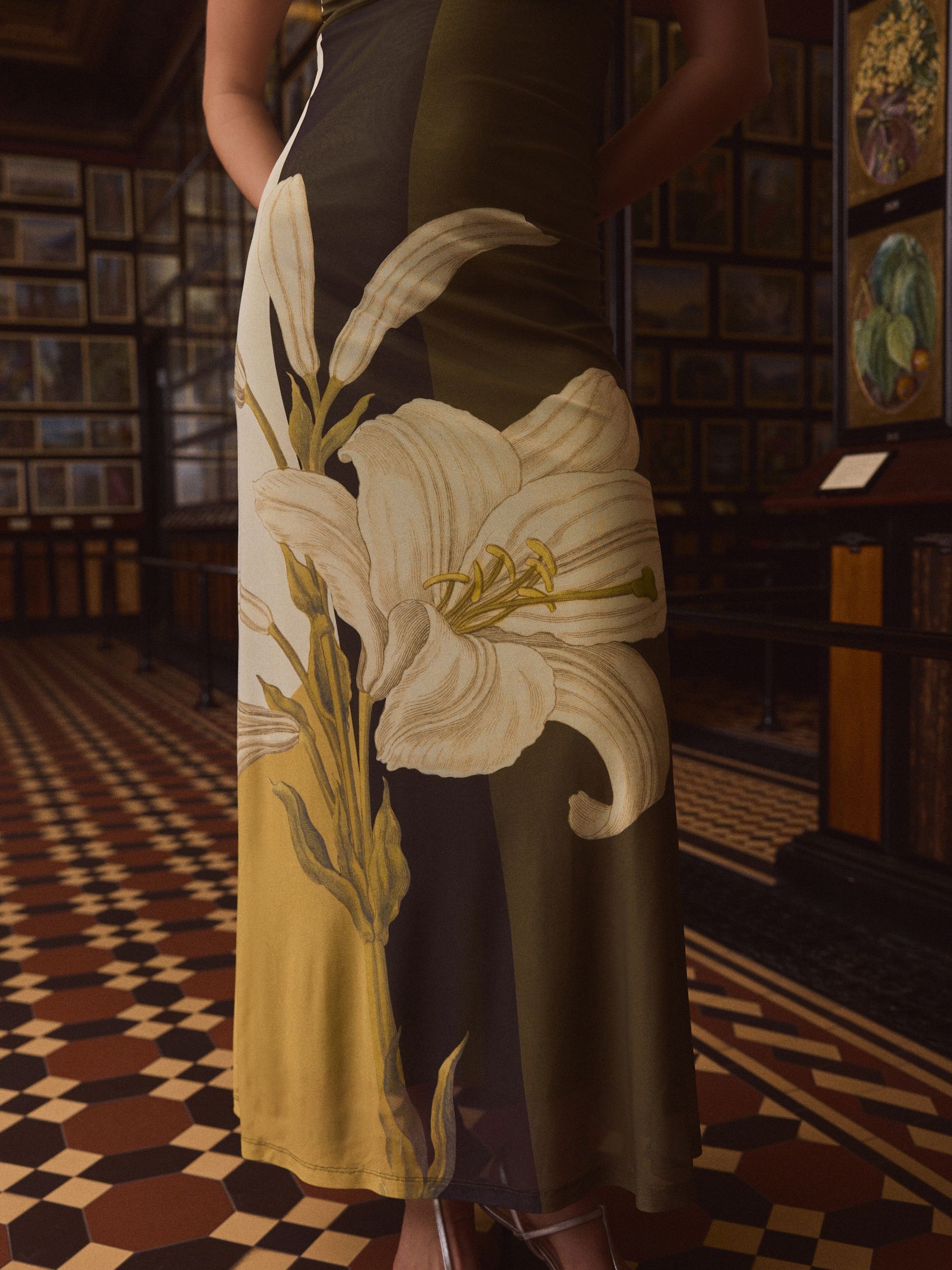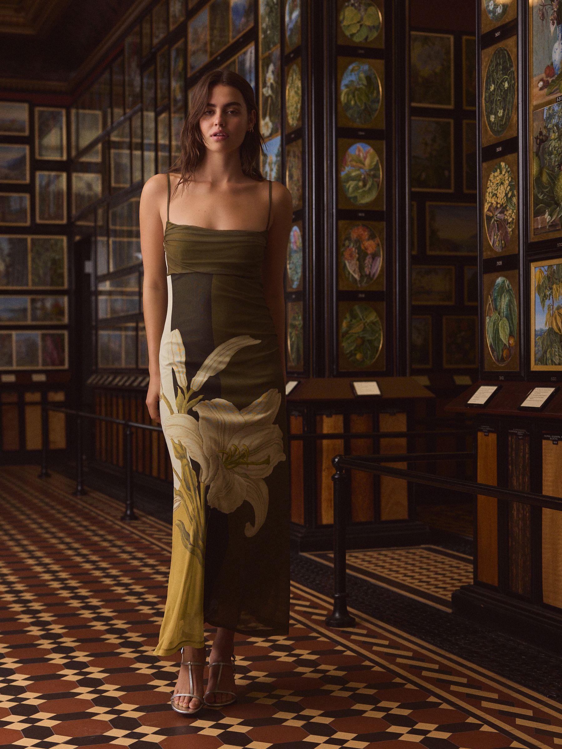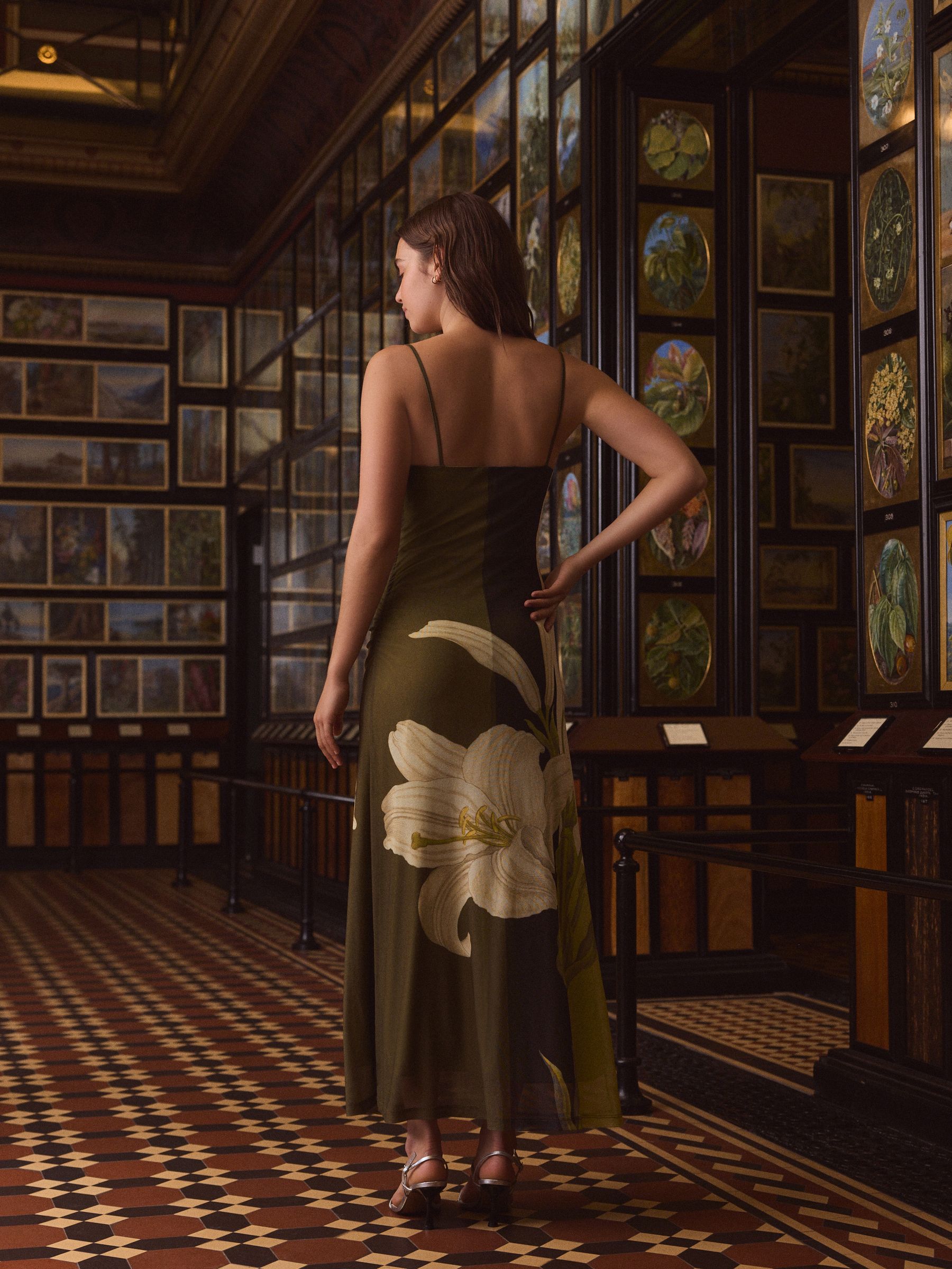 This gorgeous slip-style dress has an elegant cowl neck and a flattering column shape, featuring thin shoulder straps and a statement floral print inspired by the Royal Botanical Gardens, as part of the Kew collection.