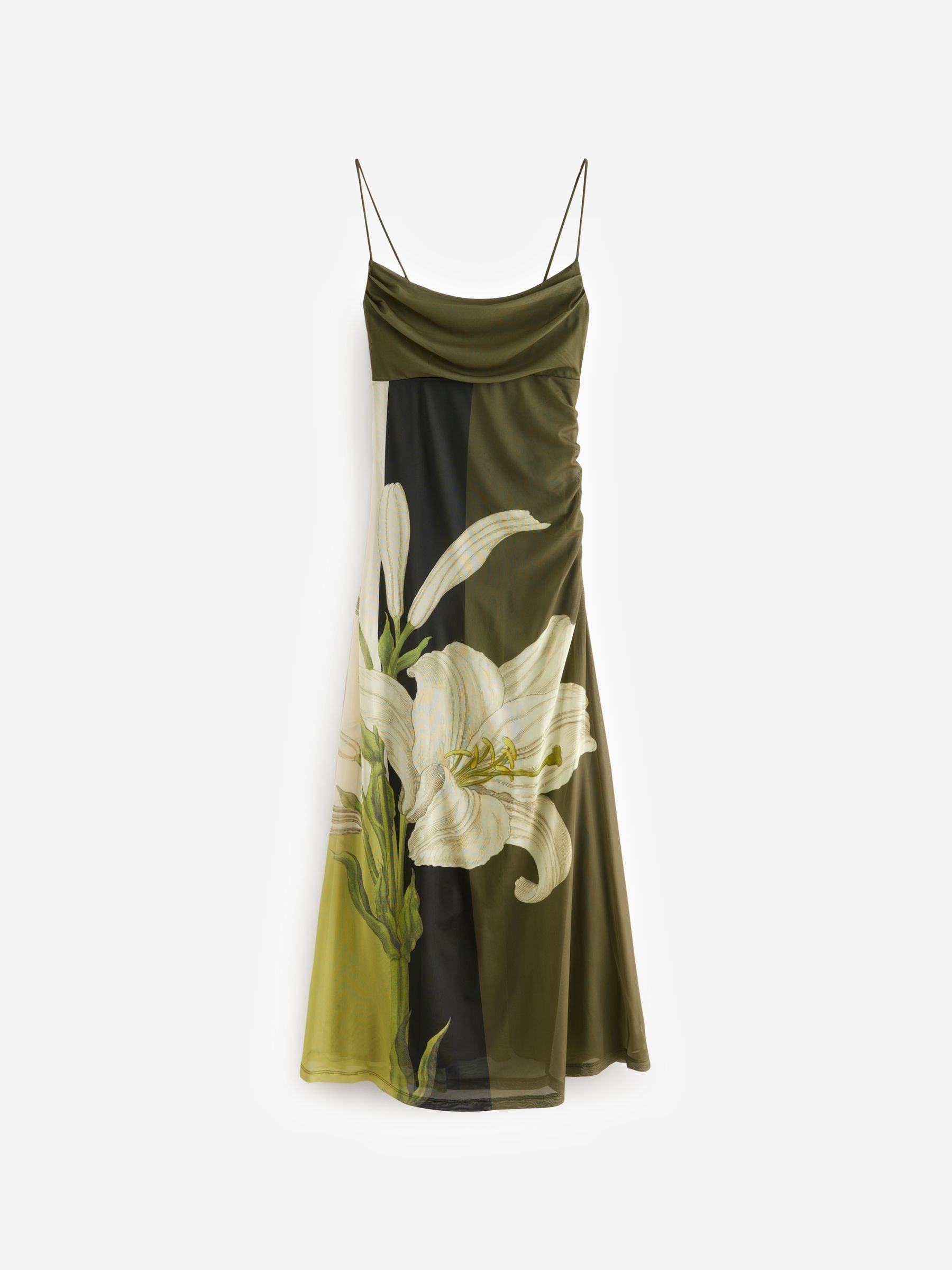 This gorgeous slip-style dress has an elegant cowl neck and a flattering column shape, featuring thin shoulder straps and a statement floral print inspired by the Royal Botanical Gardens, as part of the Kew collection. Bring the outside in with our stunning womenswear Kew Collection by Next. Crafted using botanical prints from the archives at the Royal Botanic Gardens, Kew, discover this elegant collection filled with special occasion pieces made for all of your summer events. With profits from this collection supporting RBG Kew’s vital work, this is a range designed to make you feel and look good this season. Slip dress Column shape Thin shoulder straps Floral print Kew collection Machine washable. Main 95% Recycled polyester, 5% Elastane. Lining 100% Recycled polyester. Our tall collection is designed to fit women 5’10” and above. This has been proportionally increased through the body, leg and sleeve to achieve the perfect fit. Available in sizes 8-20., Items with the curve logo are available in sizes 18 and above., Contains recycled polyester certified to the Recycled Claim Standard 100 (RCS 100) which verifies the percentage of recycled material and tracks it from the recycler to the final product. This product contains 95-100% certified recycled polyester, with the exact % shown in the product composition above. See individual on-product labelling for full certification details