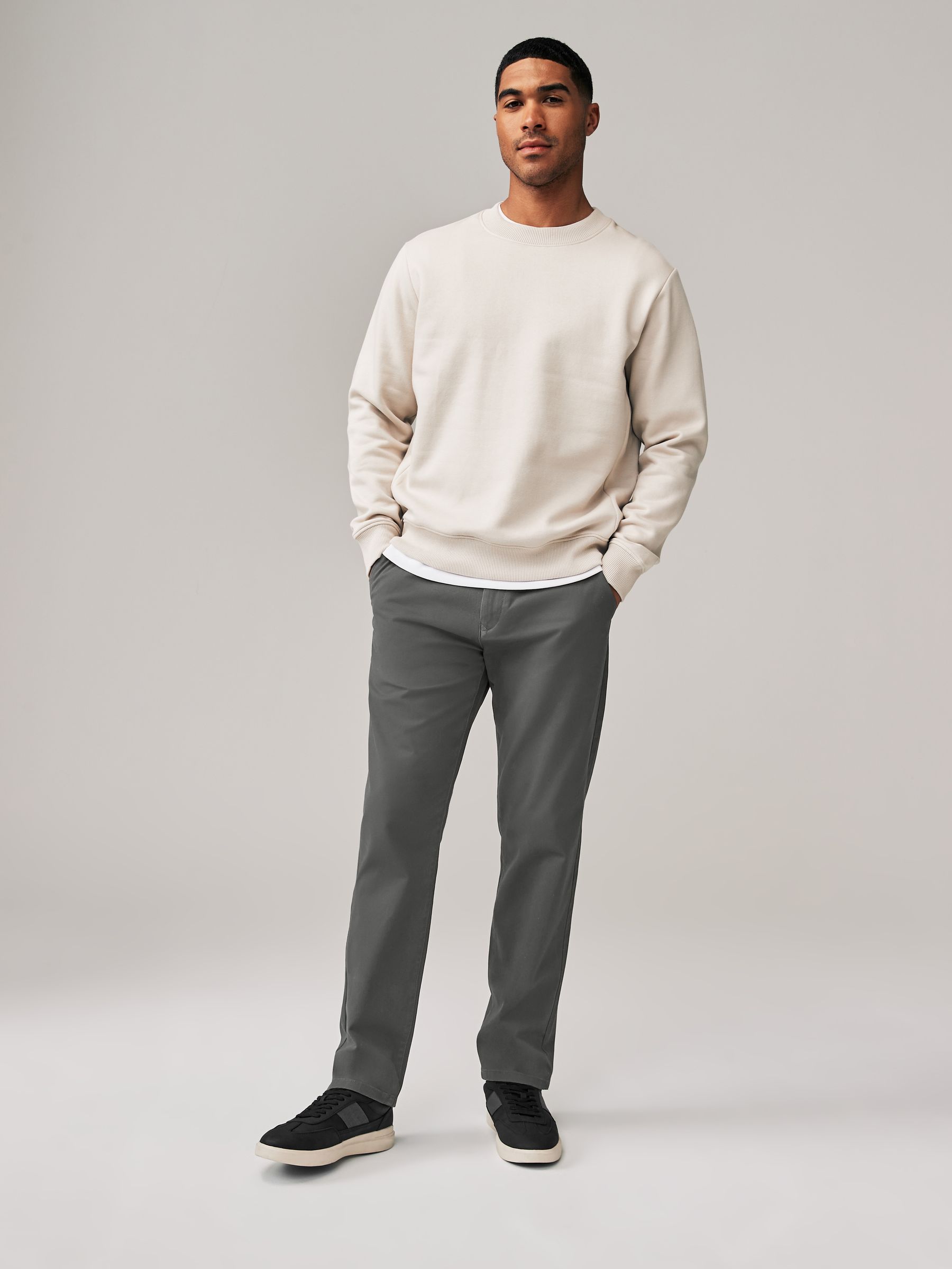 This easy-to-style dark grey chino trousers is a wardrobe classic you’ll reach for on repeat. Designed in a stretch cotton fabric for all-day comfort, the relaxed chino silhouette can be dressed up just as easily as it can be dressed down. Style with an Oxford shirt and a timeless boat shoe for effortless cool. Straight fit chinos are designed with no shaping on the side seams and fall super straight from the seat to hem. Perfect for a more laidback and relaxed feel. Machine washable. 98% Cotton, 2% Elastane. Better Cotton – By choosing our cotton products, you’re supporting our investment in Better Cotton’s mission to help cotton farming communities survive and thrive while protecting and restoring the environment. This product is sourced via a system of mass balance and therefore may not contain Better Cotton. Learn more at www.next.co.uk/better-cotton