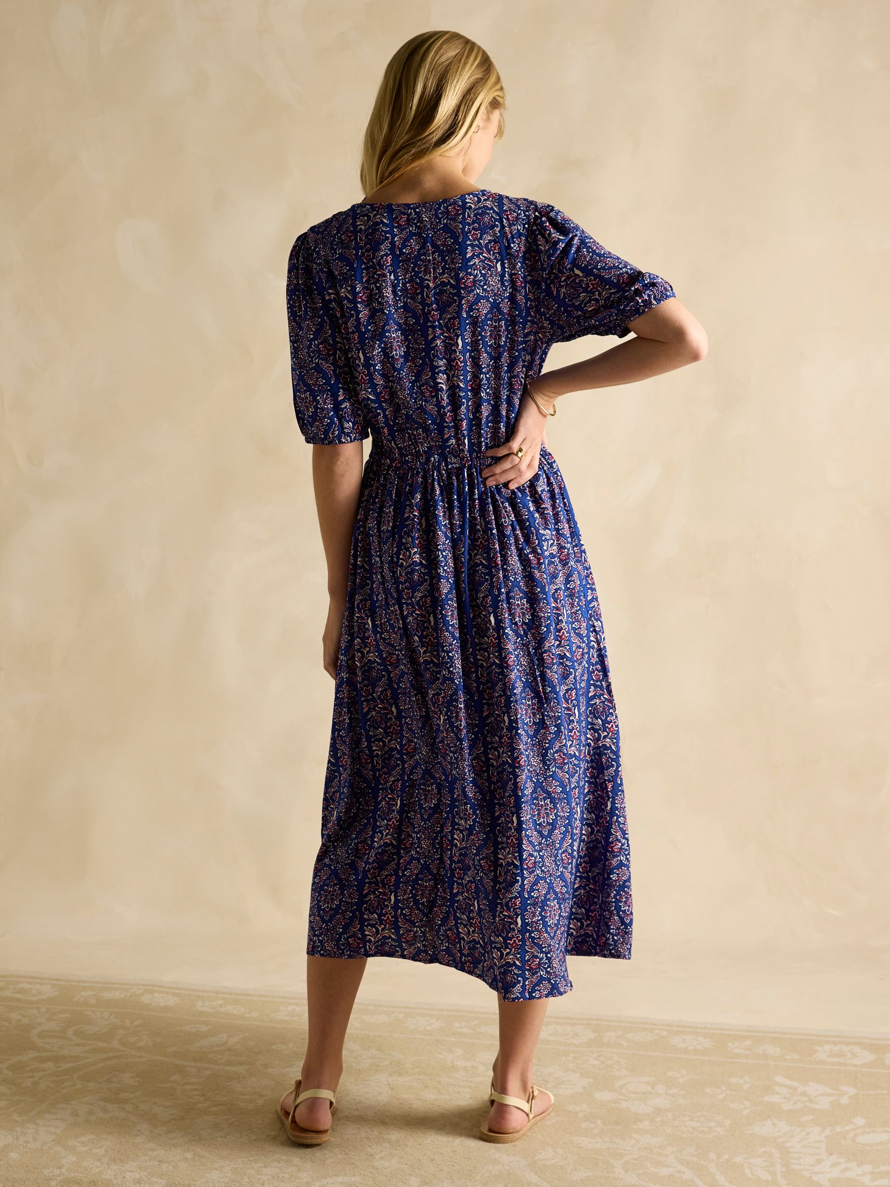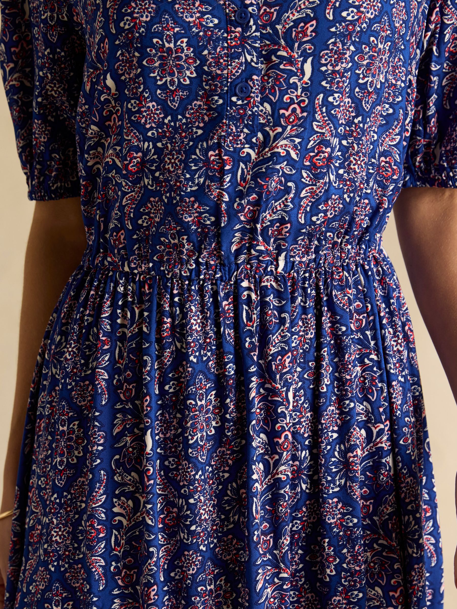 If you need an excuse to treat yourself to a new dress, choose one that can be part of your year-round wardrobe. Versatile for all months, our Adele dress can be layered or worn alone. It has pretty sleeves that sit at elbow length with gentle gathers and elasticated cuffs. The flattering round neckline features a five-button placket. For a flattering fit, there’s an elasticated waist, and the side split in the skirt offers a contemporary touch. It’s finished in a hand-drawn print that will sit back with any season. Midi length. Elbow-length sleeves. Elasticated waist and cuffs. Round neckline. Button-down placket to the bodice. Side split to the skirt. Hand-drawn print