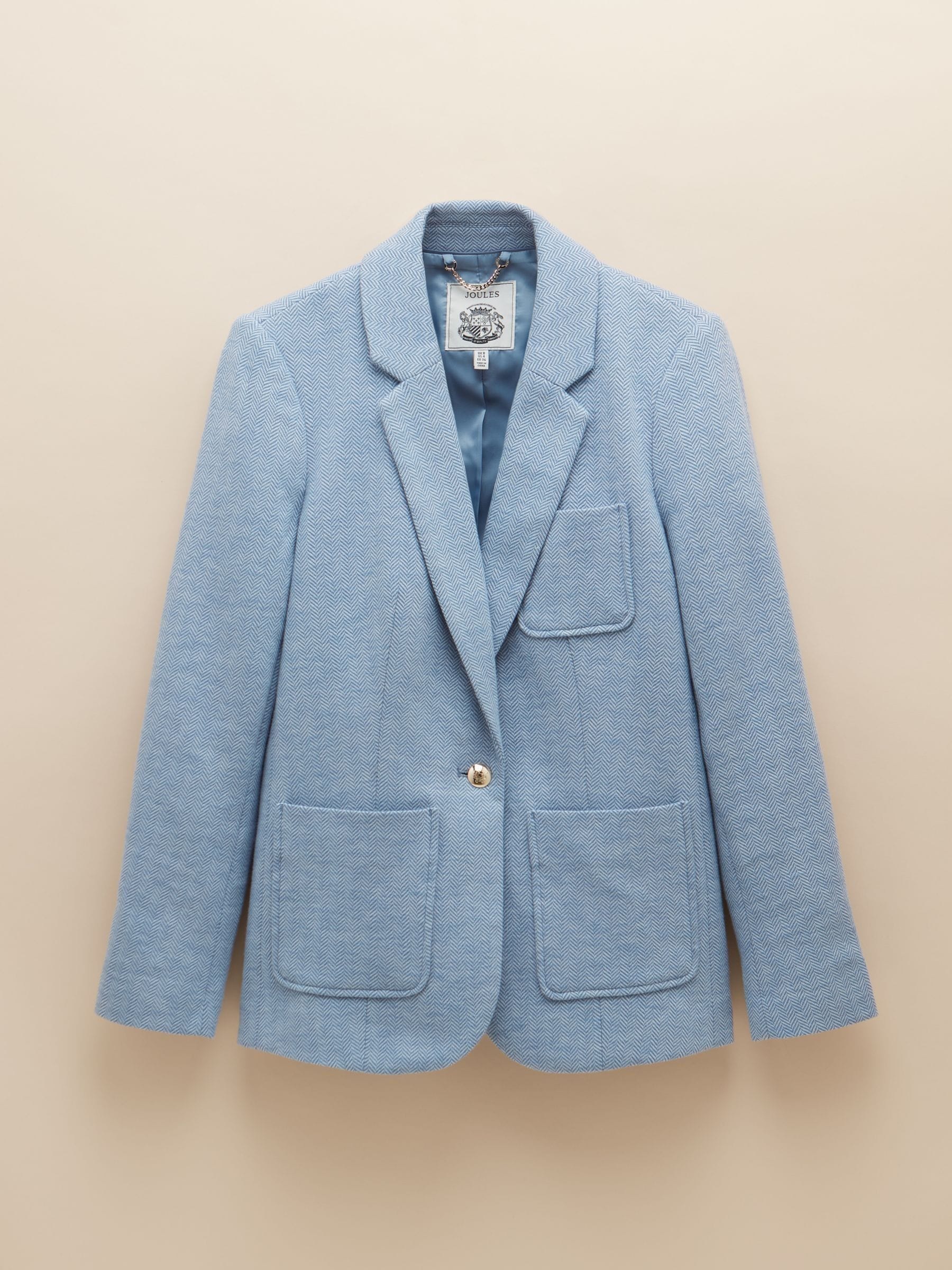 This preppy piece carries a collegiate appearance through its neat structured fit, soft cotton jersey fabric and single-button fastening. It features two front pockets with a classic single chest pocket, kissing buttons to the cuffs and a lapel collar. The pink colour palette will elevate any outfit, while its subtle padding to the shoulders creates a feminine shape. It’s finished with a chain hanging loop to the back neck and Joules branded undercollar embroidery which is revealed when you pop the collar. Cotton jersey. Neat, structured fit. Light padding on the shoulders. Single button fastening. Lapel collar. Kissing buttons to the cuffs. Two front pockets and an additional chest pocket. Joules embroidery under the collar. Chain hanging loop to the back neck