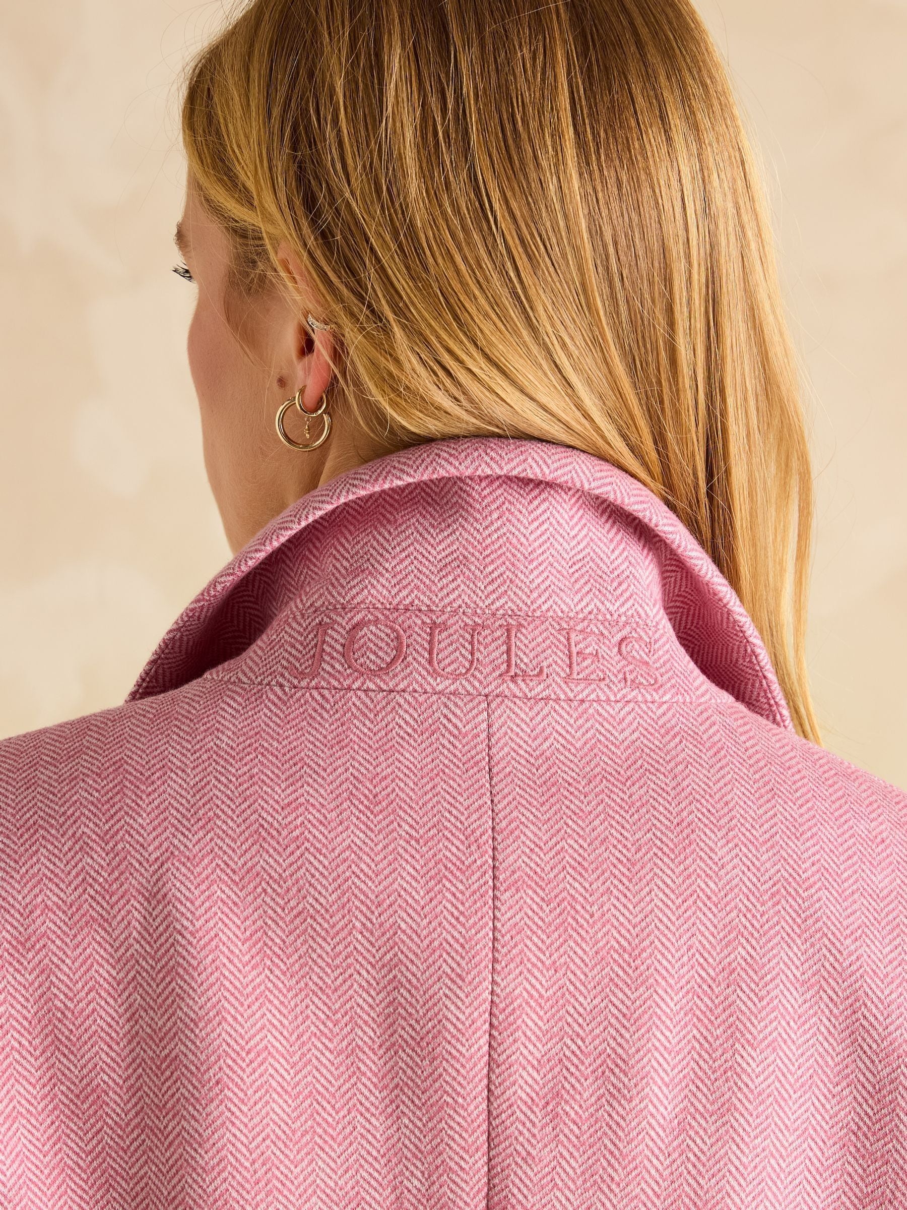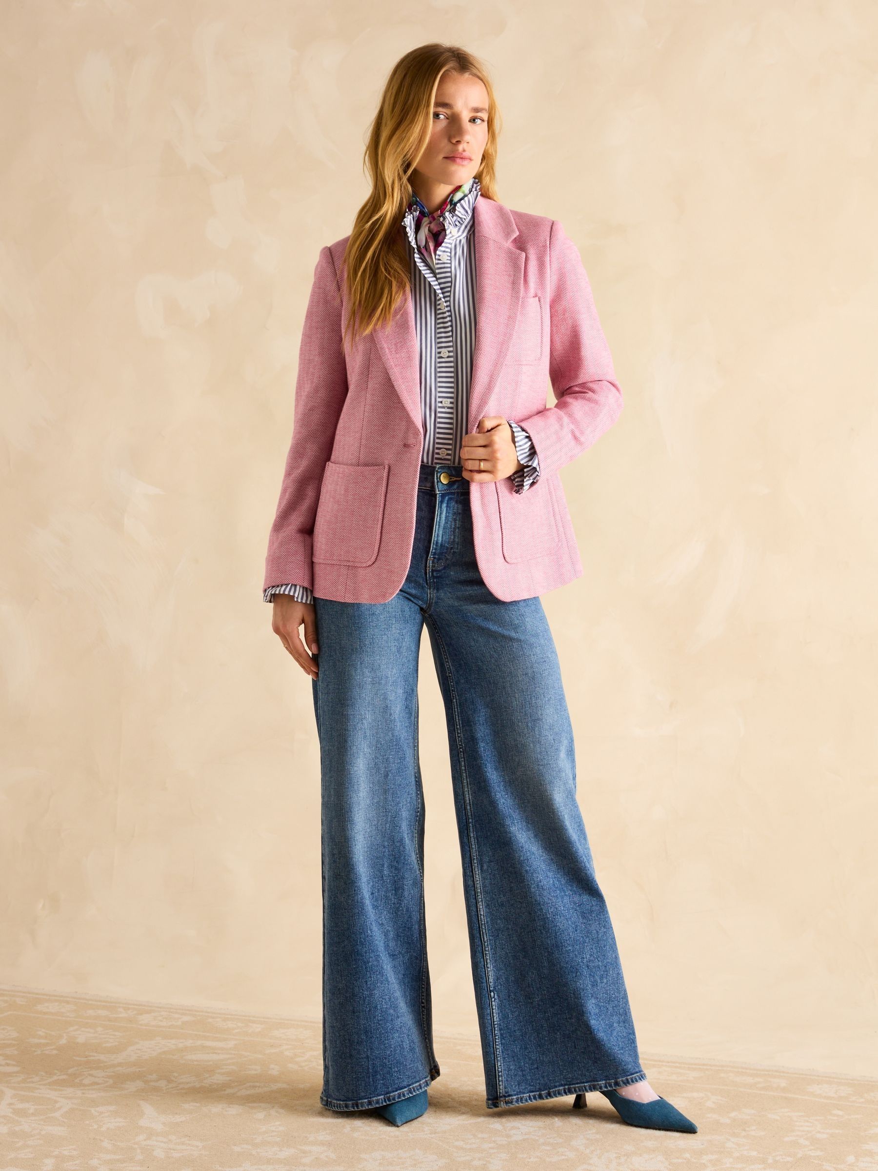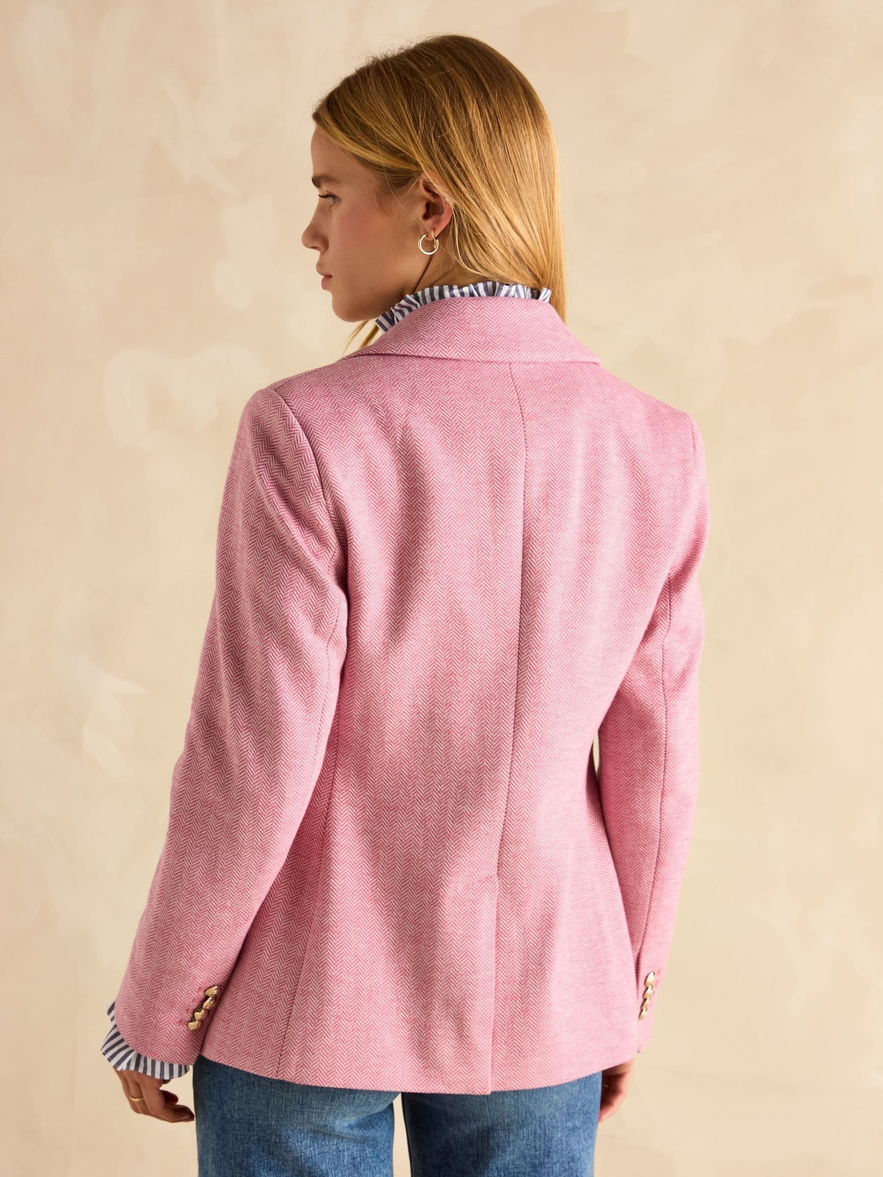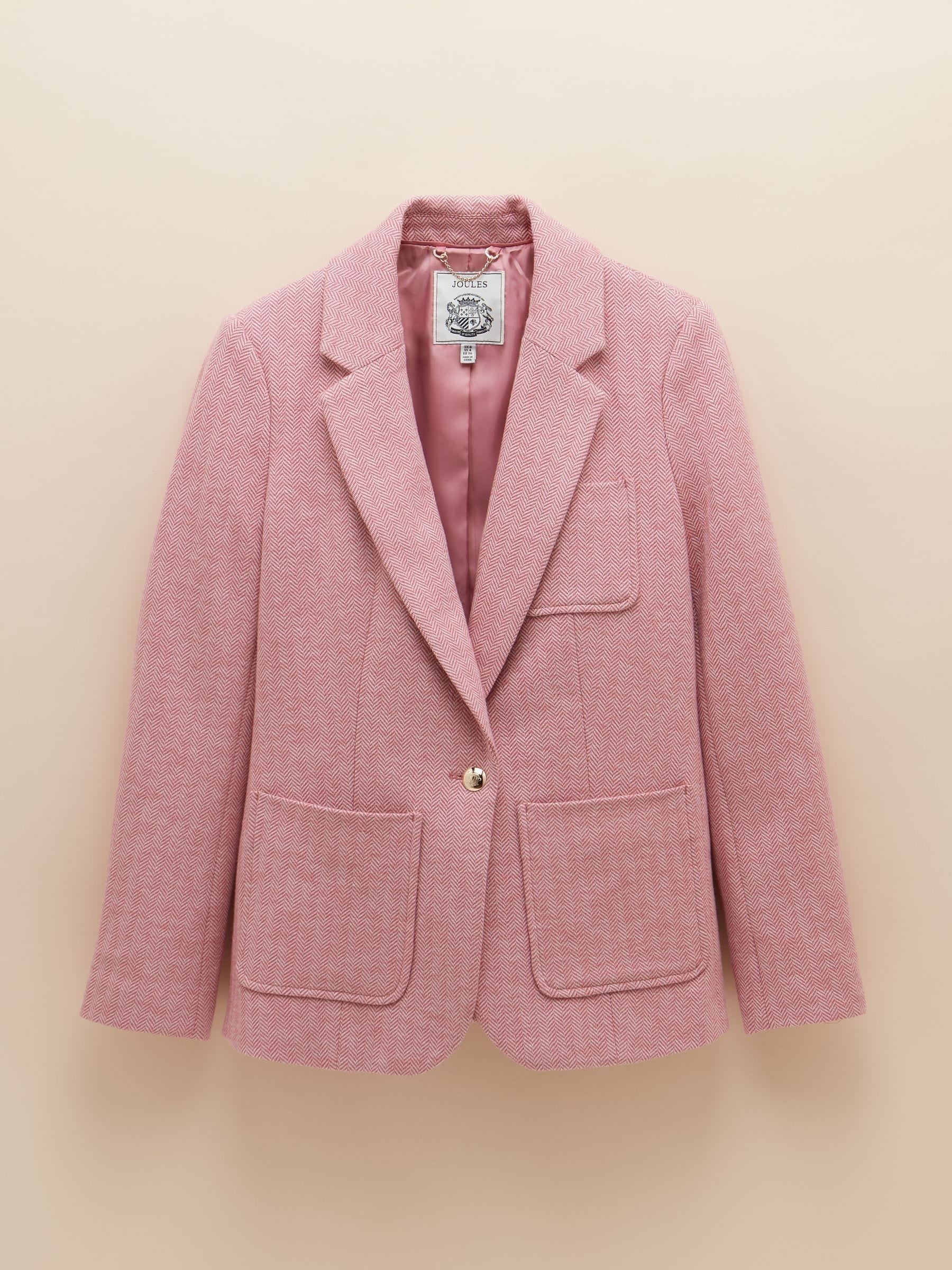 This preppy piece carries a collegiate appearance through its neat structured fit, soft cotton jersey fabric and single-button fastening. It features two front pockets with a classic single chest pocket, kissing buttons to the cuffs and a lapel collar. The pink colour palette will elevate any outfit, while its subtle padding to the shoulders creates a feminine shape. It’s finished with a chain hanging loop to the back neck and Joules branded undercollar embroidery which is revealed when you pop the collar. Cotton jersey. Neat, structured fit. Light padding on the shoulders. Single button fastening. Lapel collar. Kissing buttons to the cuffs. Two front pockets and an additional chest pocket. Joules embroidery under the collar. Chain hanging loop to the back neck