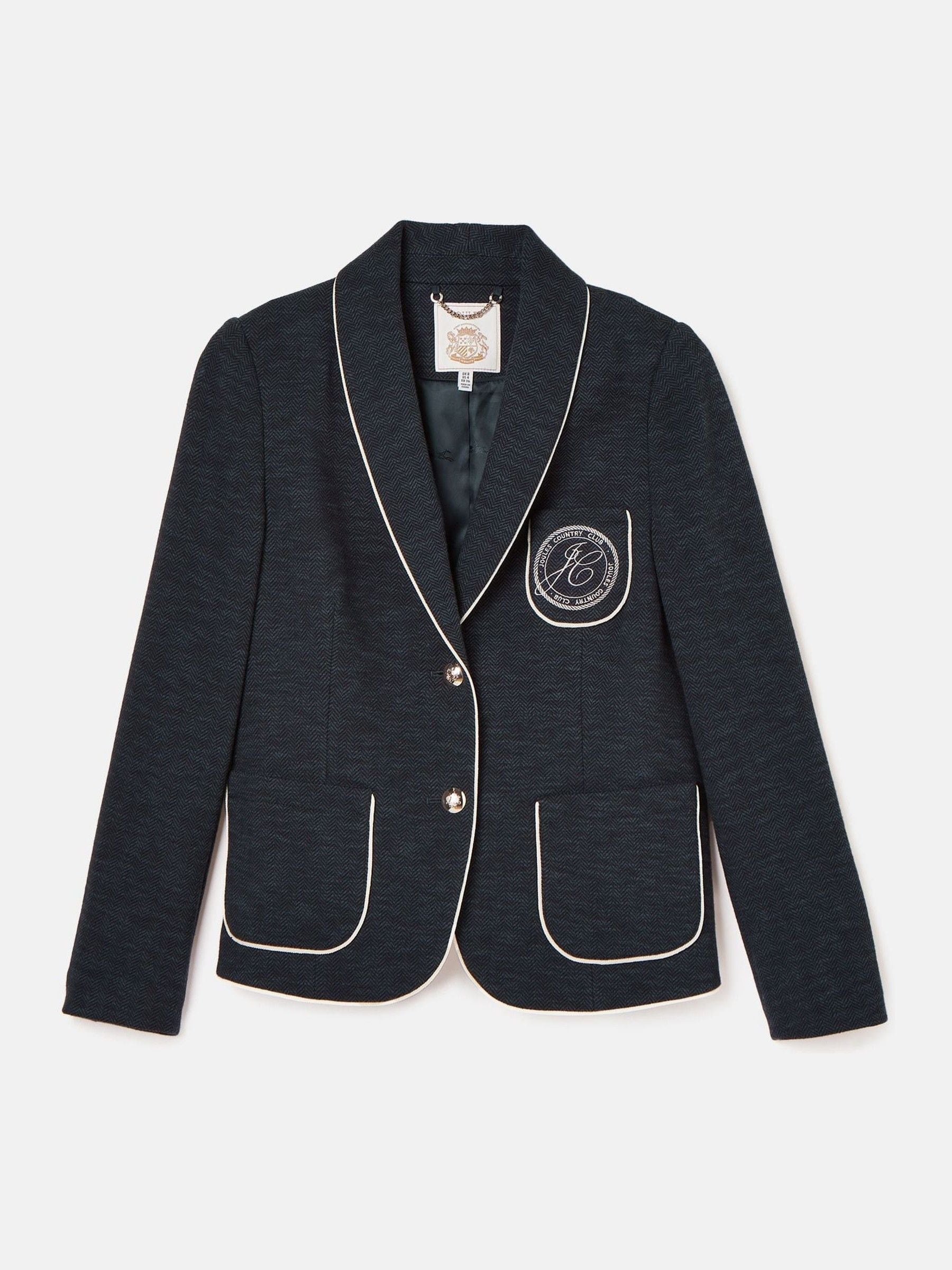 Cut from a quality cotton herringbone fabric and carrying a structured fit through the body, the Hartley blazer will make a style statement. Designed to be dressed up or down, it is single breasted with two metal button fastenings, has a distinctive shawl-style collar and piped trims that add contrast throughout. It features two front patch pockets, a single chest pocket with Joules Country Club embroidery and metal kissing buttons to the cuffs. Inside there’s an additional pocket and an equestrian-inspired jacquard lining that gives it that unique-to-Joules finish. Style with a pair of wide leg jeans for an elevated everyday look, or with a blouse for a more formal event. Herringbone fabric. Structured fit with darting through the body. Single breasted. Two metal button fastenings. Shawl-style collar. Metal kissing buttons to the cuffs. Equestrian-inspired jacquard lining with internal pocket. Single chest pocket with Joules Country Club embroidery. Two open patch pockets to the front with piped detailing. Single vent to the back.