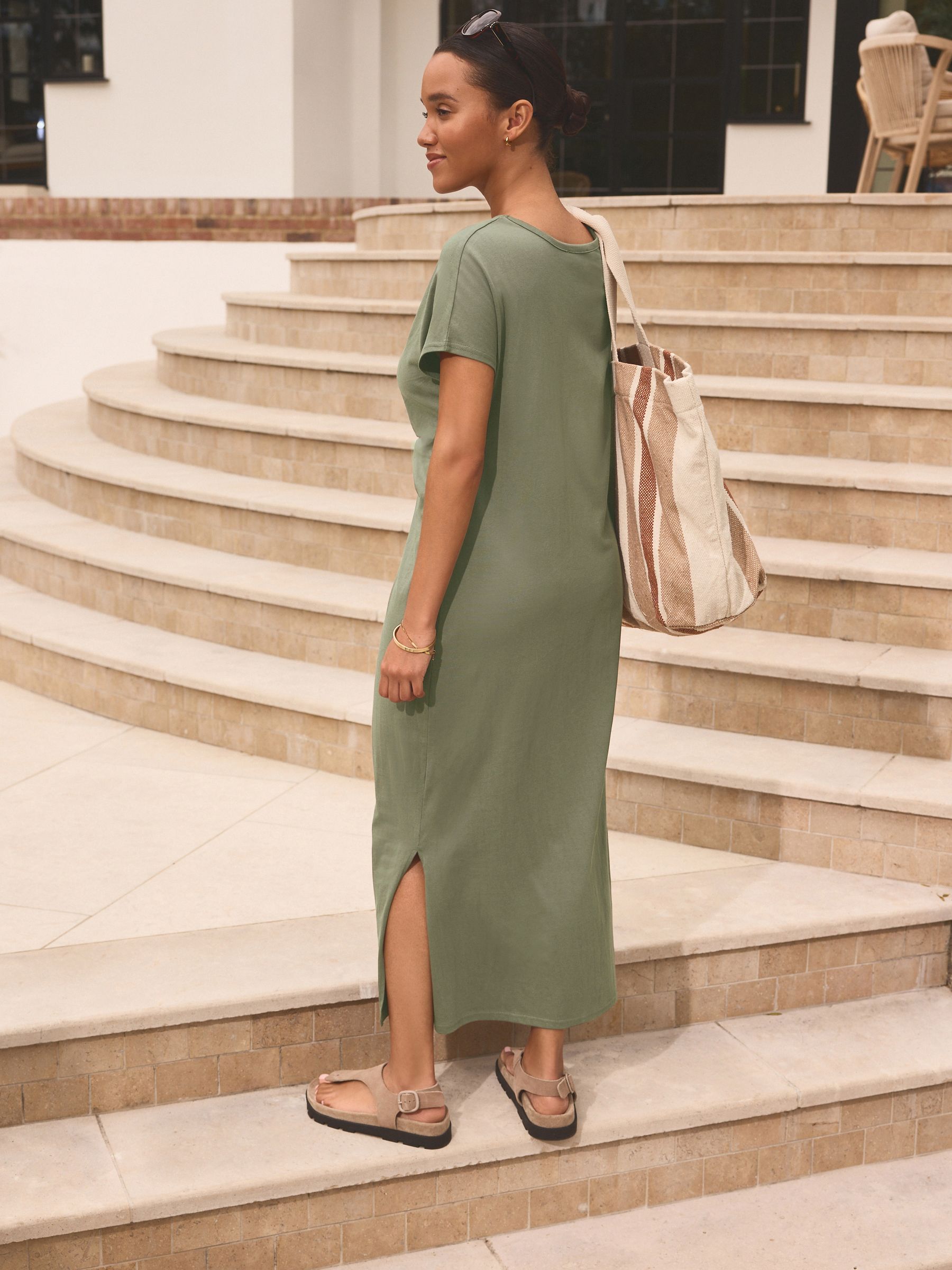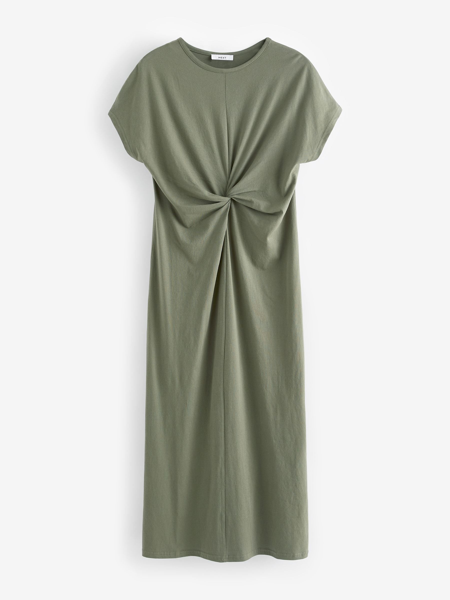 This product has a looser fit than usual. This casual T-Shirt dress in khaki green is crafted from breathable cotton, featuring a crewneck collar, twist detail to the waist and a midi-length. Perfect as a holiday cover-up or for everyday wear. Crewneck collar 100% Cotton Short sleeves Twisted waist detail Midi length 100% Cotton. Our tall collection is designed to fit women 5’10” and above. This has been proportionally increased through the body, leg and sleeve to achieve the perfect fit. Available in sizes 8-20., Items with the curve logo are available in sizes 18 and above.