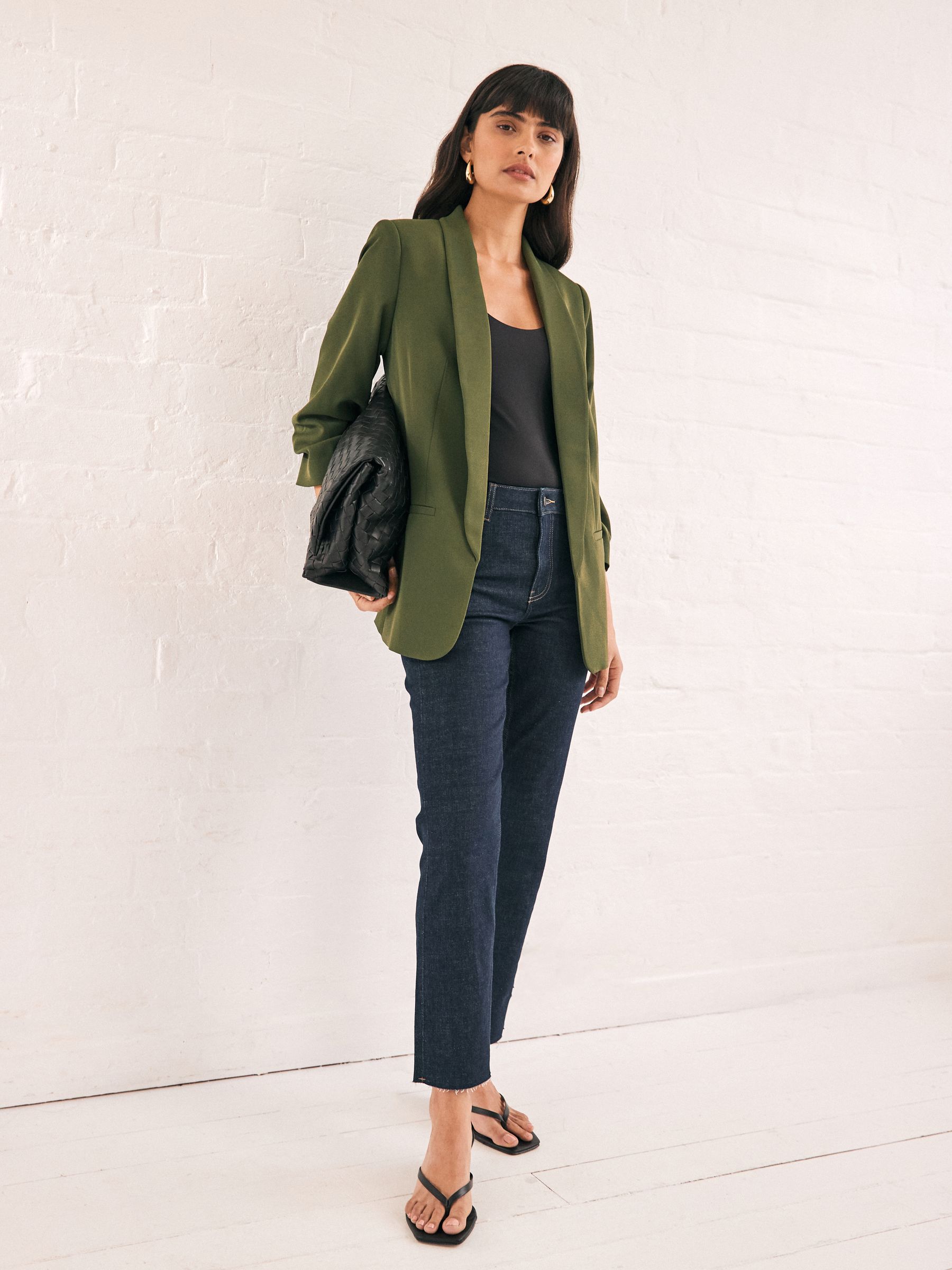 Made from a soft handle fabric, this relaxed green blazer features ruched sleeves, mock welt pockets on the front and seam detail for shaping. This blazer offers a relaxed fit while still looking smart. Simply throw on over jeans and a T-Shirt, or dress up with trousers and a heel. Relaxed fit Soft handle fabric Mock welt pockets Regular centre back neck to hem 27.5″ x 70cm. Machine washable. Main 100% Recycled polyester. Lining 100% Recycled polyester. Our tall collection is designed to fit women 5’10” and above. This has been proportionally increased through the body, leg and sleeve to achieve the perfect fit. Available in sizes 8-20., Items with the curve logo are available in sizes 18 and above.