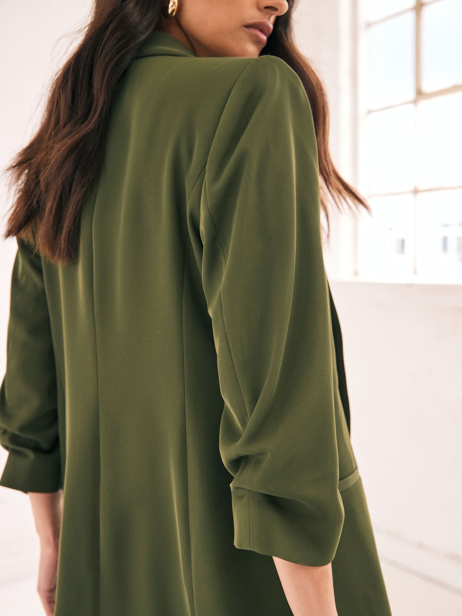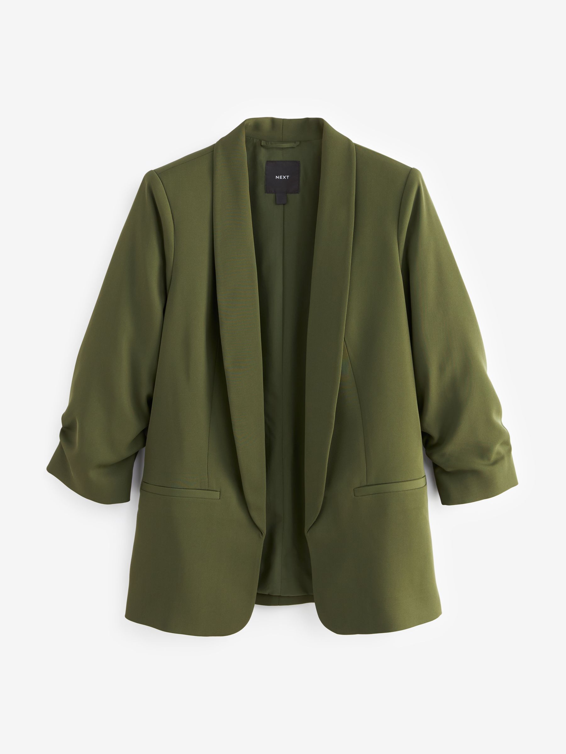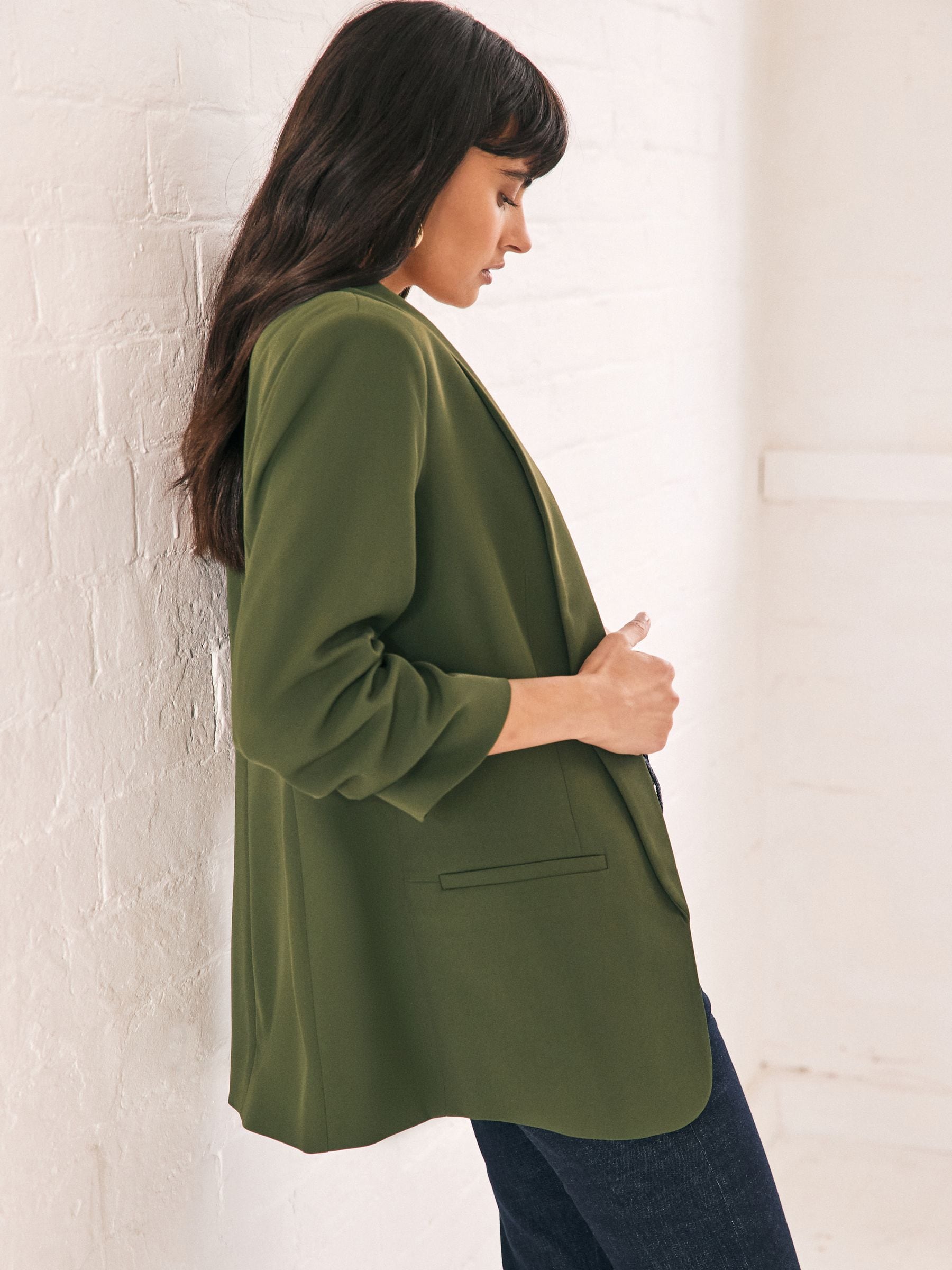 Made from a soft handle fabric, this relaxed green blazer features ruched sleeves, mock welt pockets on the front and seam detail for shaping. This blazer offers a relaxed fit while still looking smart. Simply throw on over jeans and a T-Shirt, or dress up with trousers and a heel.