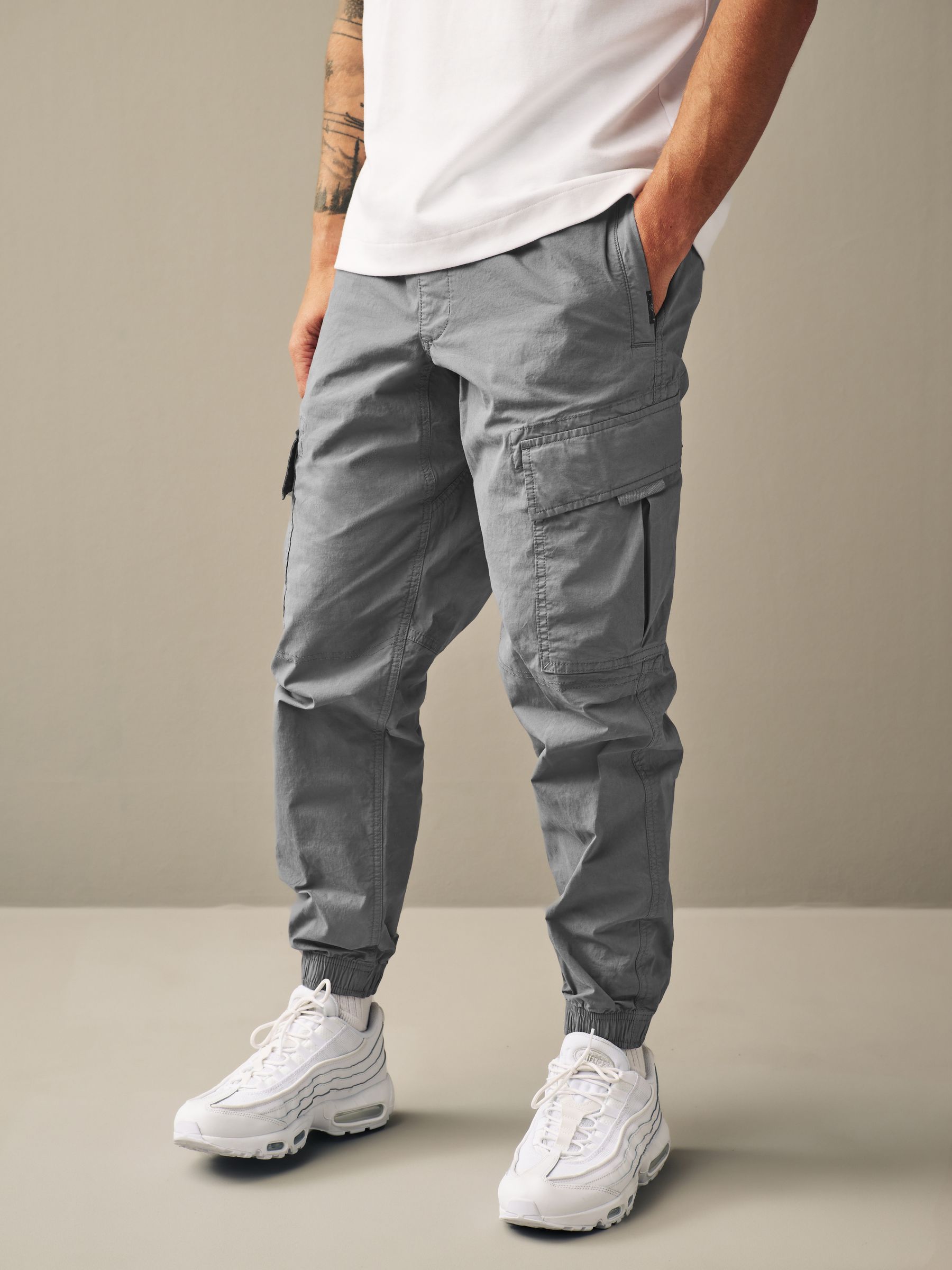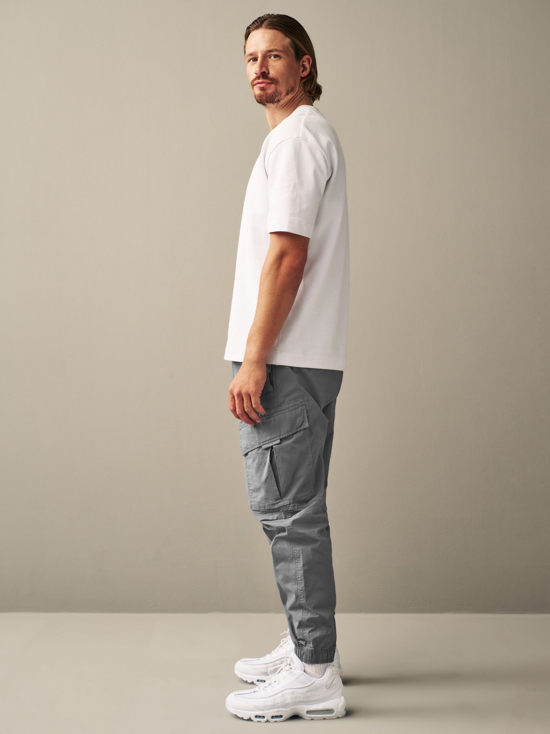 Offering style and comfort with ease, our utility trousers are the perfect addition to your new-season wardrobe. Made from soft and stretchy cotton, the trousers have a tapered silhouette with utility pockets on each side and a fully adjustable elasticated drawcord waistband designed for a comfortable fit throughout the day. Team them with a jumper and trainers for a classic weekend outfit. 97% Cotton, 3% Elastane.