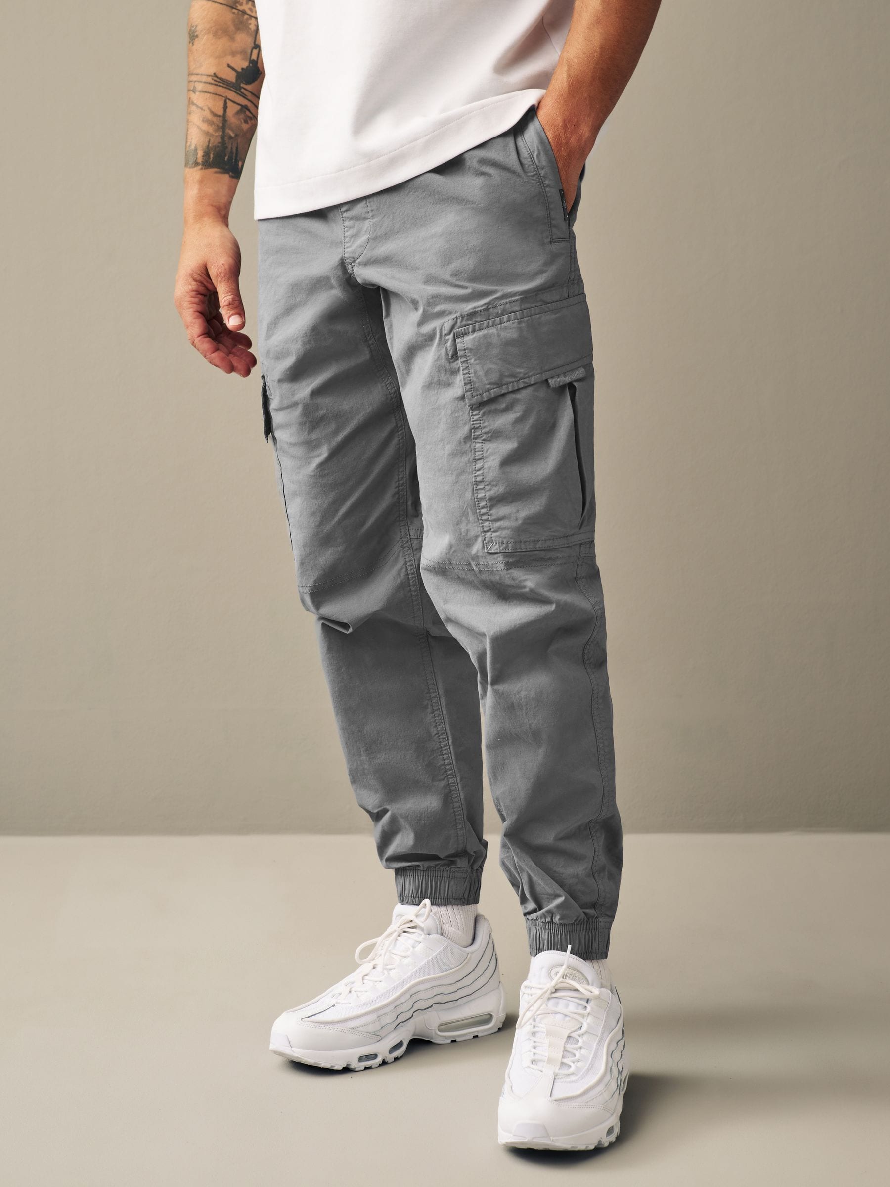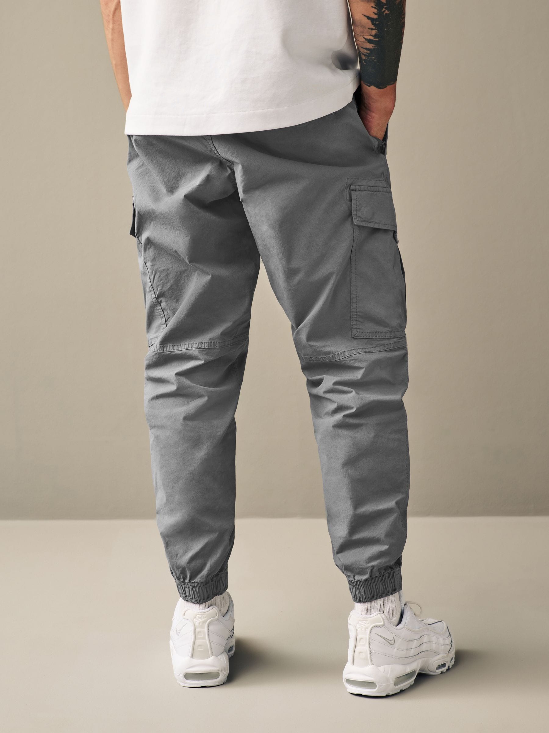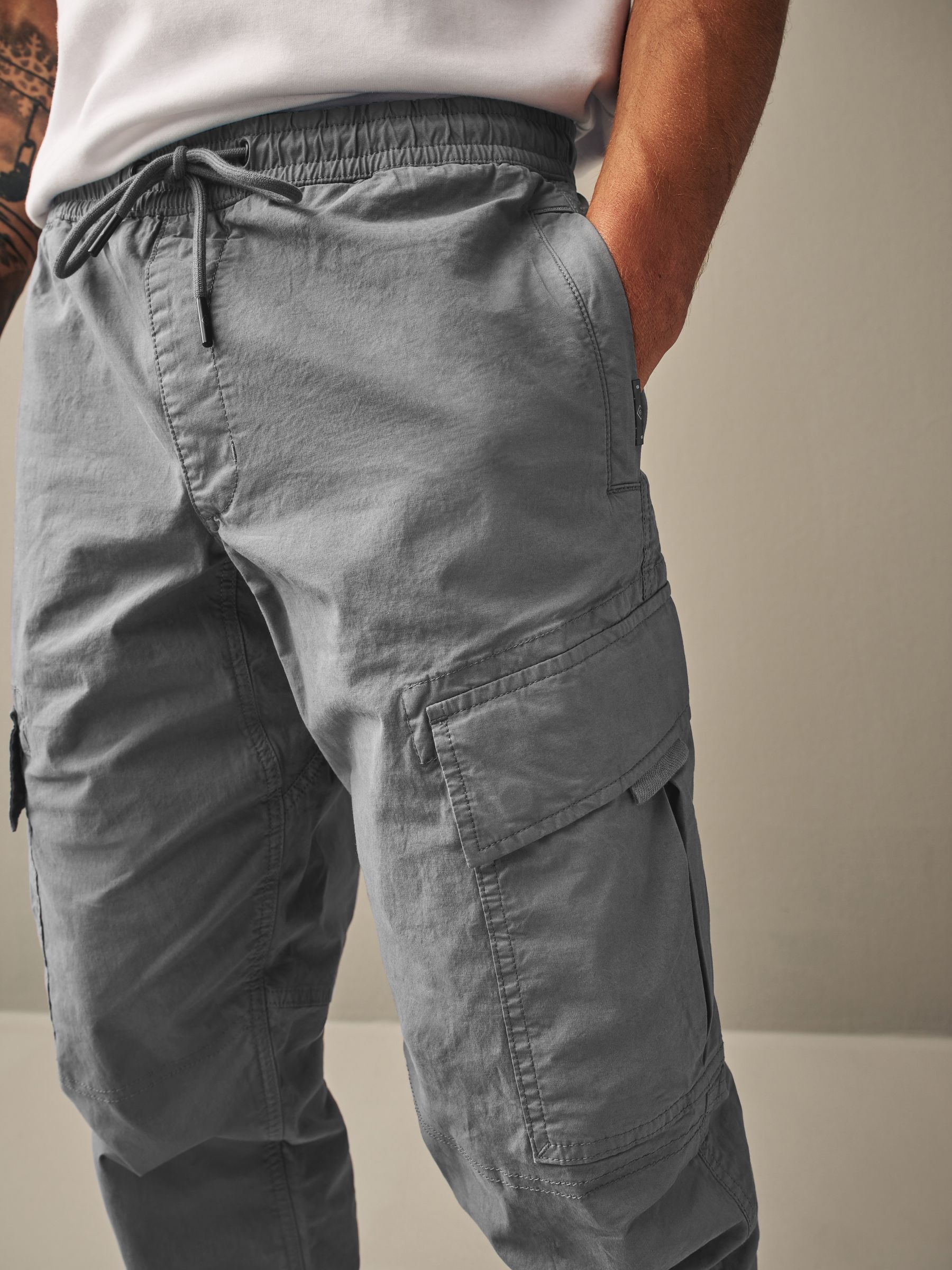 Made from soft and stretchy cotton, the trousers have a tapered silhouette with utility pockets on each side and a fully adjustable elasticated drawcord waistband designed for a comfortable fit throughout the day.