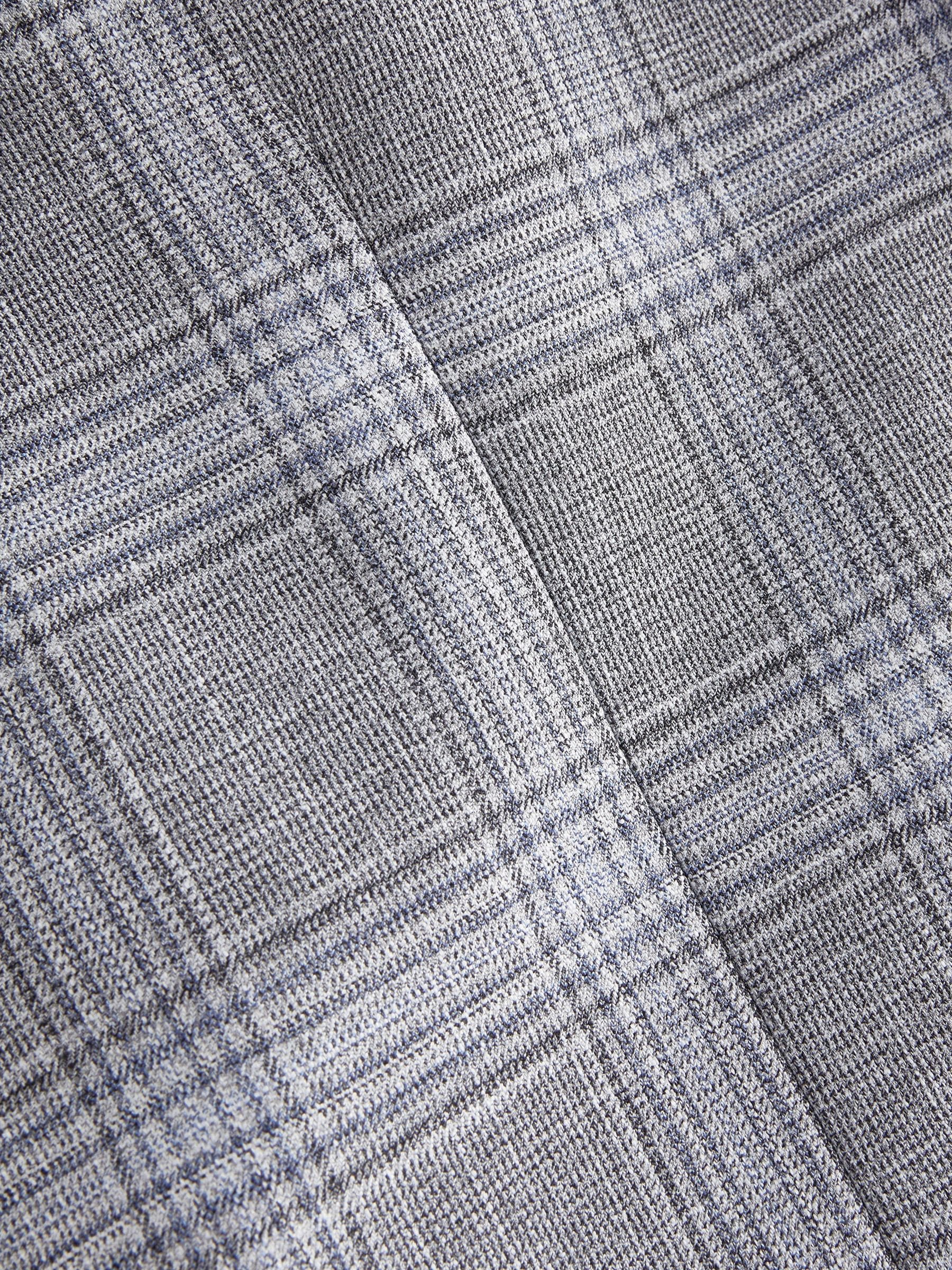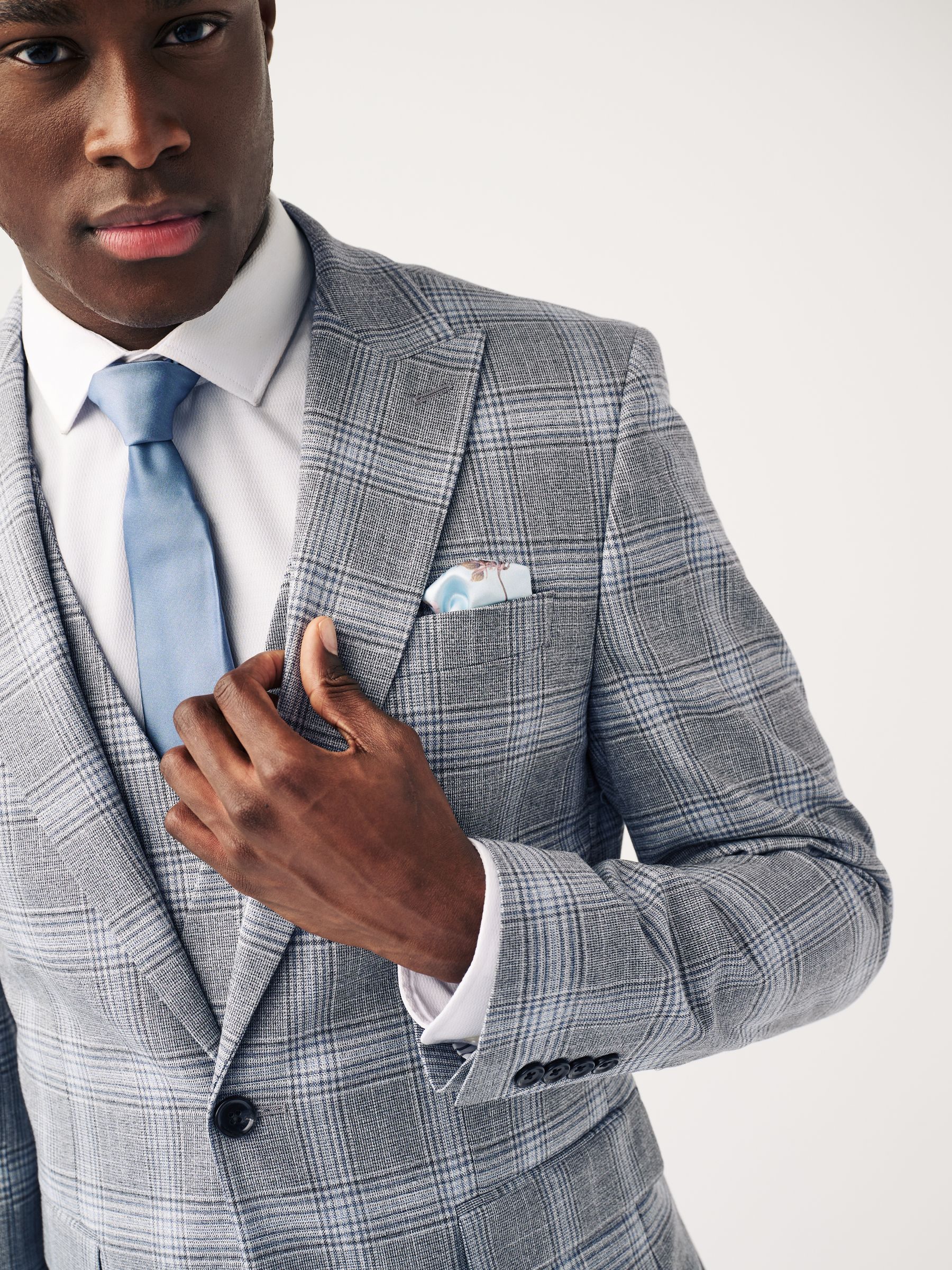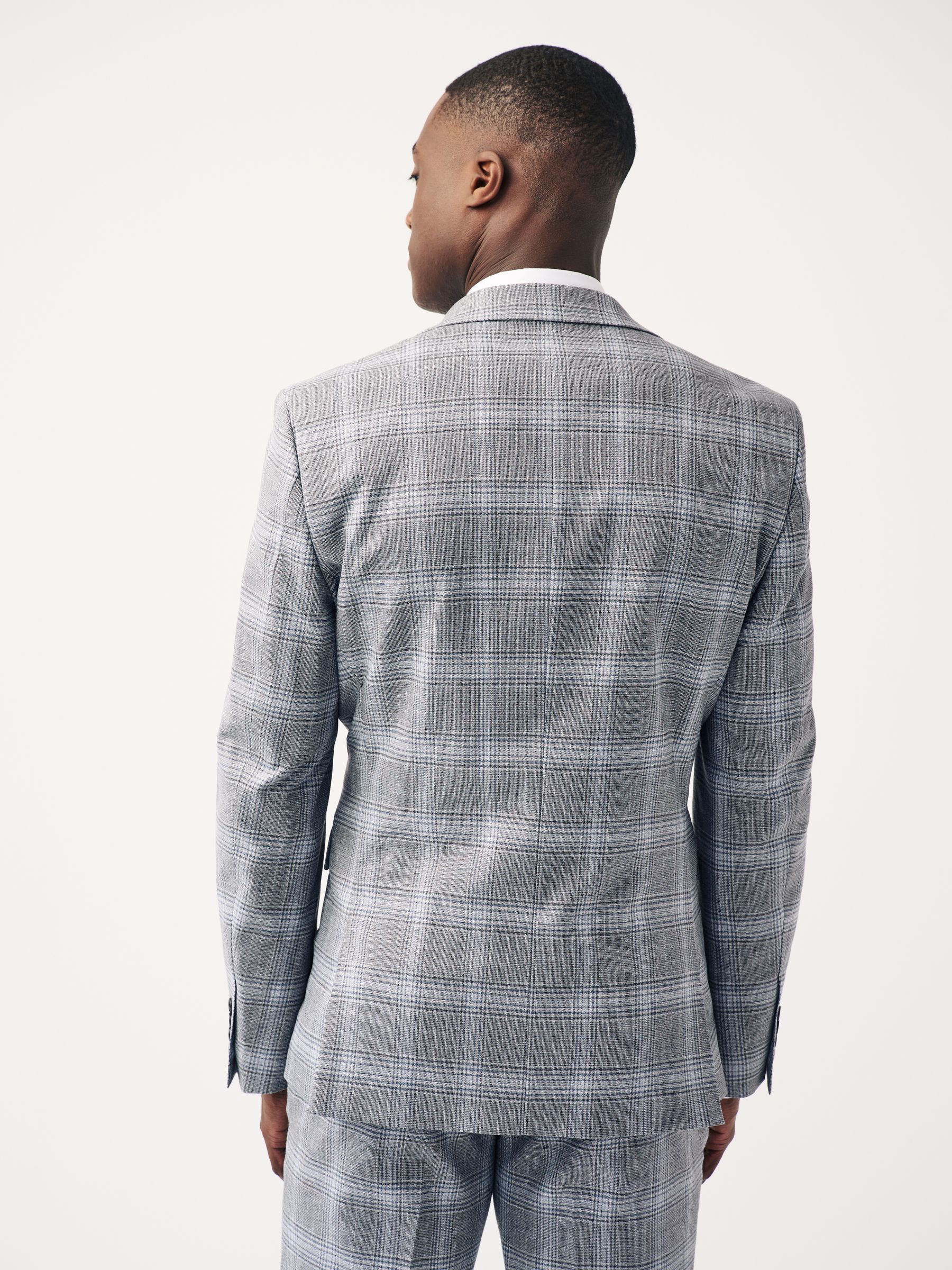 Make a statement with our slim fit check suit jacket, where classic meets contemporary. The check fabric brings a timeless pattern with a modern twist, perfect for making a mark on any special occasion. The peak lapels add a touch of sophistication, enhancing your silhouette, while the printed lining offers a surprise element of style that’s uniquely yours. Plus, the pull-out pocket square provides a coordinated flourish whenever needed. Finished with a four-button cuff, this jacket is crafted for those who appreciate the finer details. Slim fit suit jacket Single breasted Button-up fastening Flap pockets Pull-out pocket square Printed lining Main 71% Recycled polyester, 24% Viscose, 3% Polyester, 2% Elastane. Lining 100% Recycled polyester.