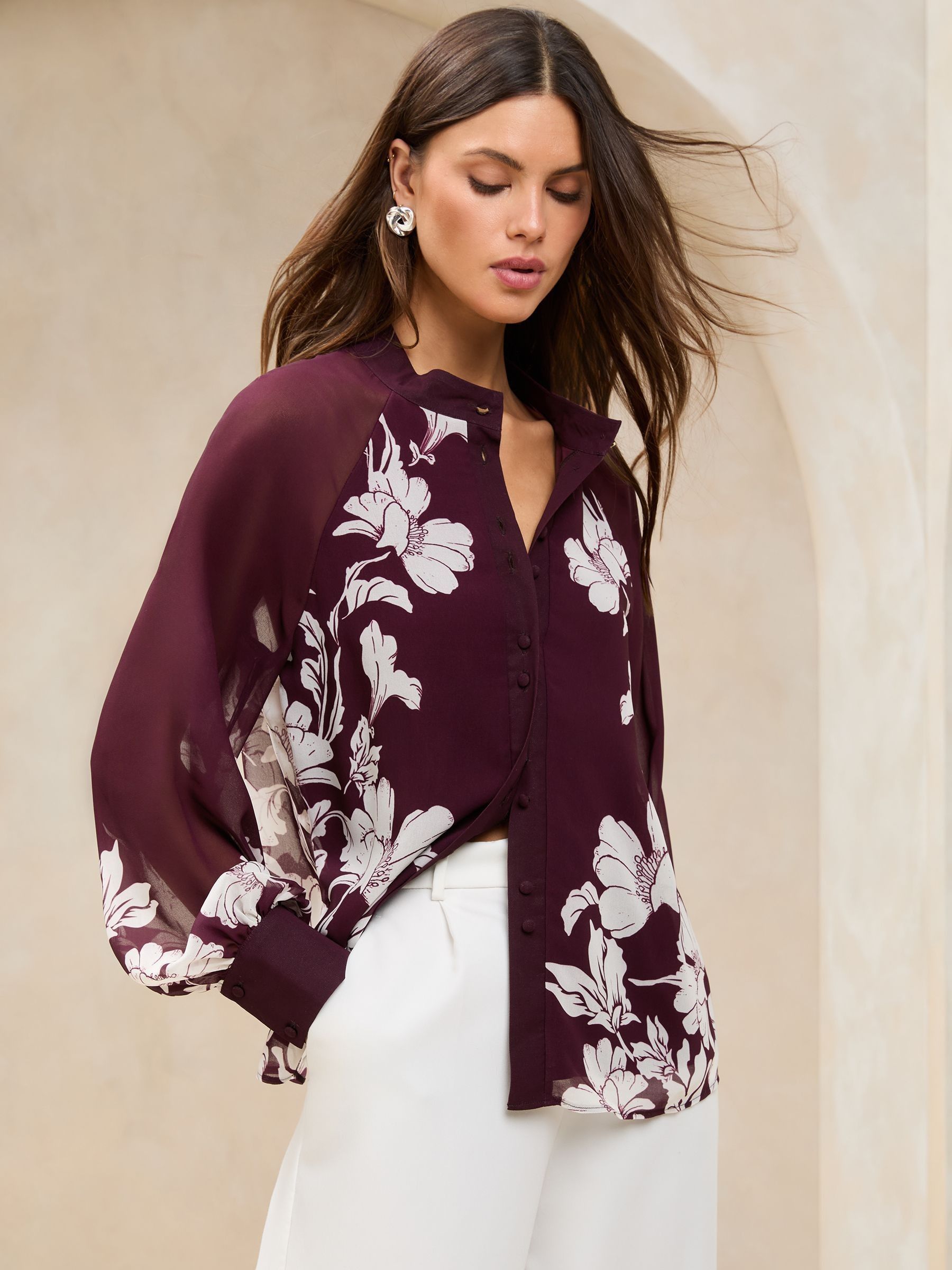 Lipsy Burgundy Red Long Sleeve Grandad Collar Blouse