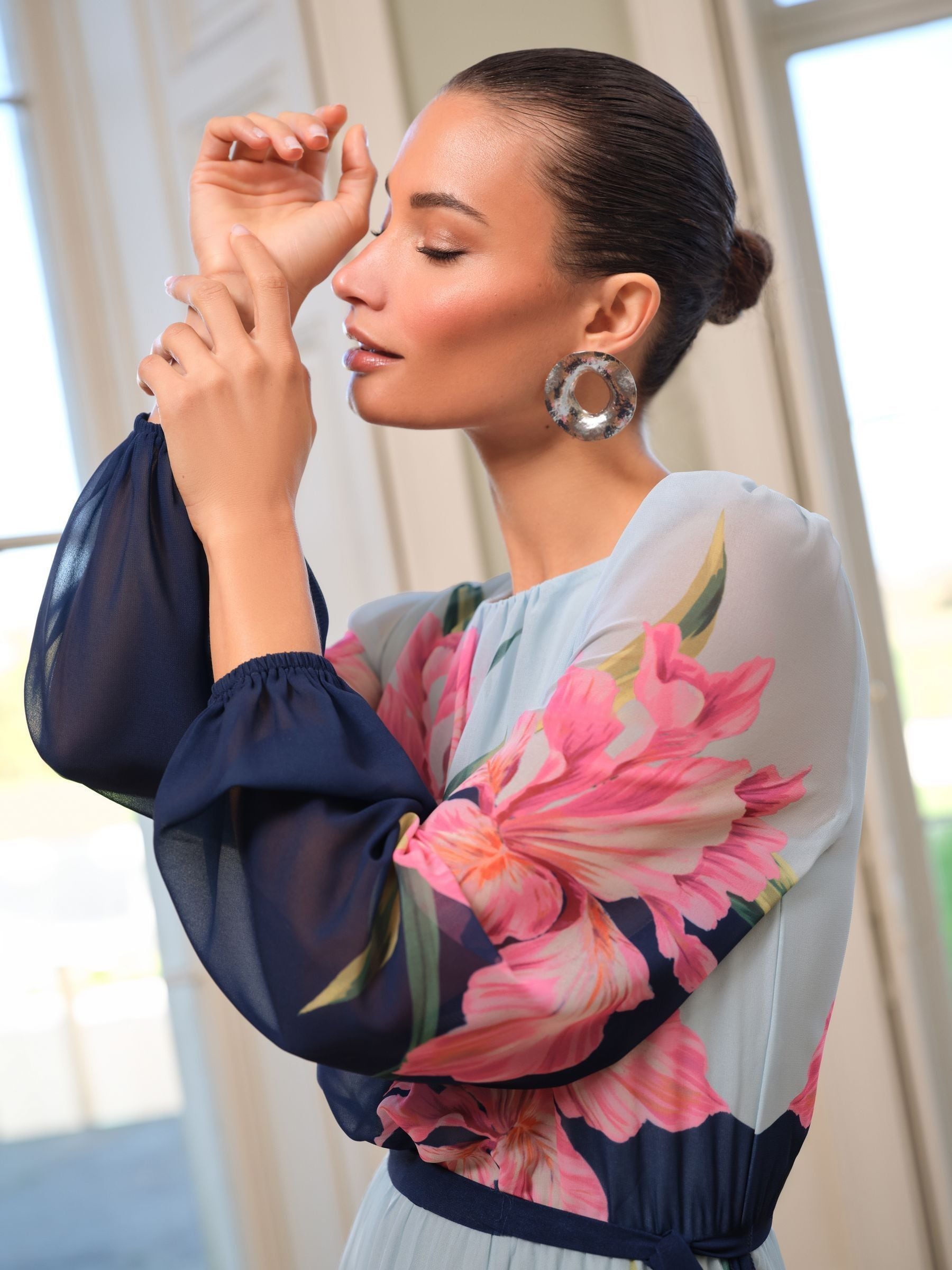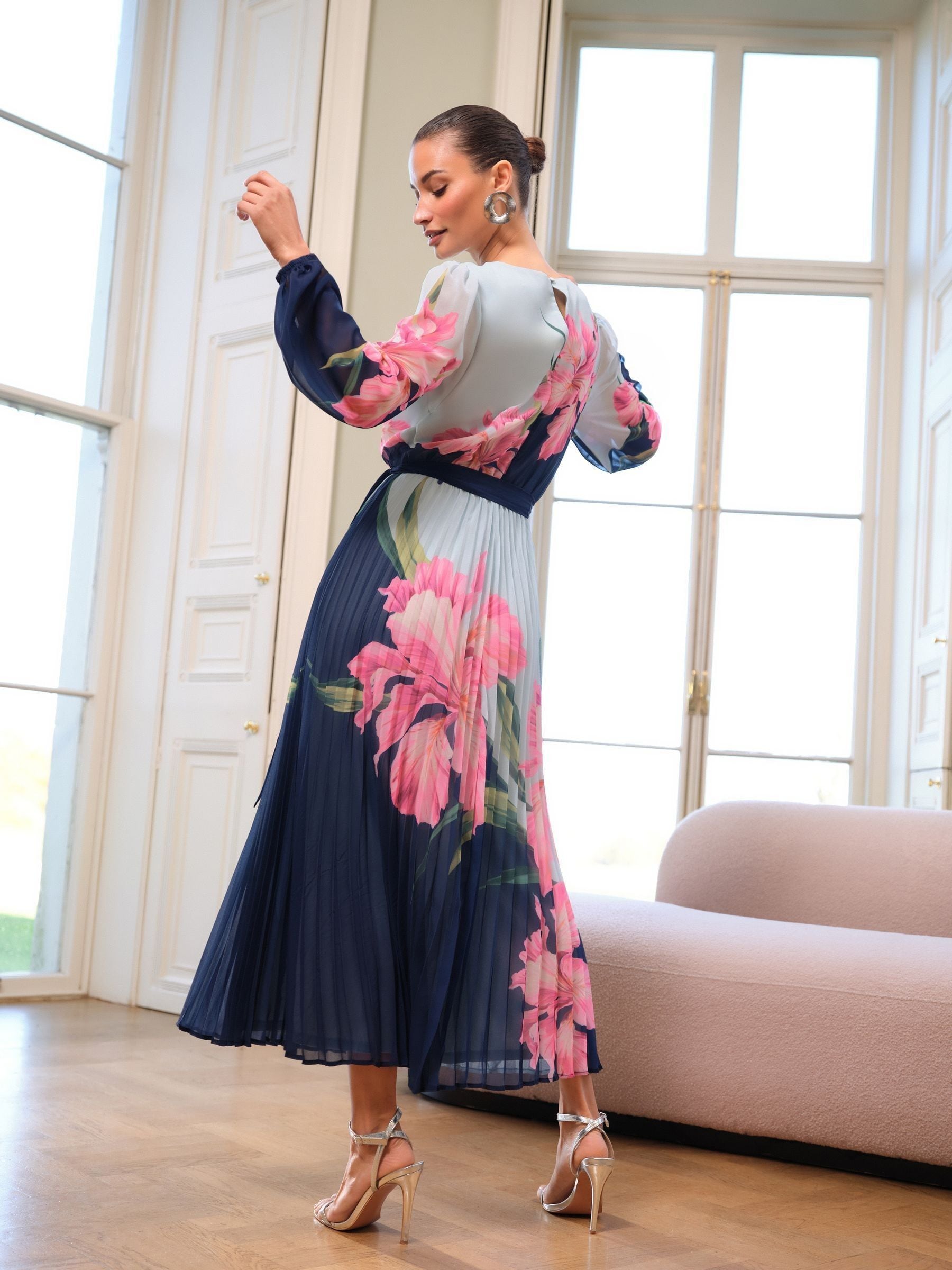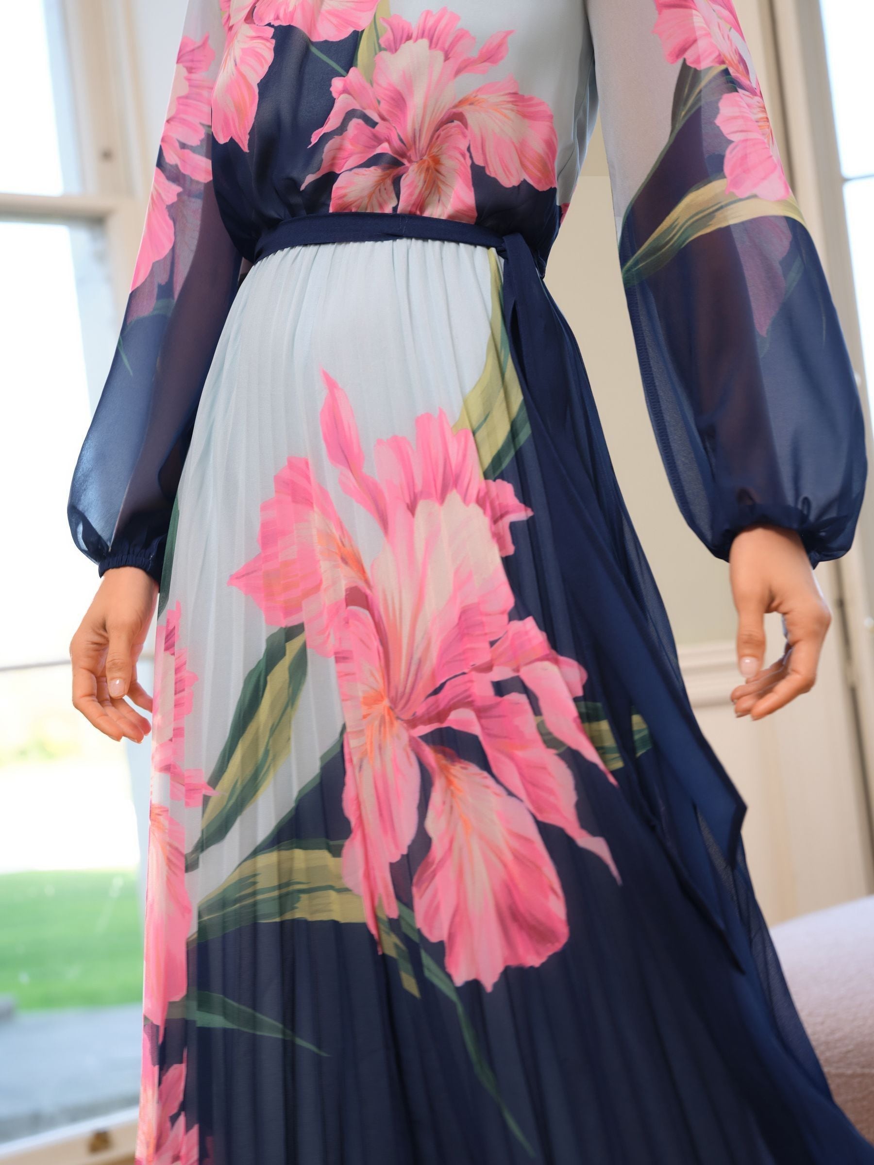 Gorgeous floral printed dress. Crew neckline, belt detail, pleating and long sleeves with elasticated cuffs. Model wears UK Size 10.