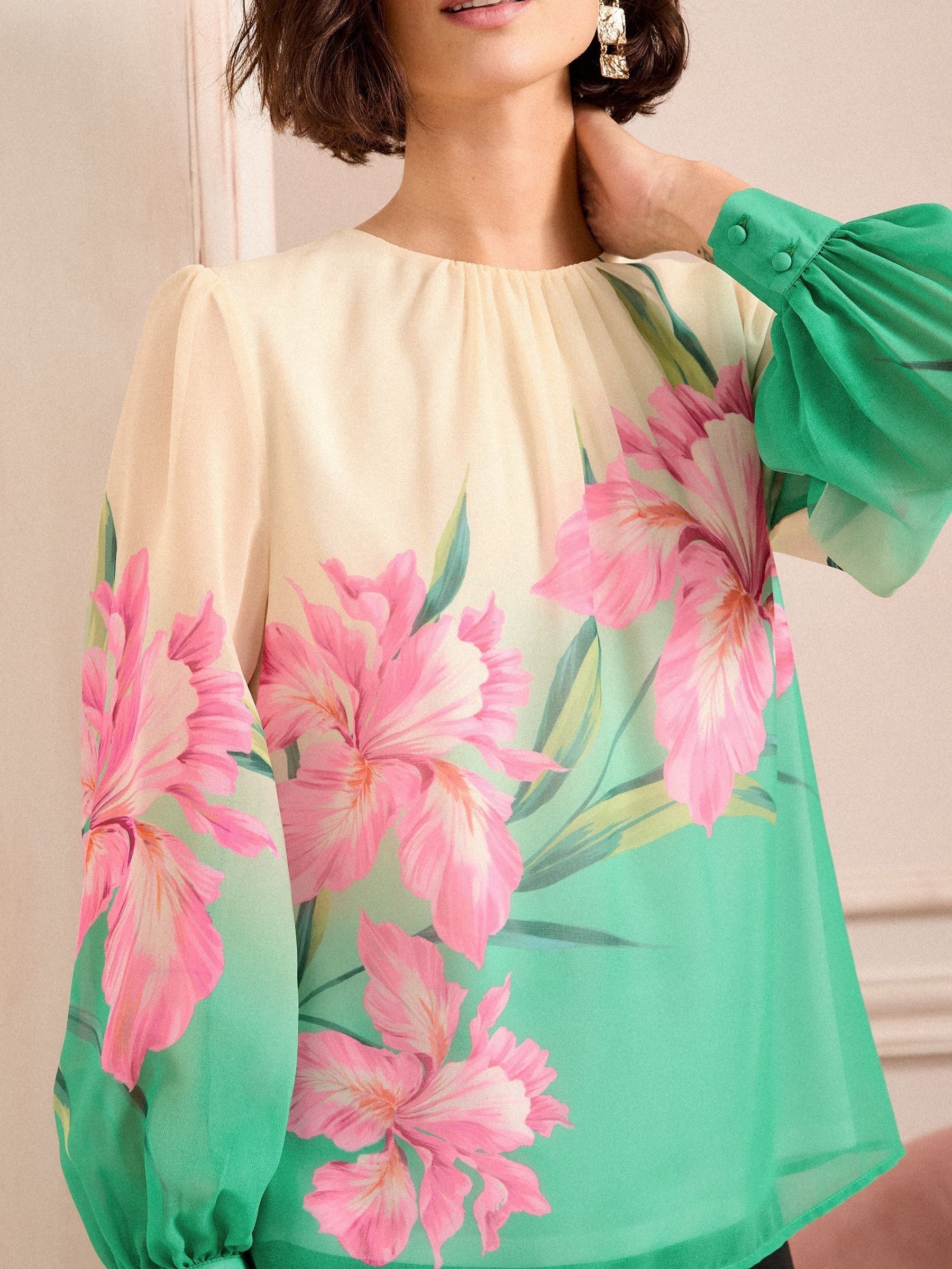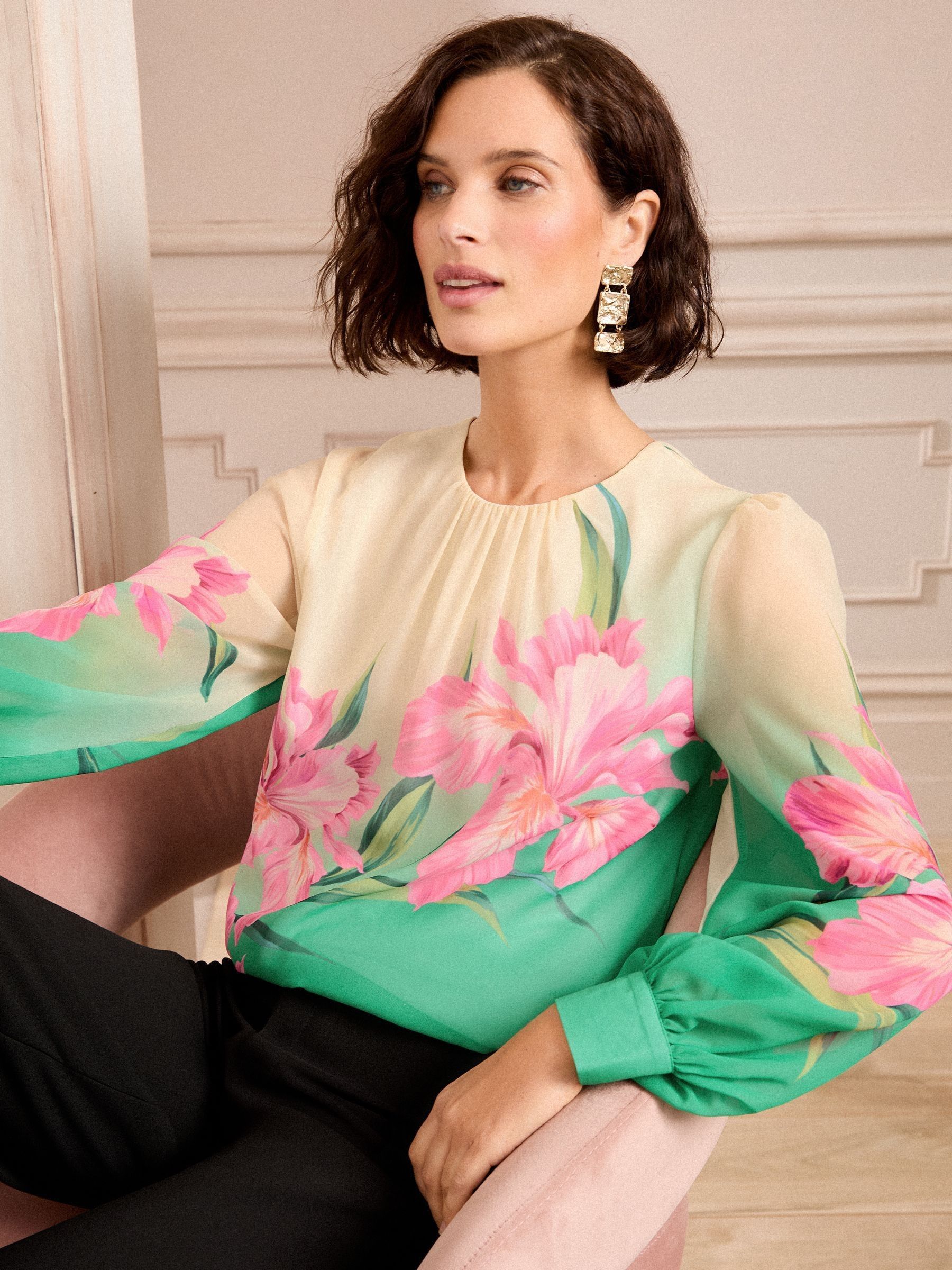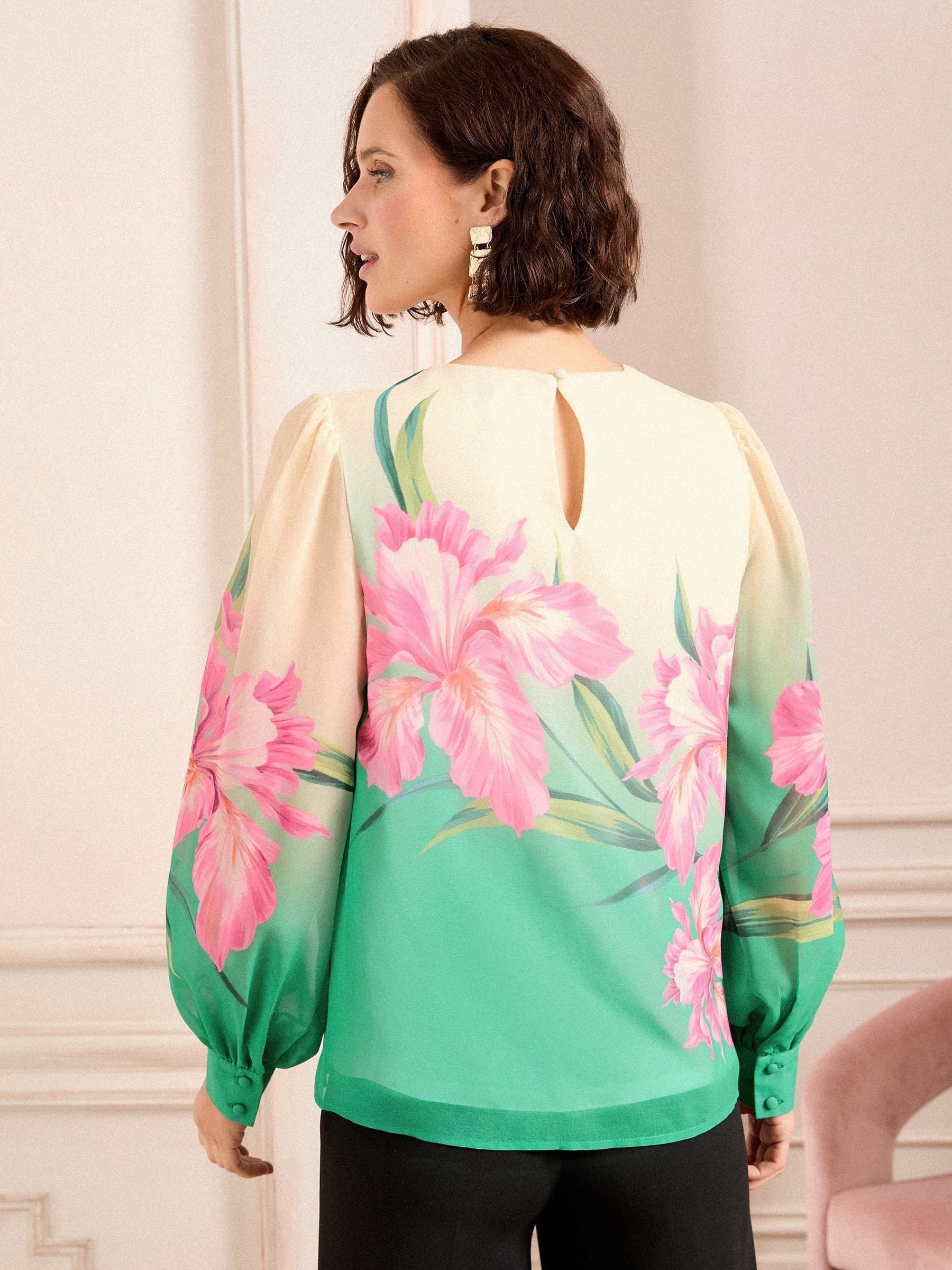 Gorgeous photographic floral printed blouse, crew neckline with long sleeves. Main 100% Polyester. Lining 100% Polyester.