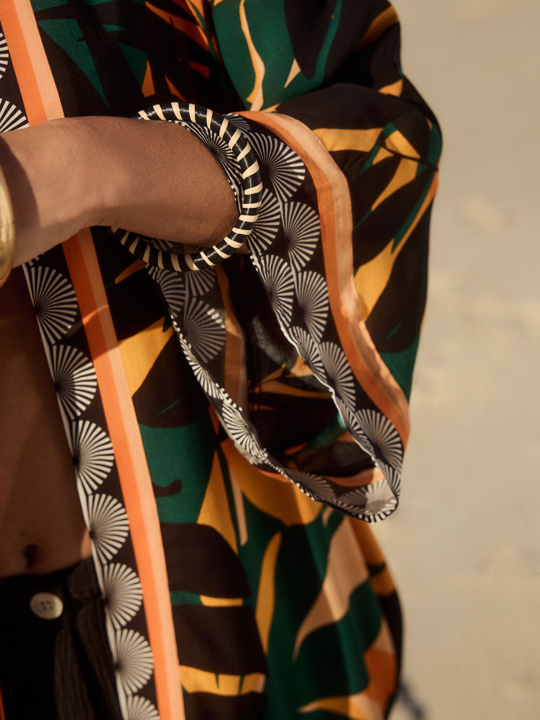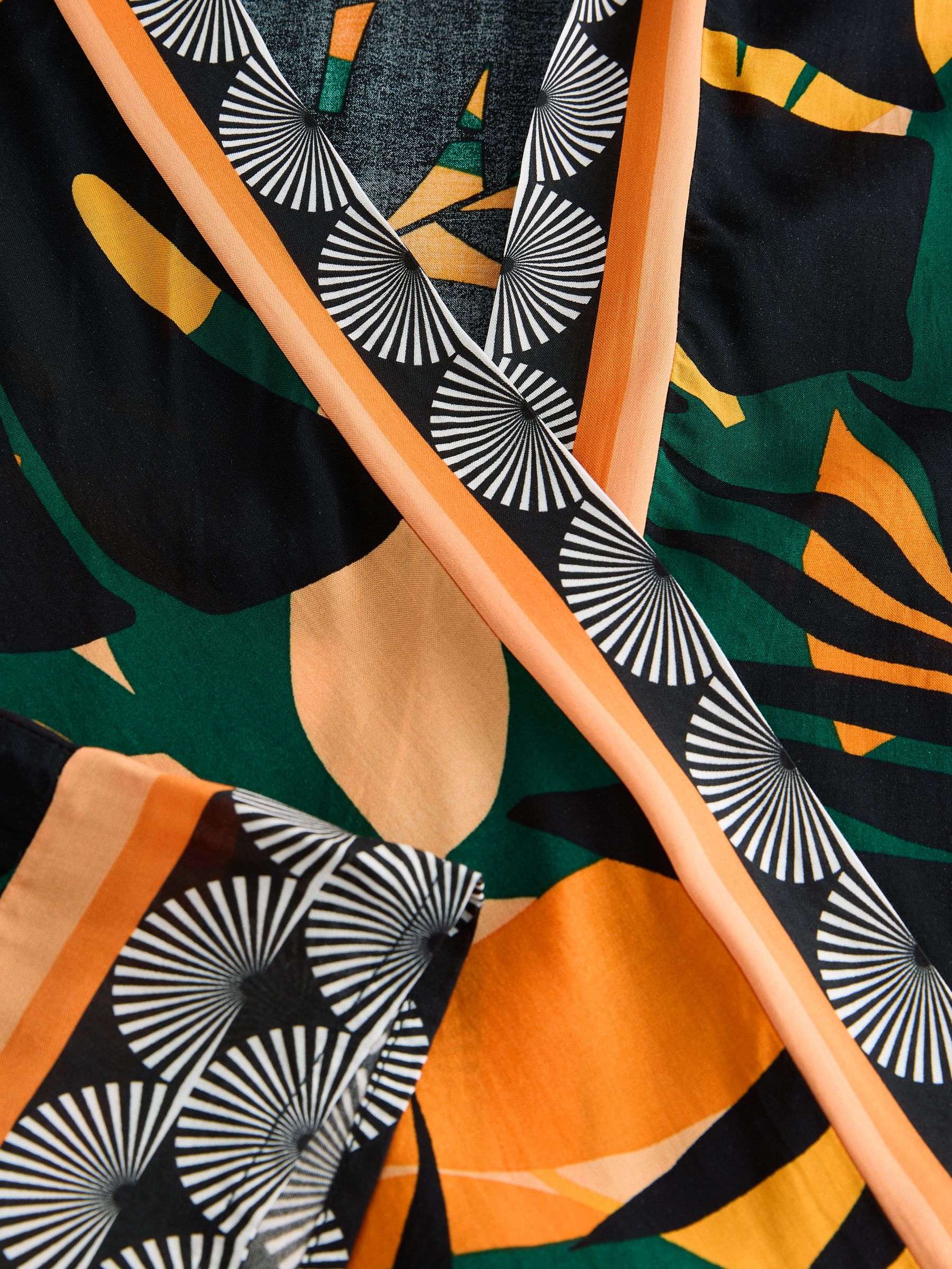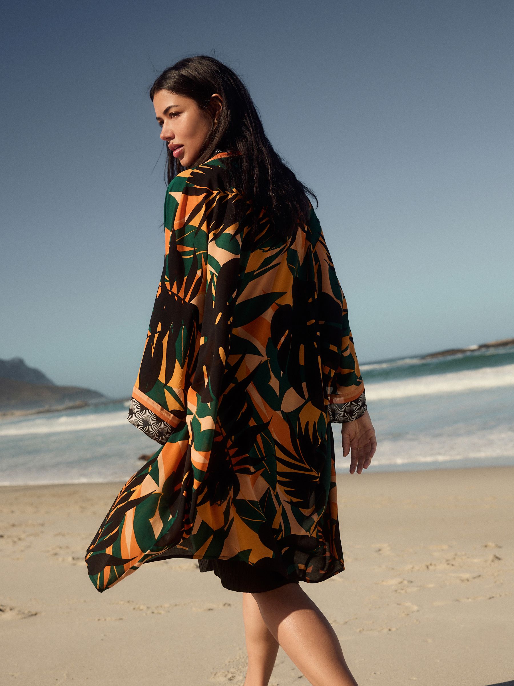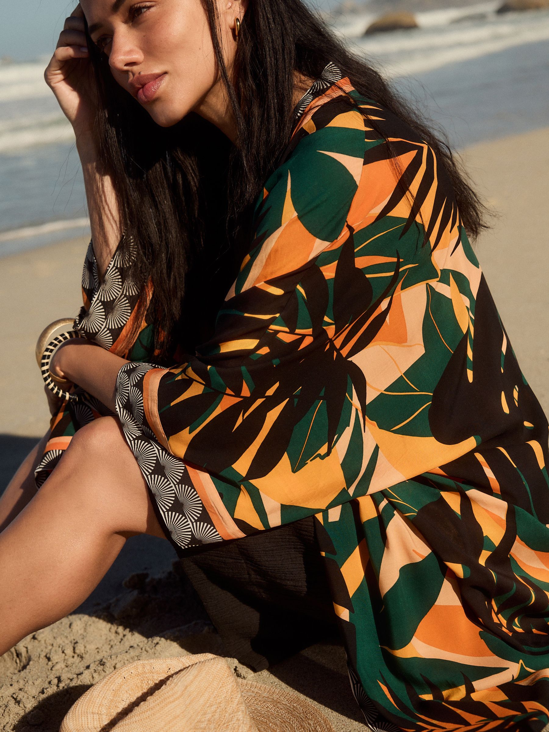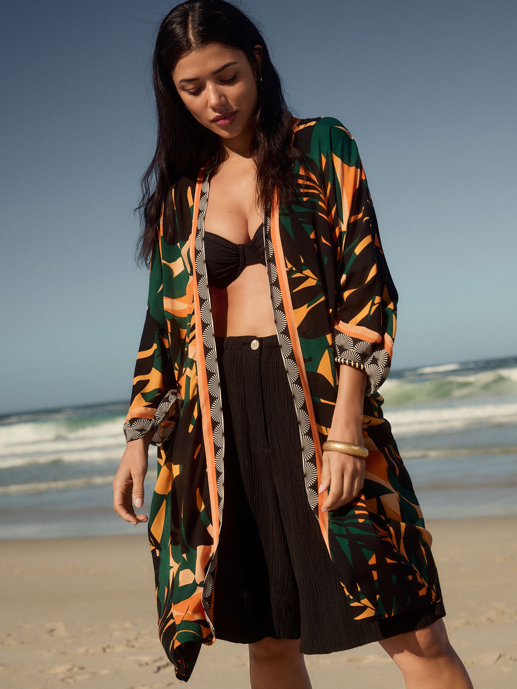 Channel the tropical trend with this palm print longline cover-up. In a kimono style, this lightweight and airy piece is coated in a pretty palm tree print with contrast border detailing. The perfect addition to your beach and poolside attire. 100% viscose Longline length Palm tree print Open front 100% LENZING™ ECOVERO™ Viscose.