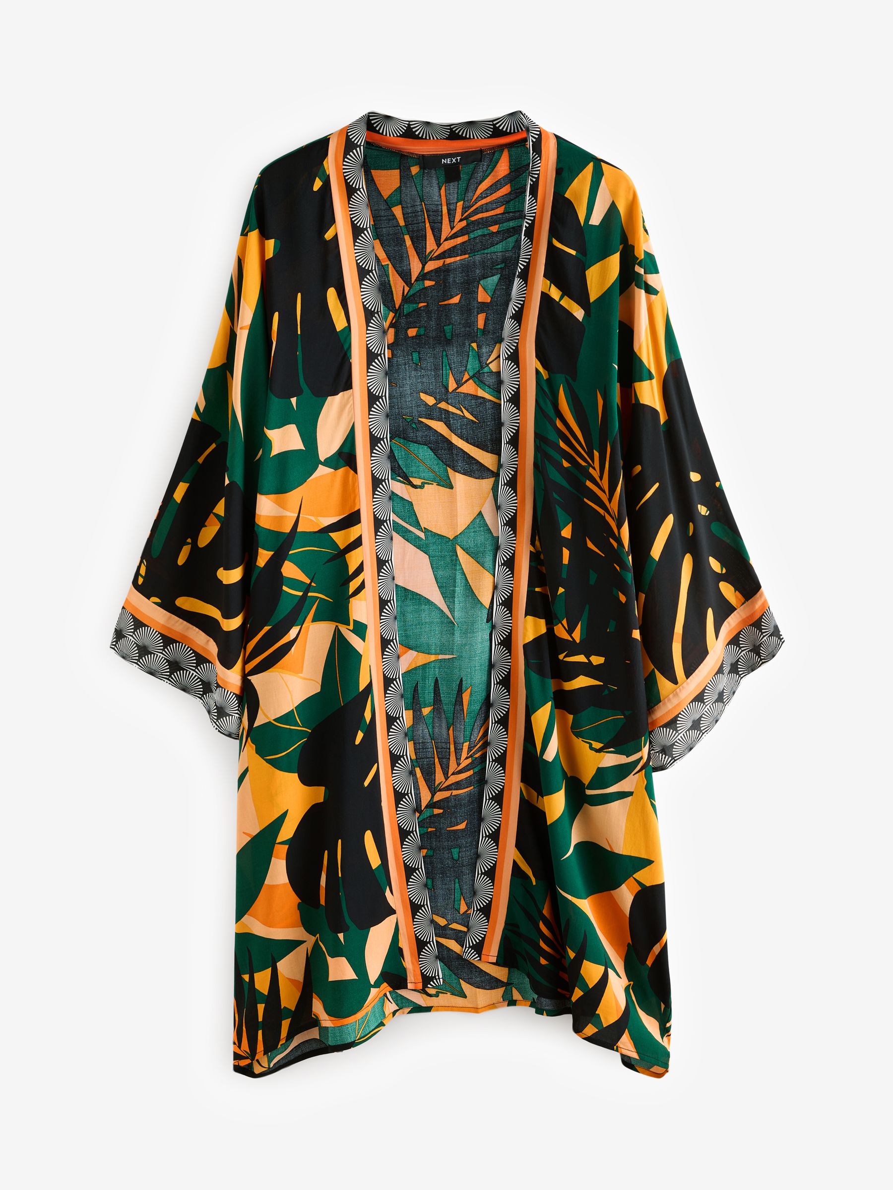 Channel the tropical trend with this palm print longline cover-up. In a kimono style, this lightweight and airy piece is coated in a pretty palm tree print with contrast border detailing. The perfect addition to your beach and poolside attire.