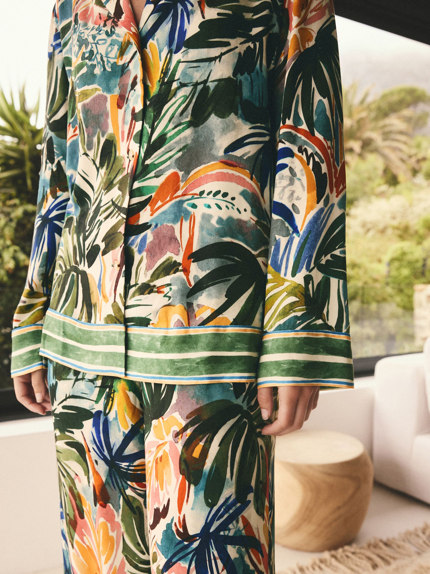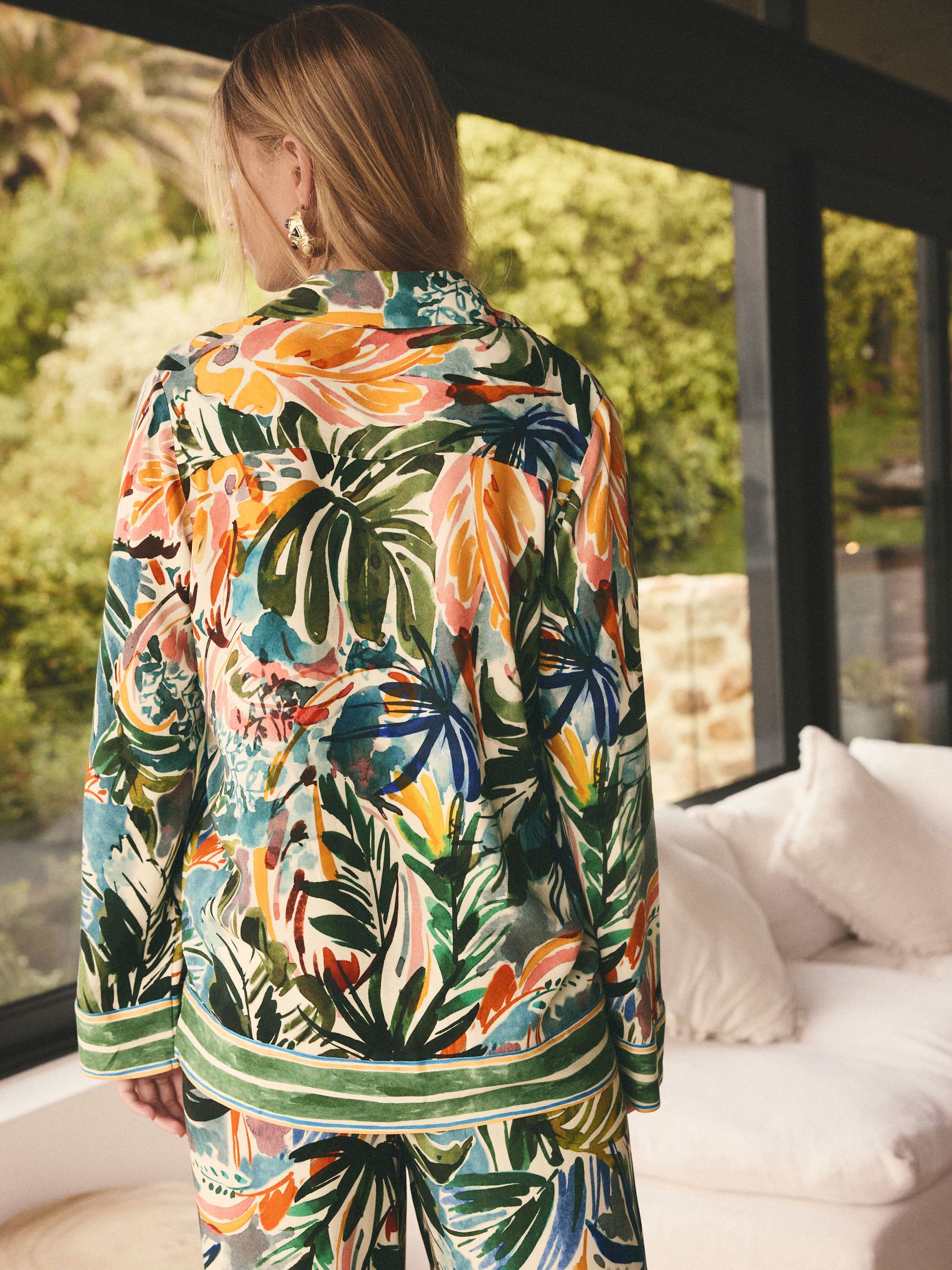 Elevate your weekend to office wardrobe with our soft feel relaxed blazer. A lighter weight alternative to your standard blazer, this multi-coloured palm print piece is perfect to style for layering or on its own. Style with the matching trousers and your favourite sandals for the ultimate show-stopping day to night look.