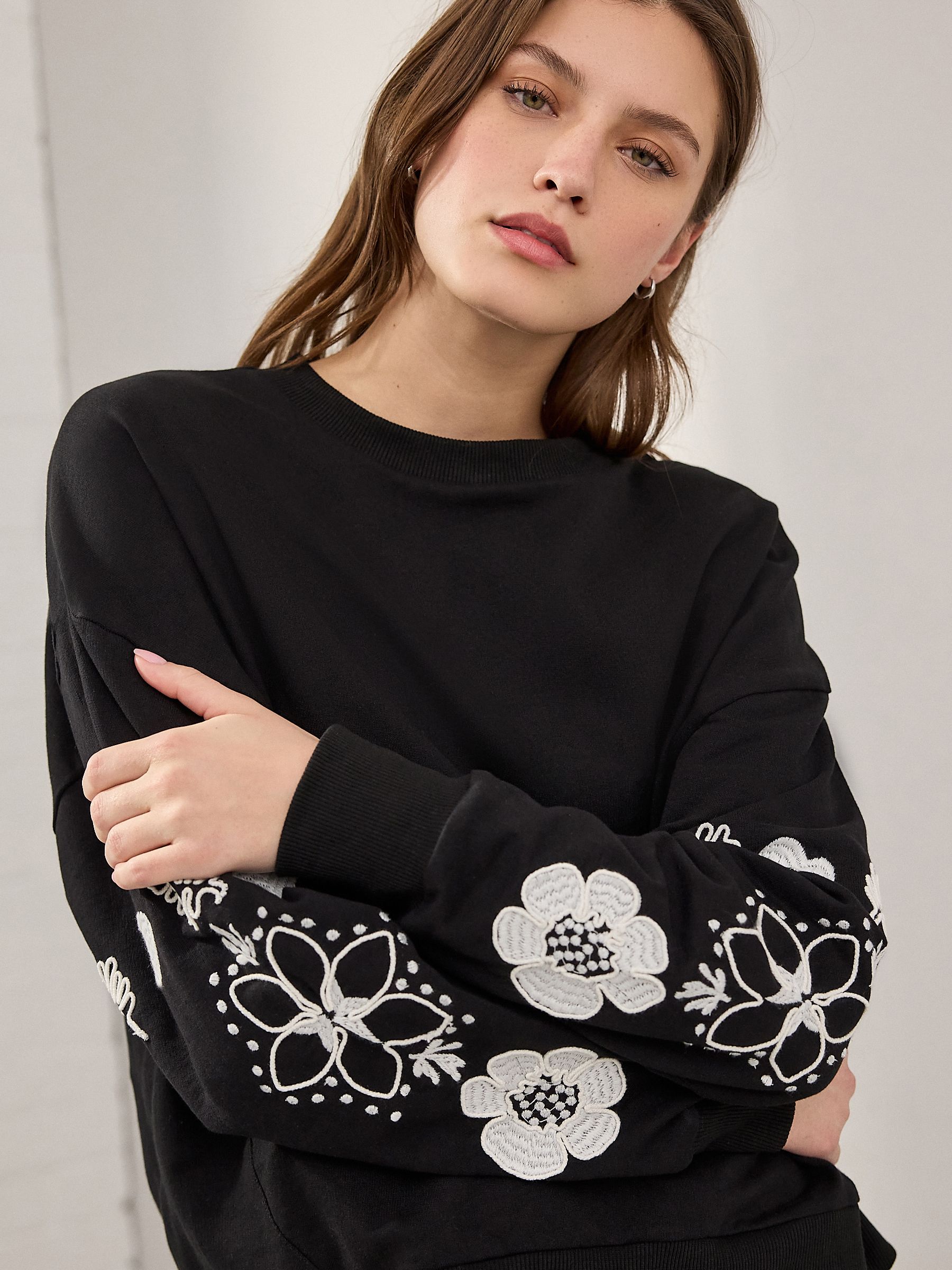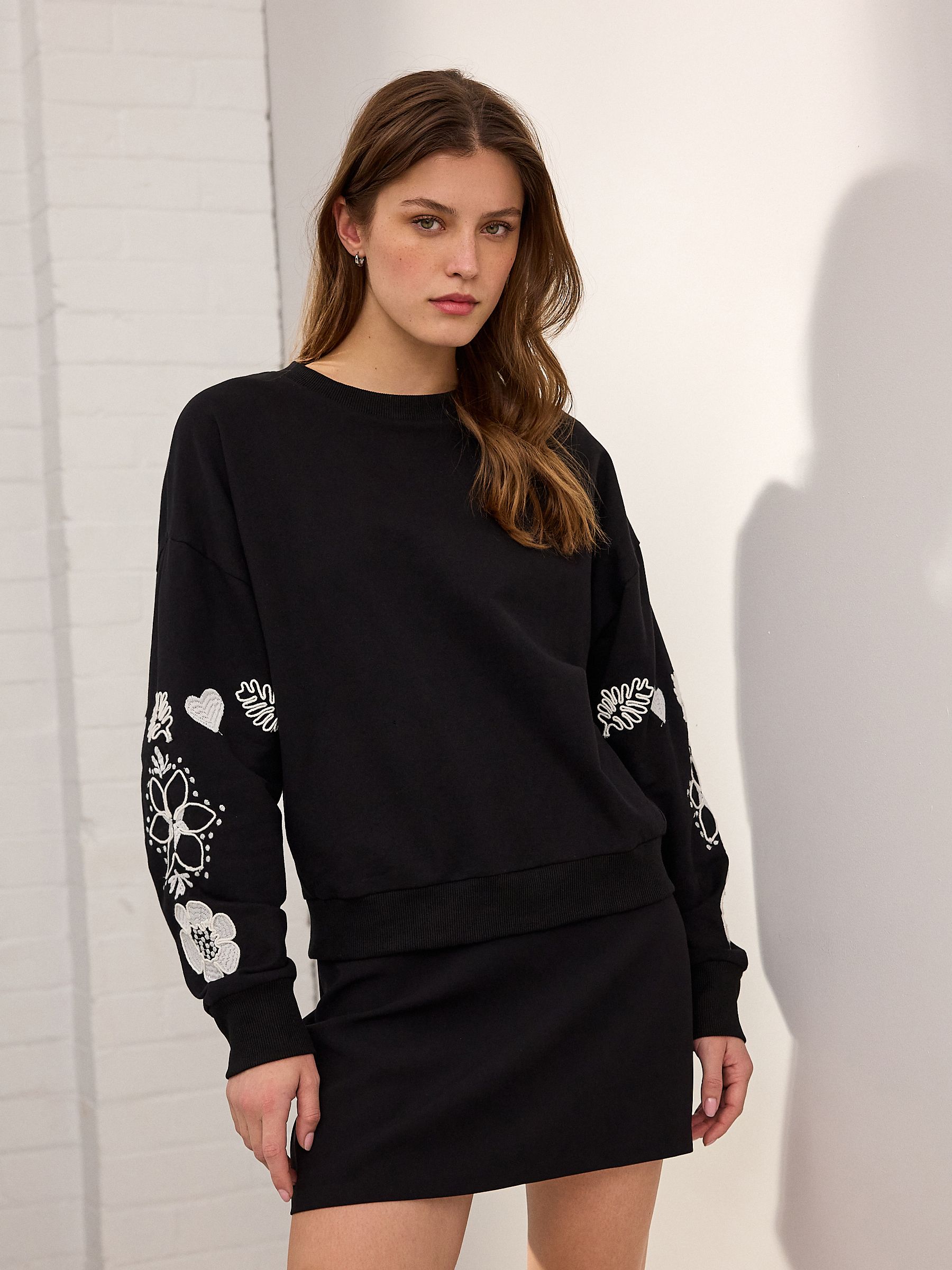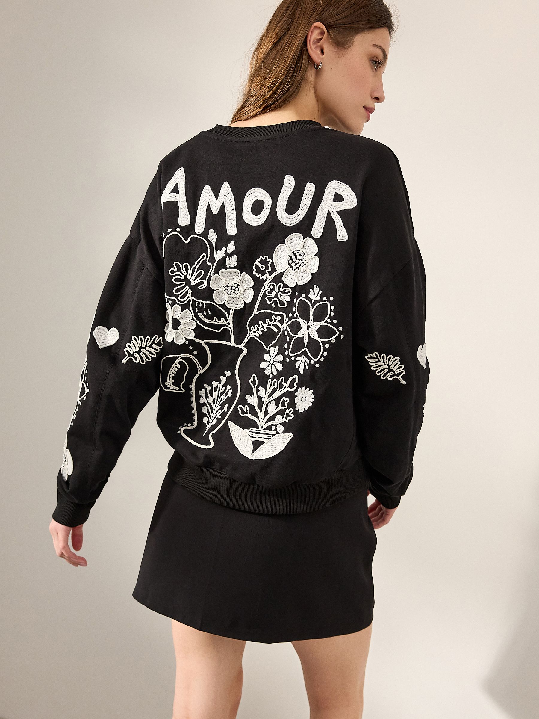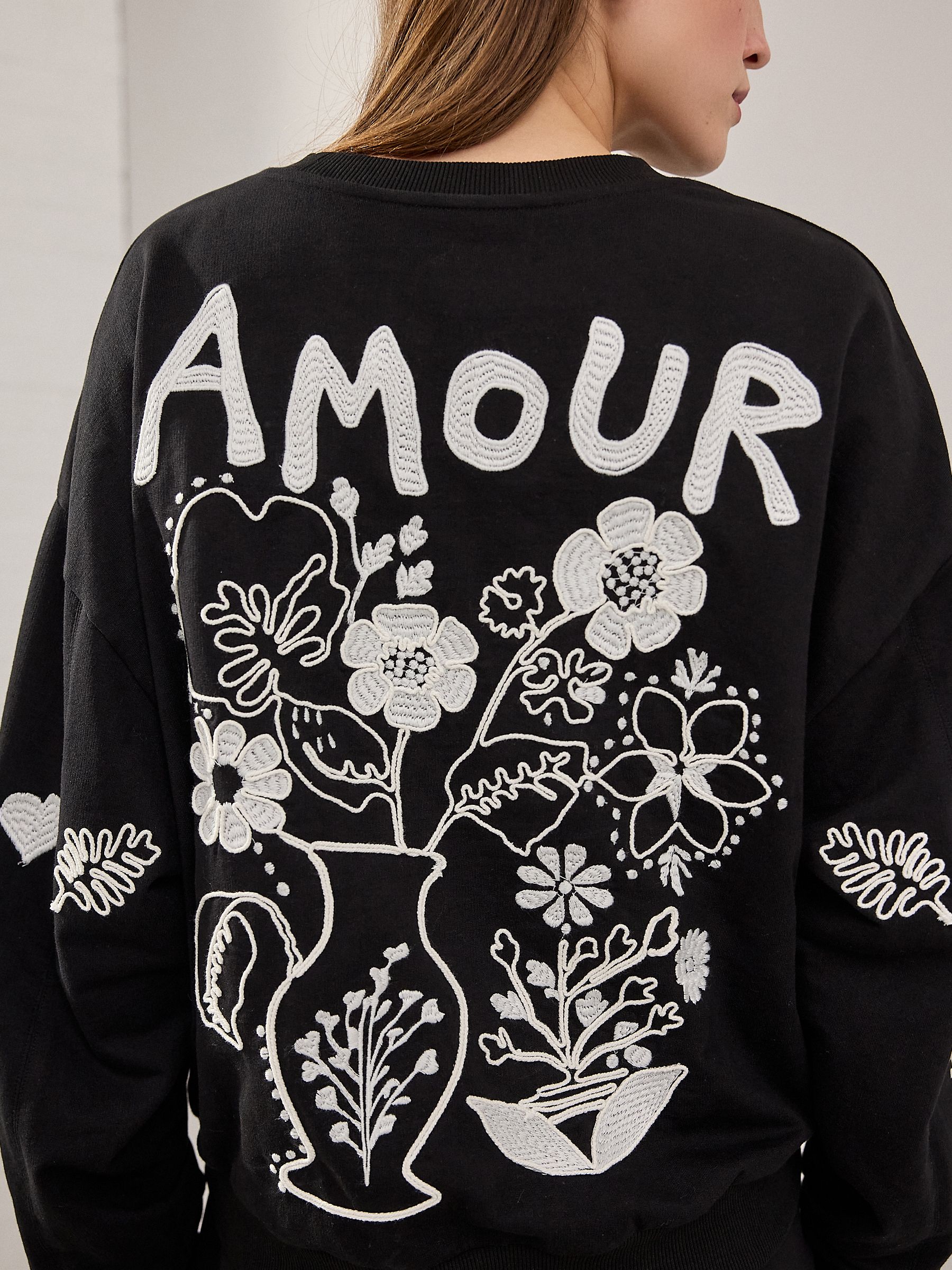 This casual staple gets a modern update with embroidered floral sleeve and back designs and an ‘Amour’ slogan, set against a pure-cotton black base, finished with a crewneck collar and ribbed hems.