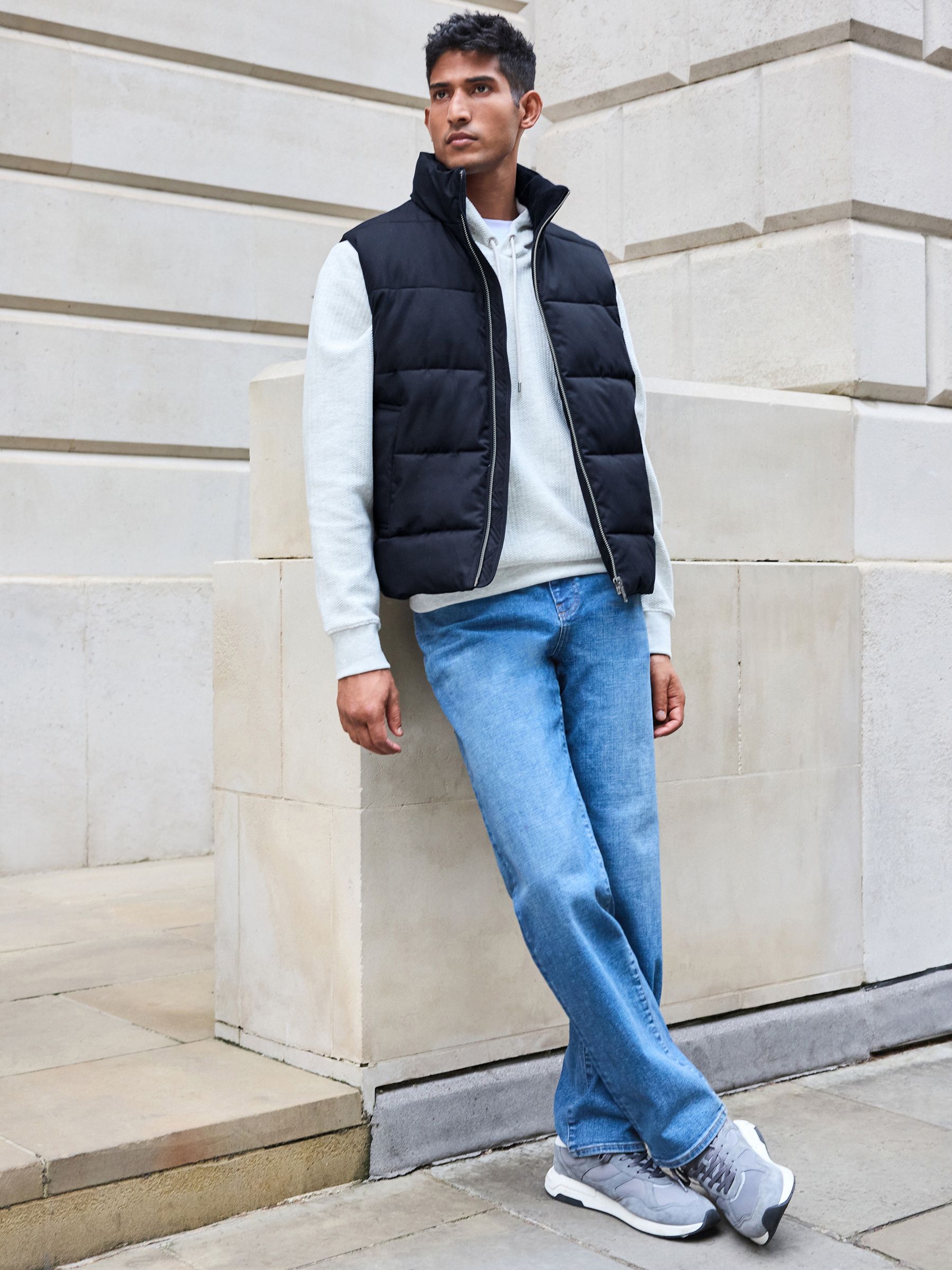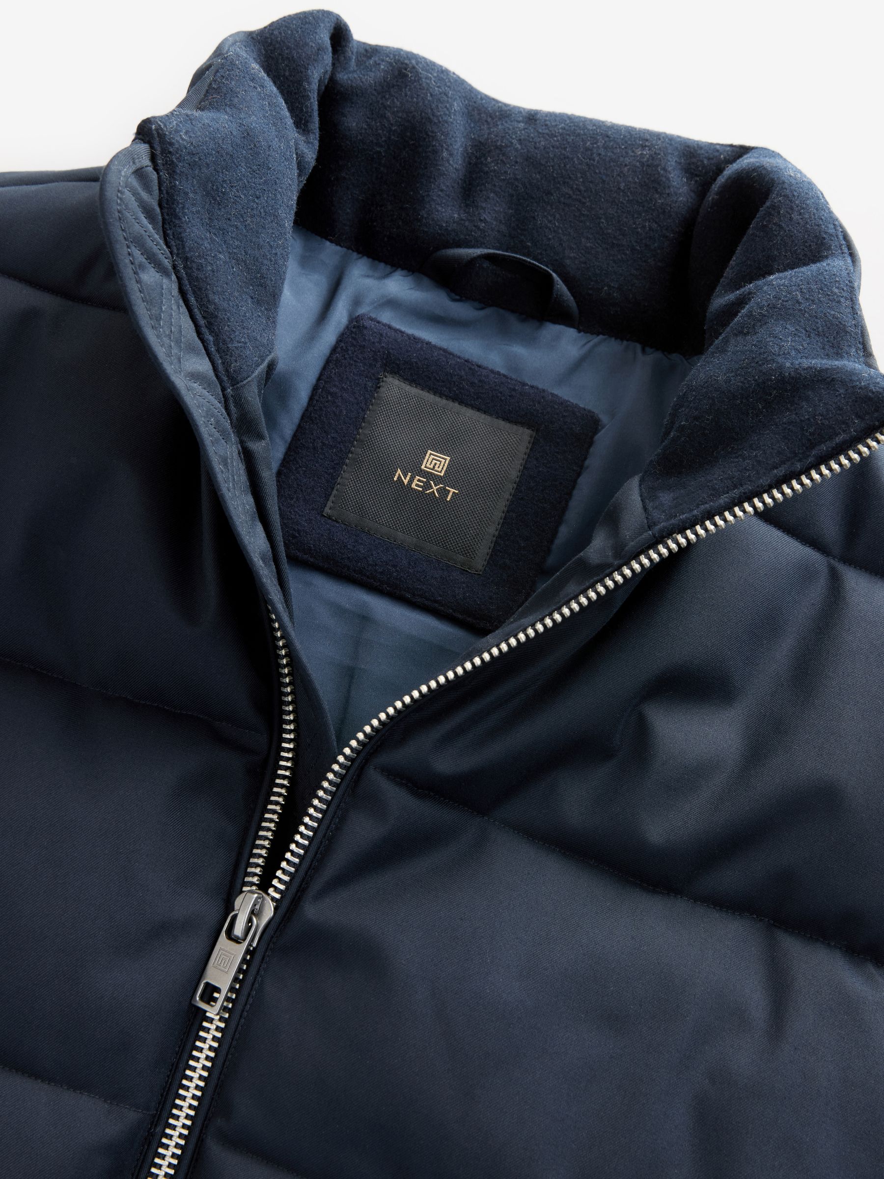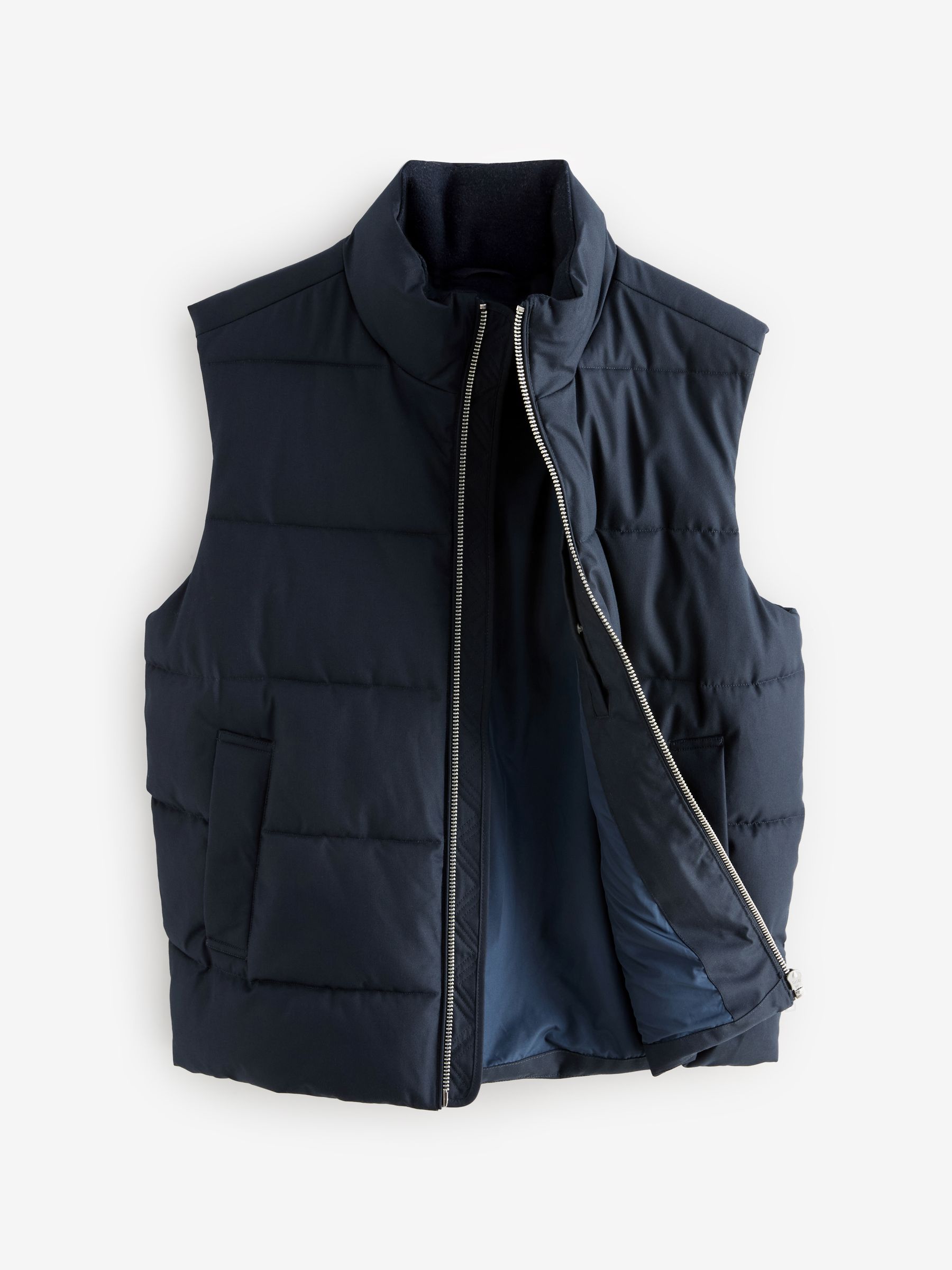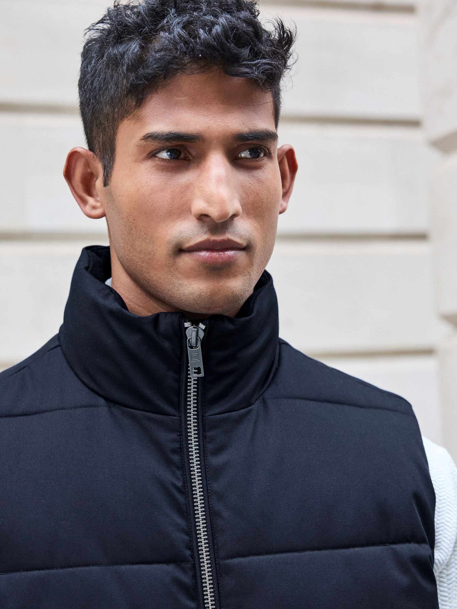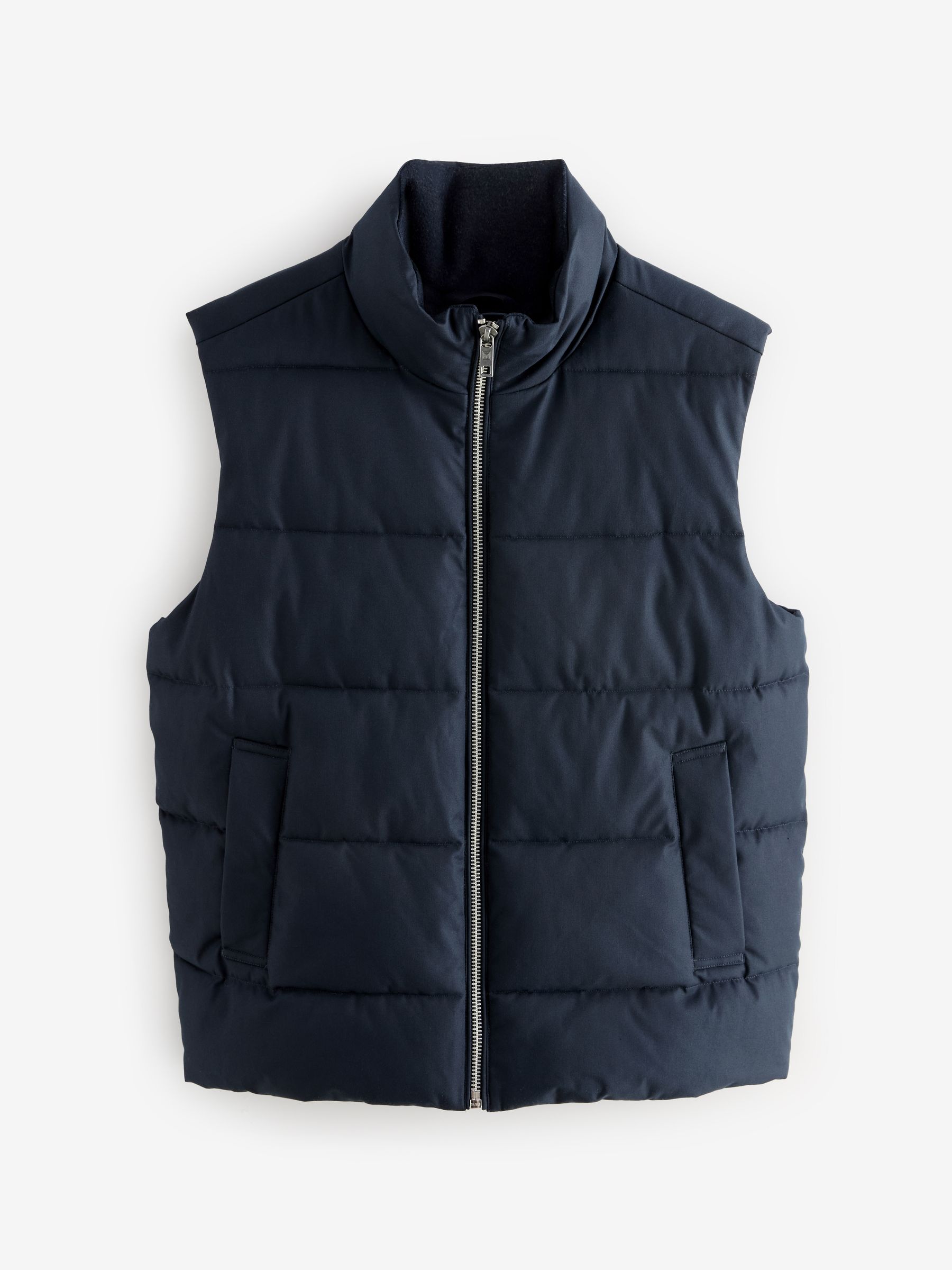 Stay warm in style with our navy blue funnel neck gilet. A winter must-have, this gilet is designed with a funnel neck, zip fastening and pockets. Layer over a sweatshirt or fleece for a complete look. Funnel neck Padded Zip fastening Pockets Shell 65% Recycled polyester, 35% Viscose. Main Lining 100% Recycled polyester. Rib 98% Polyester, 2% Elastane. Wadding 100% Recycled polyester.