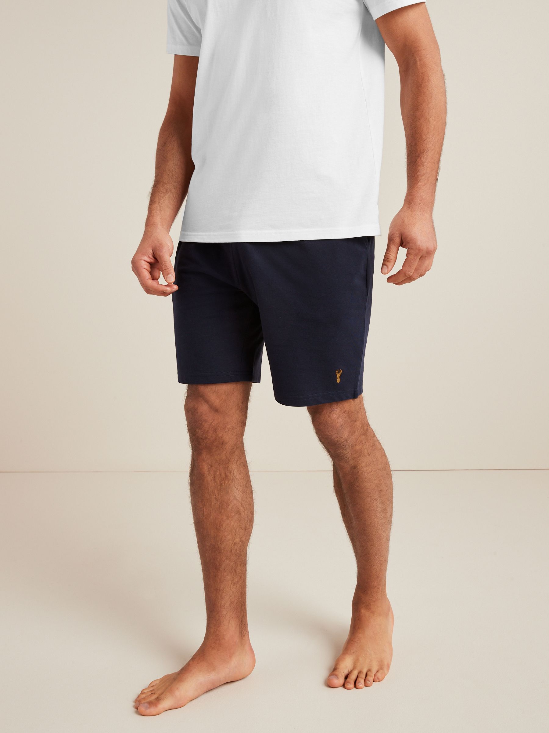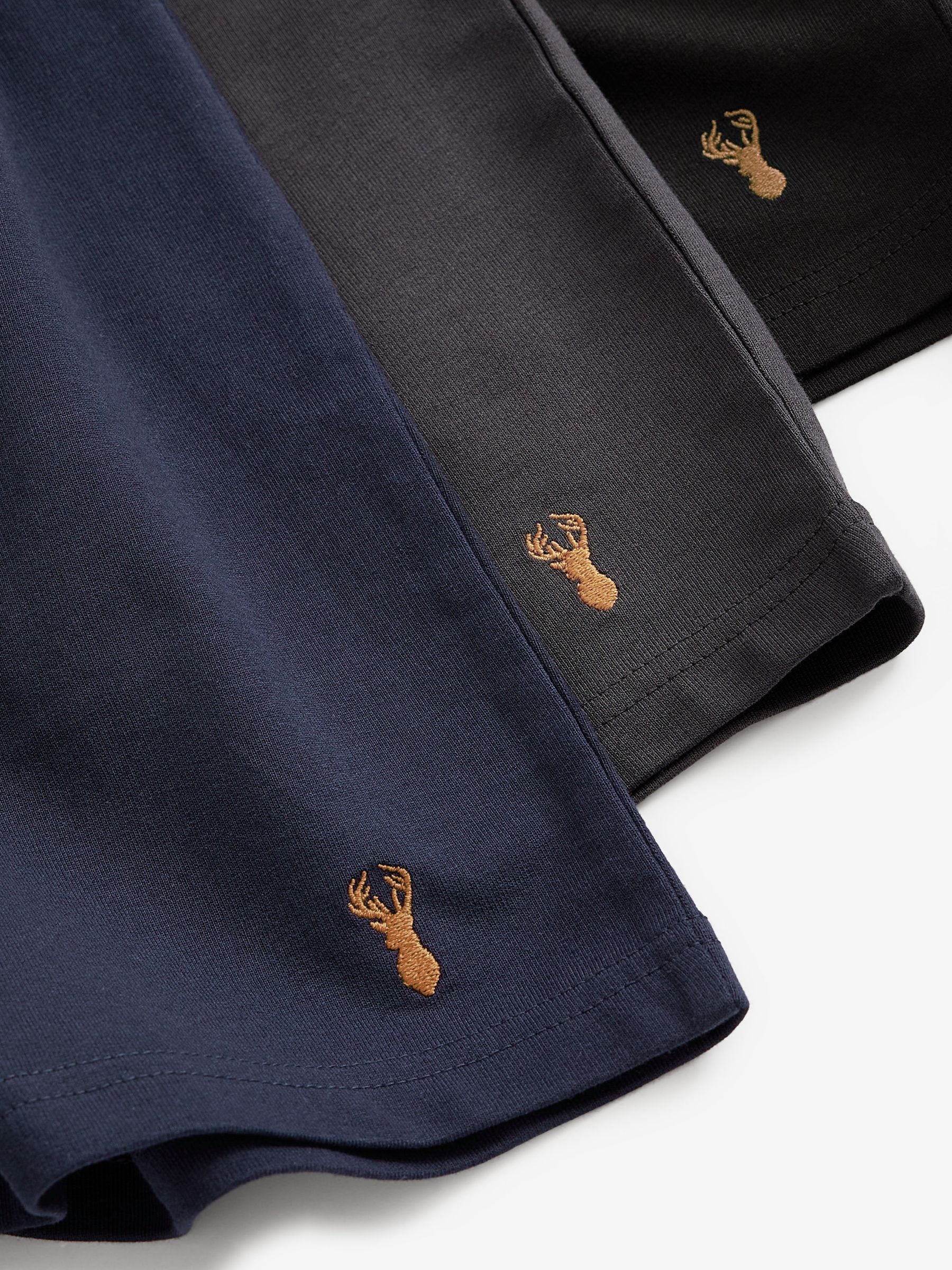 A comfortable and stylish option for your summer wardrobe, our 3 pack of navy blue/grey/black lightweight shorts are the best addition to your warm weather rotation.Made from pure cotton a breathable and lightweight feel, you’ll be reaching for them on repeat. So whether you’re off to the gym, out on a walk or lounging around the home these shorts are a comfy must-have. Pack of 3 Lightweight cotton fabric Stag embroidery with pockets Machine washable. 3 x Shorts 100% Cotton. Warning: Keep away from fire and flames.