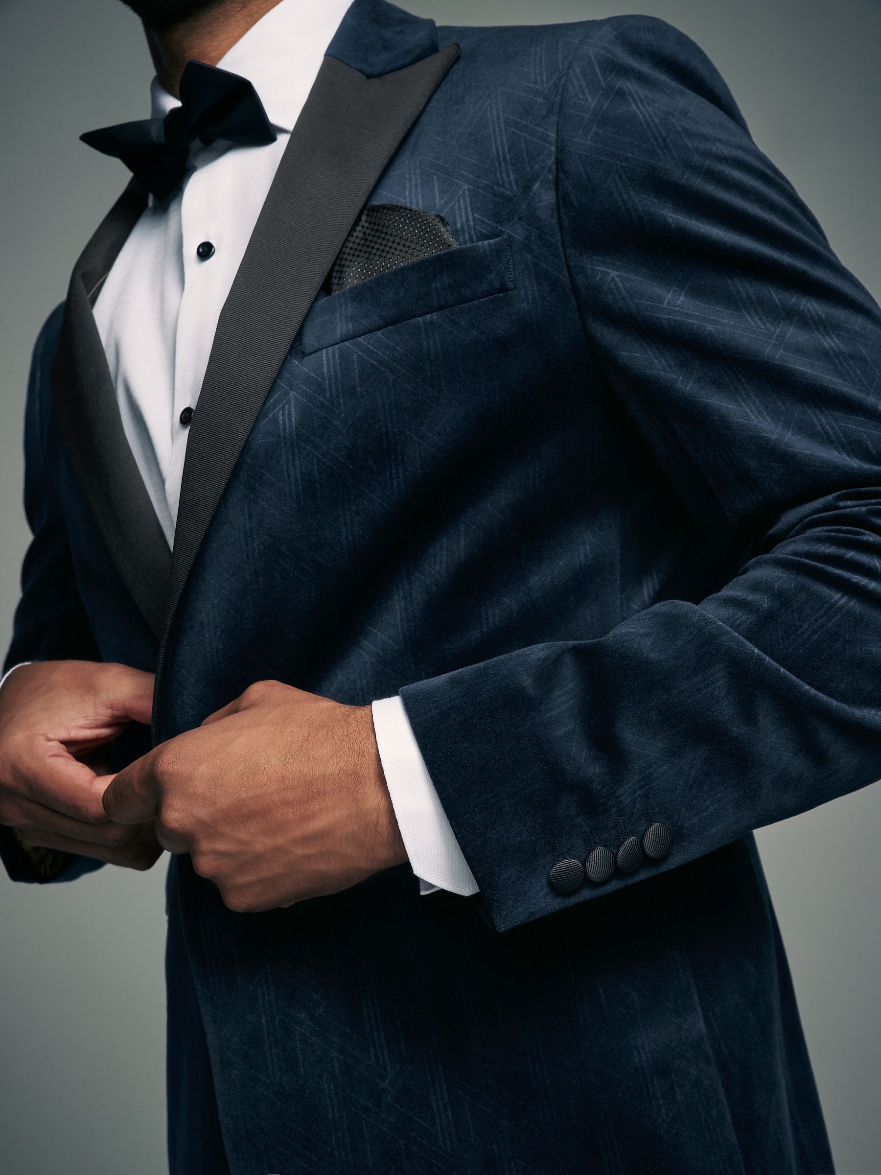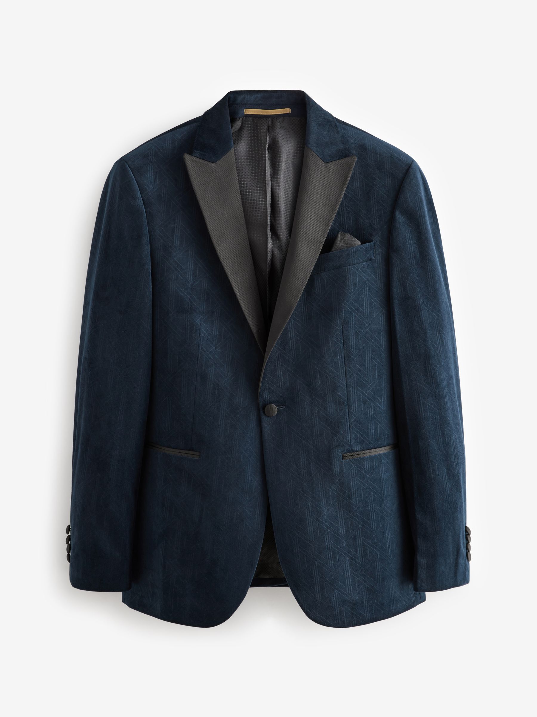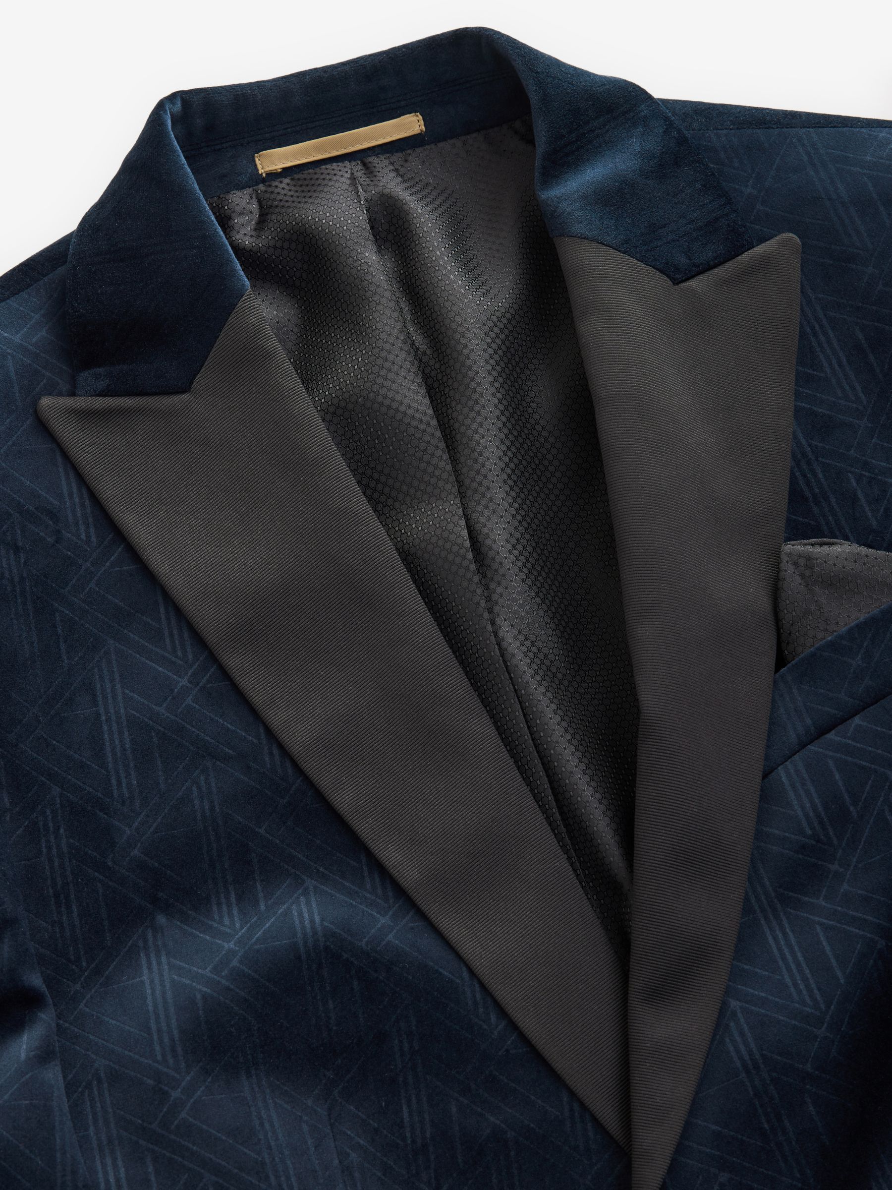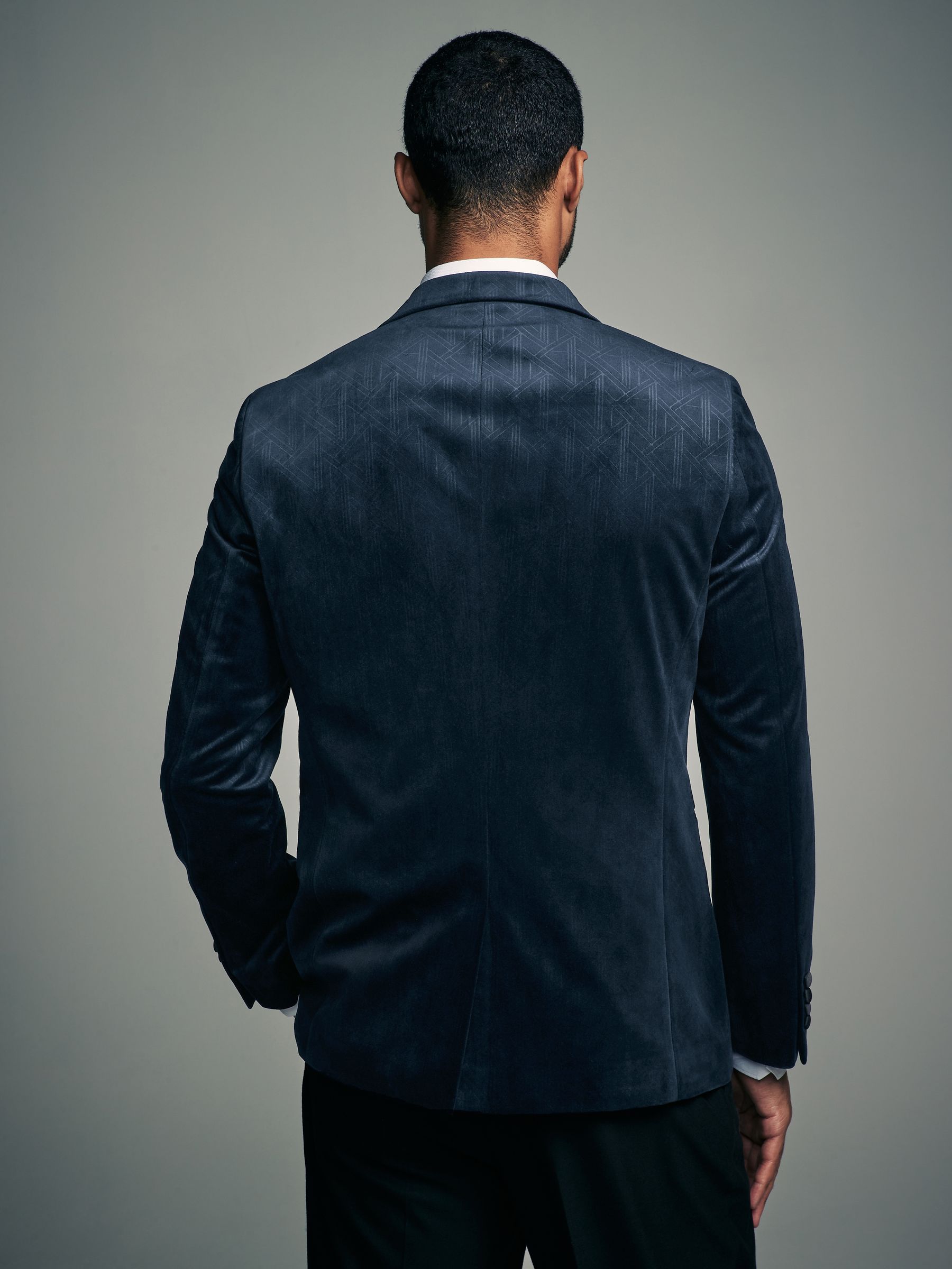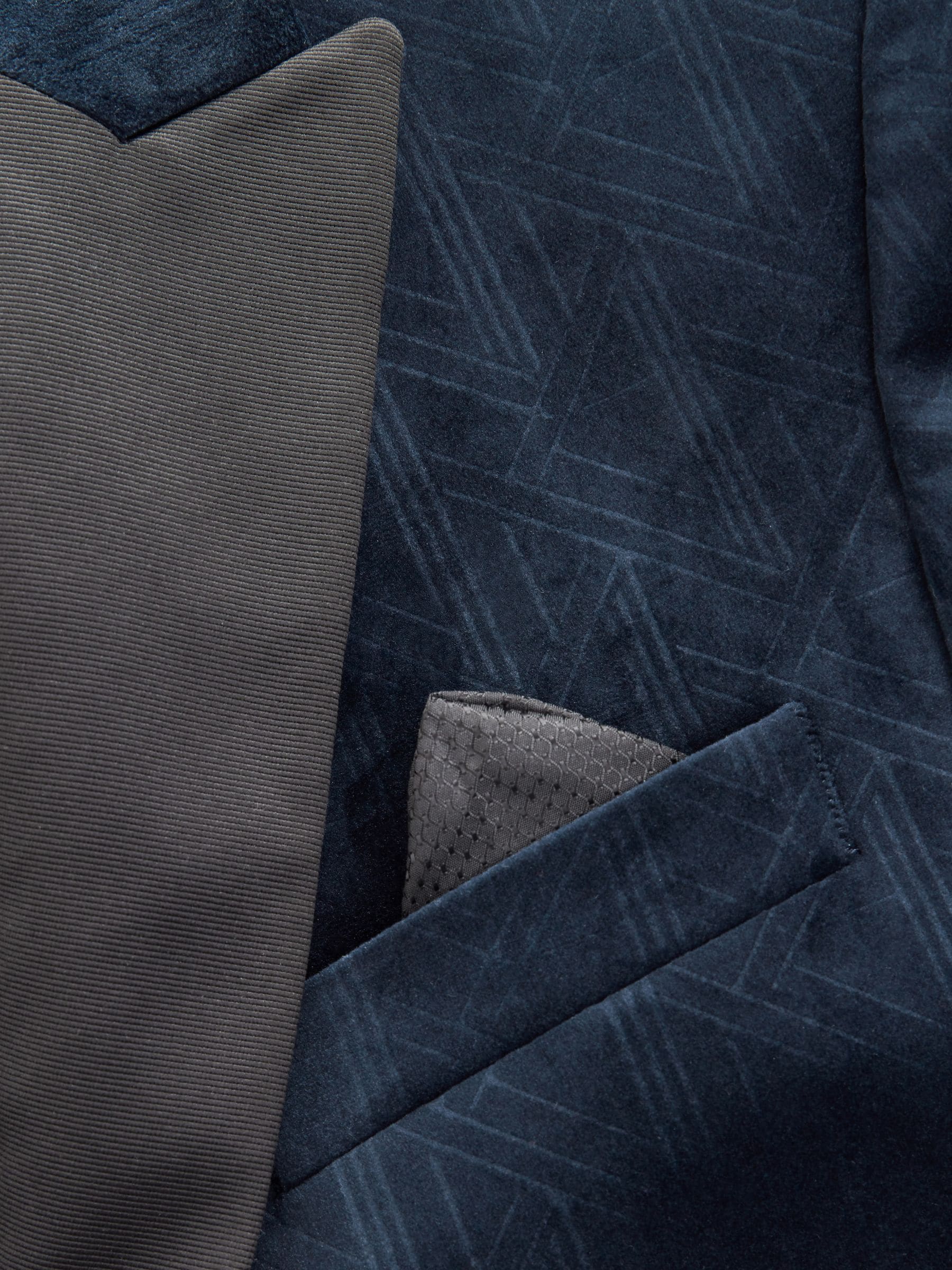This textured slim fit velvet blazer features a geometric all-over pattern with contrasting black satin lapels, finished with a single-breasted button-fastened construction. Ideal for Christmas parties and formal dinners. Slim fit Geometric pattern Satin lapels Single breasted Button fastening Dry clean only. Main 100% Recycled polyester. Lining 100% Polyester.