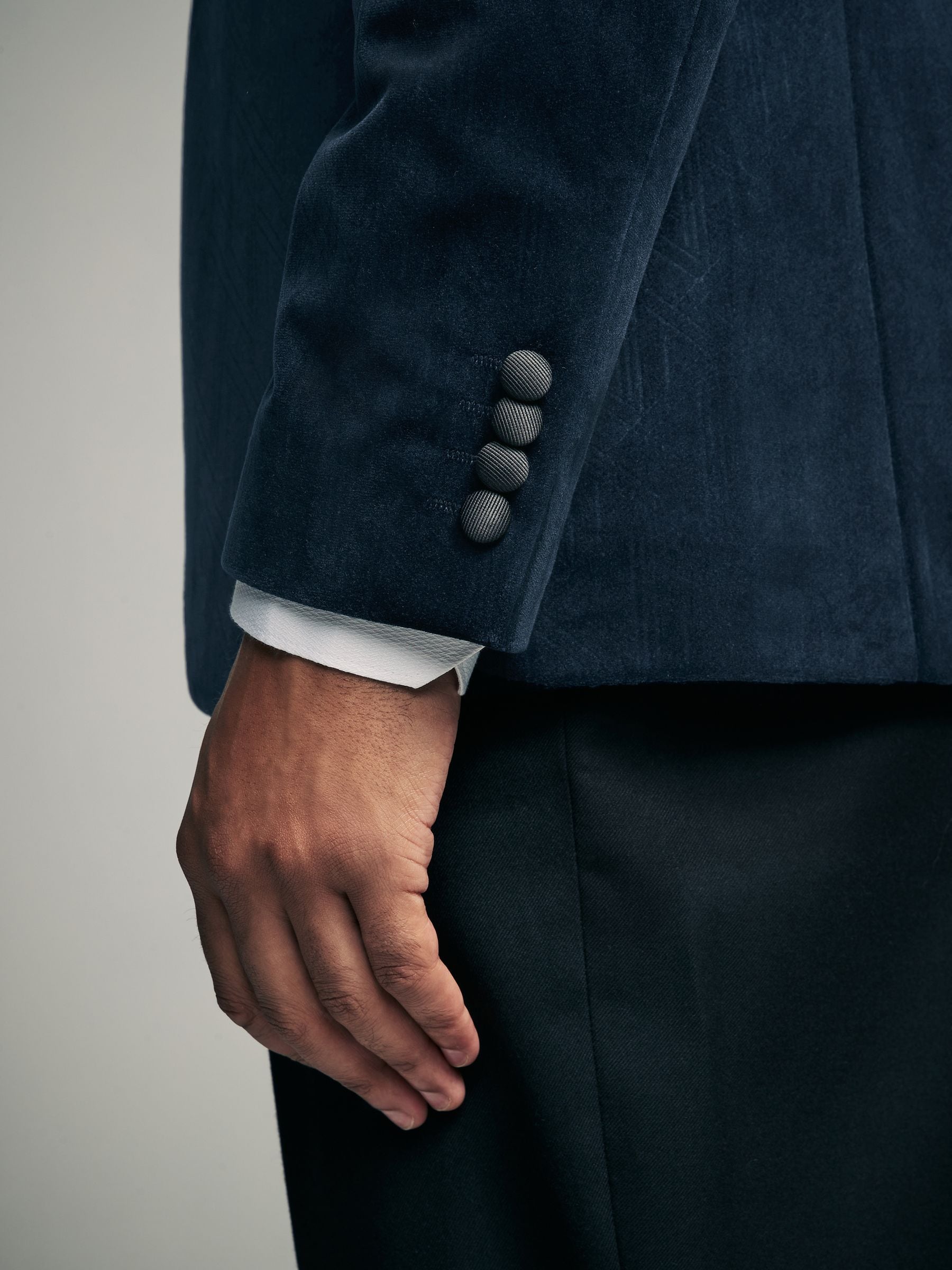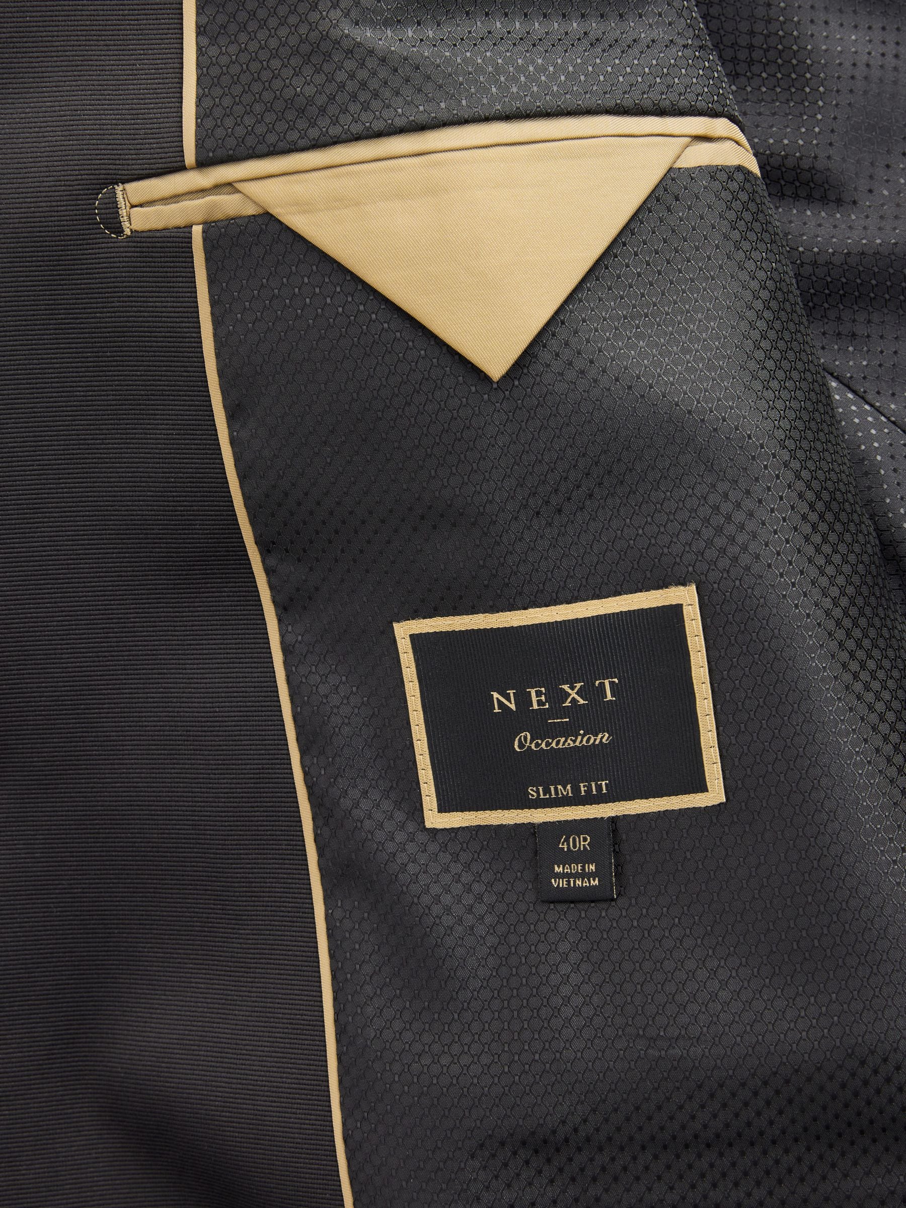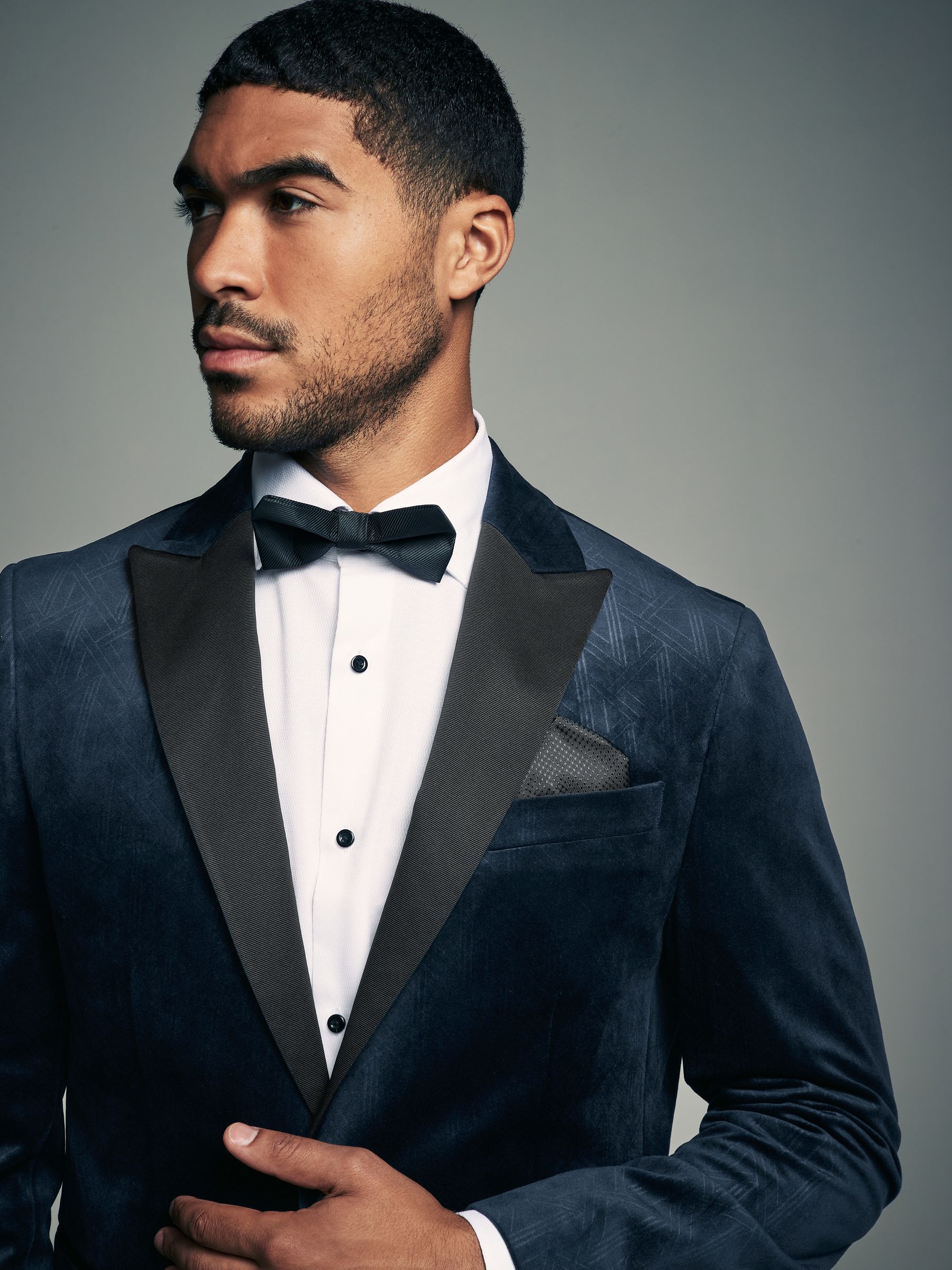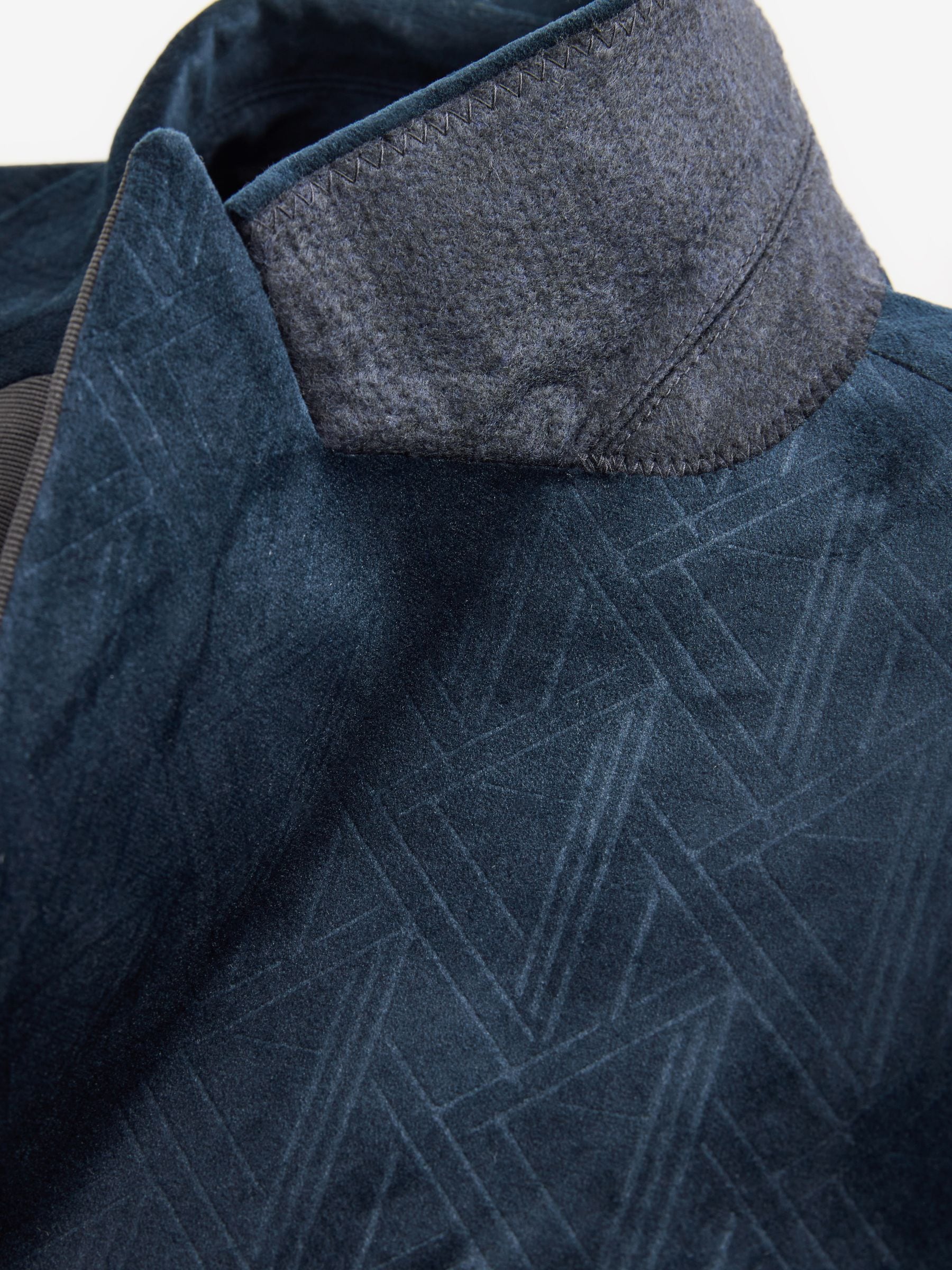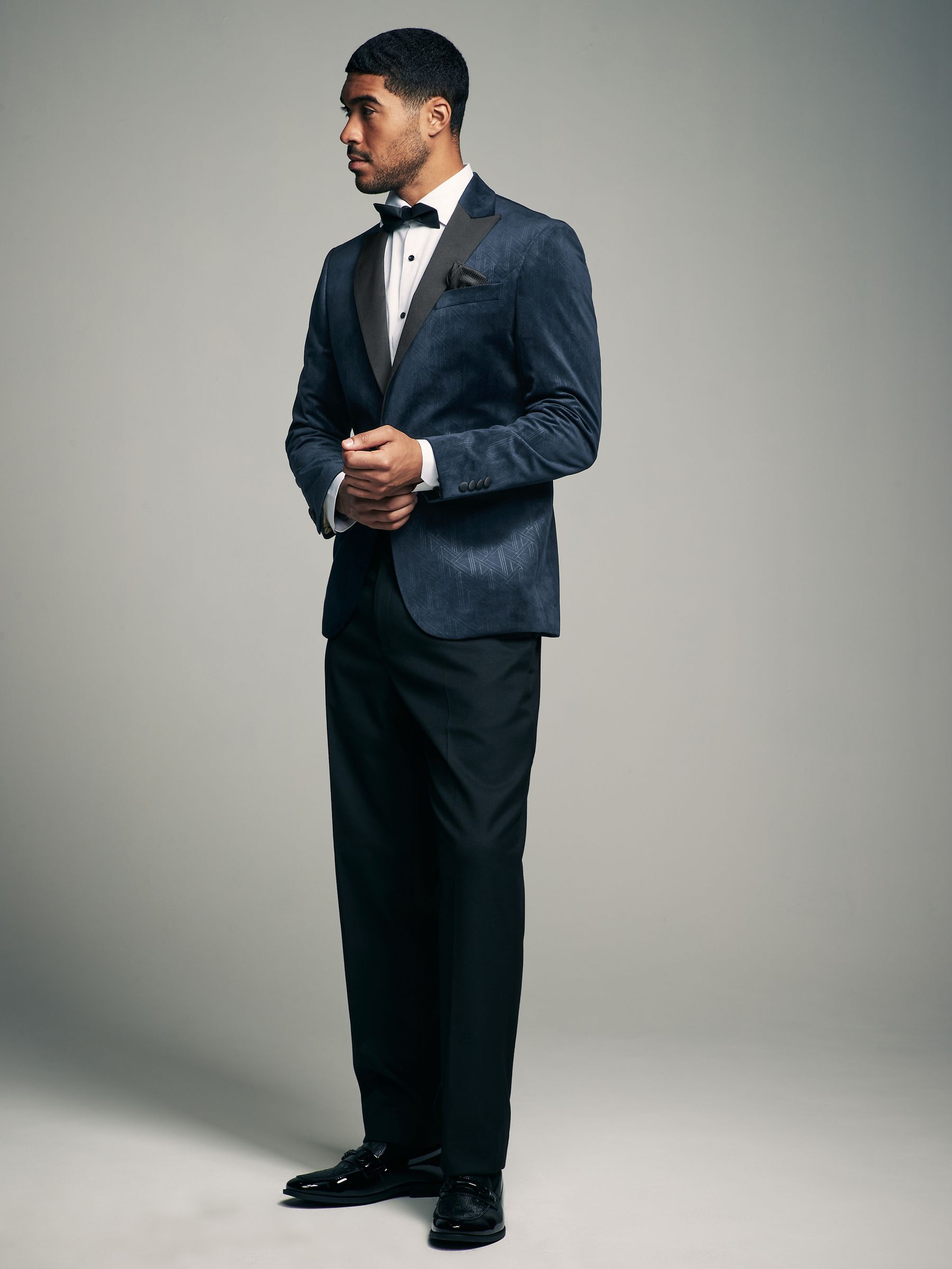 This textured slim fit velvet blazer features a geometric all-over pattern with contrasting black satin lapels, finished with a single-breasted button-fastened construction. Ideal for Christmas parties and formal dinners. Slim fit Geometric pattern Satin lapels Single breasted Button fastening Dry clean only. Main 100% Recycled polyester. Lining 100% Polyester.